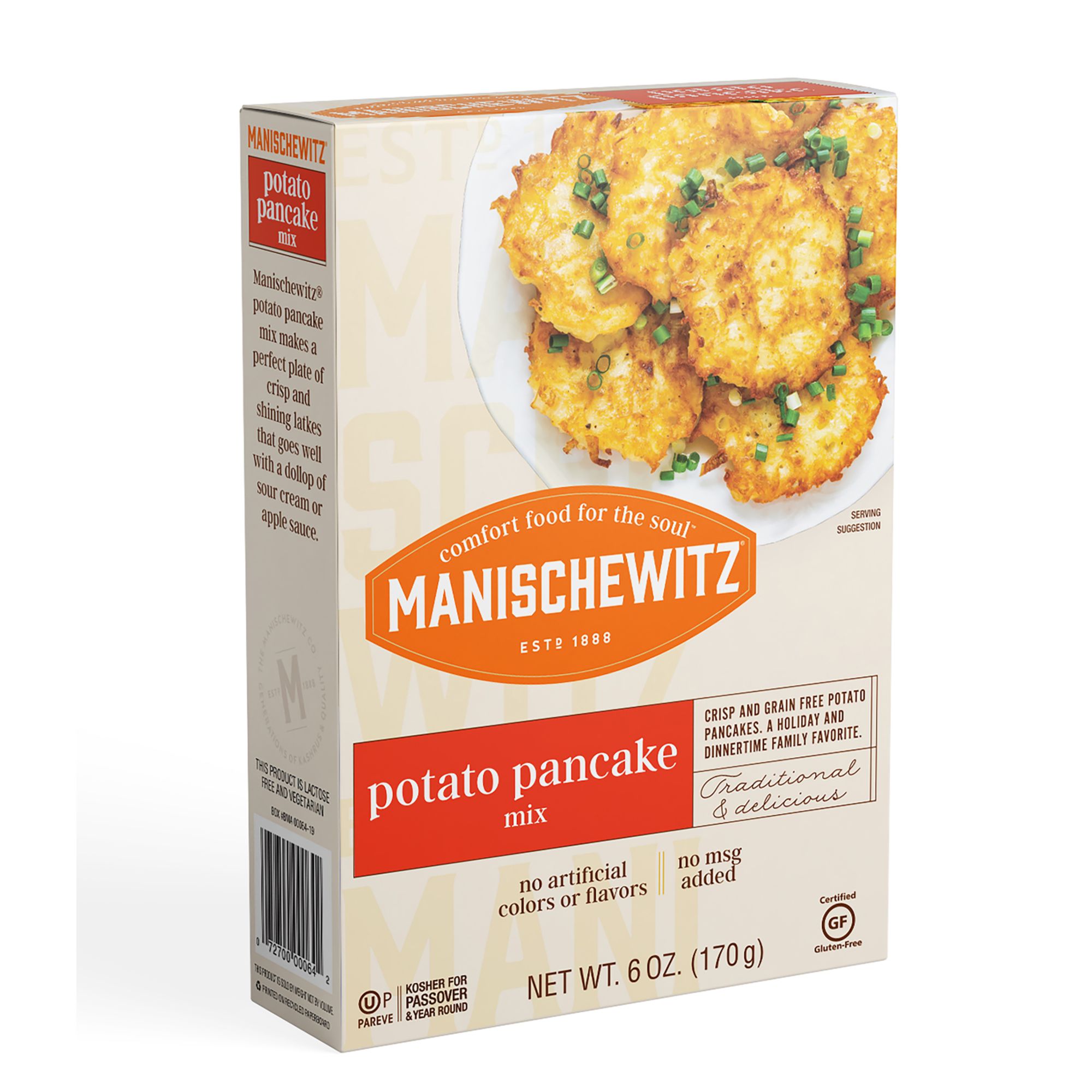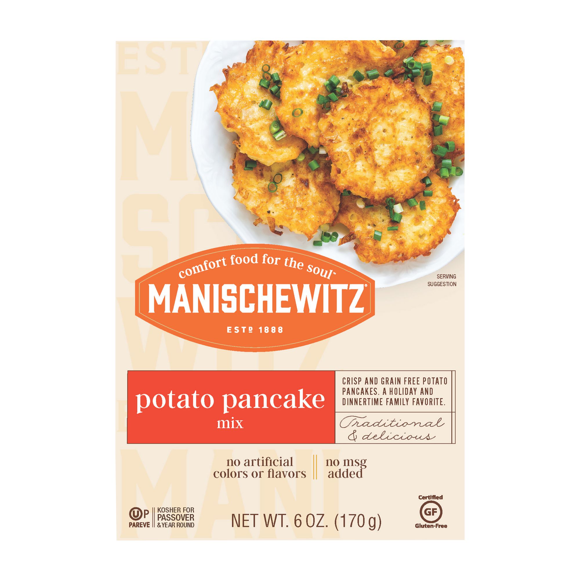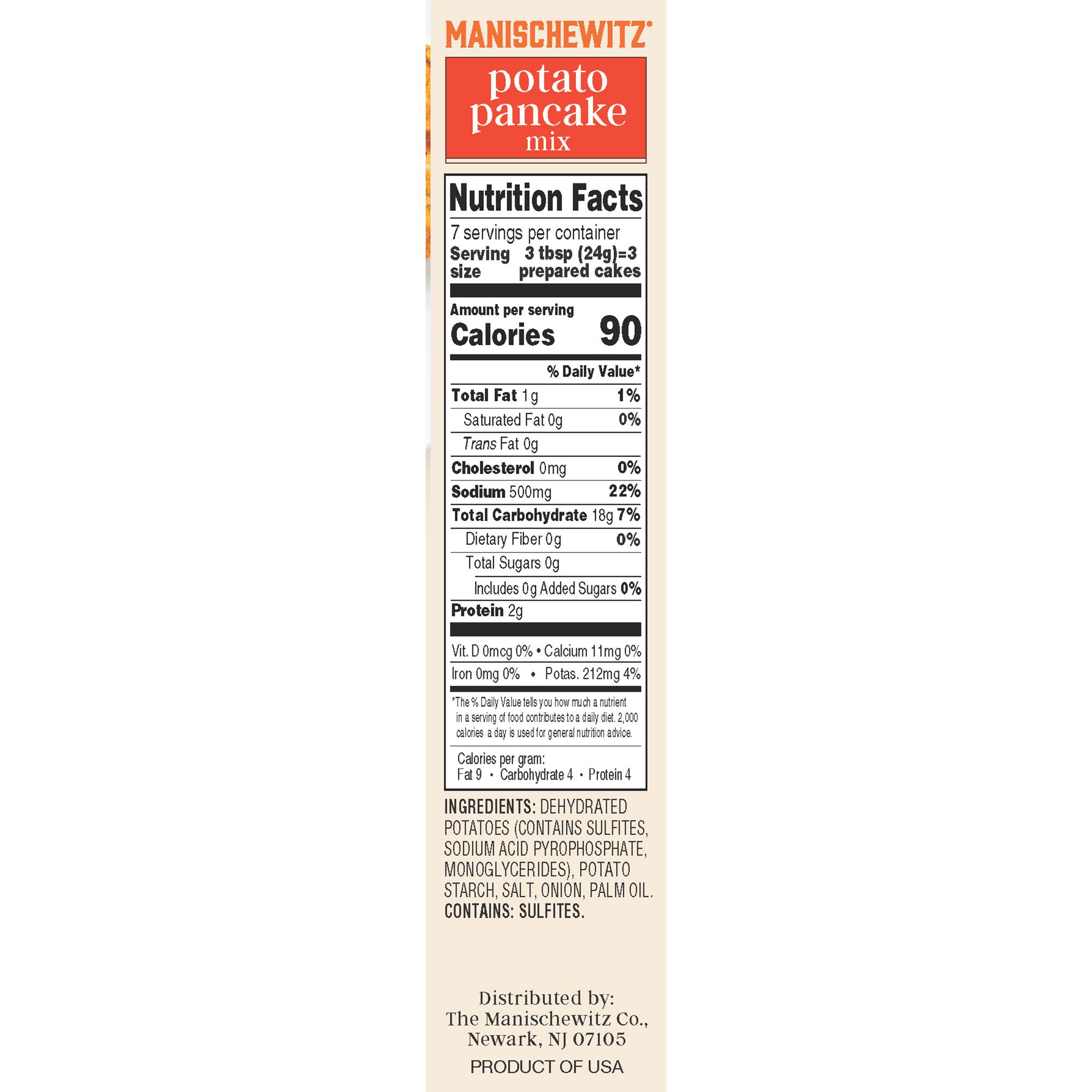 Manischewitz Potato Pancake Mix is an authentic traditional style potato latke. You can have your potato pancakes the way Bubby used to make them. These potato pancakes are better for you - gluten free, no MSG, no artificial flavors or colors. Easy to prepare with a detailed recipe and easy to follow instructions included on the package. Enjoy these crisp and delicious pancakes right out of the pan, top with sour cream or applesauce for a delicious extra.