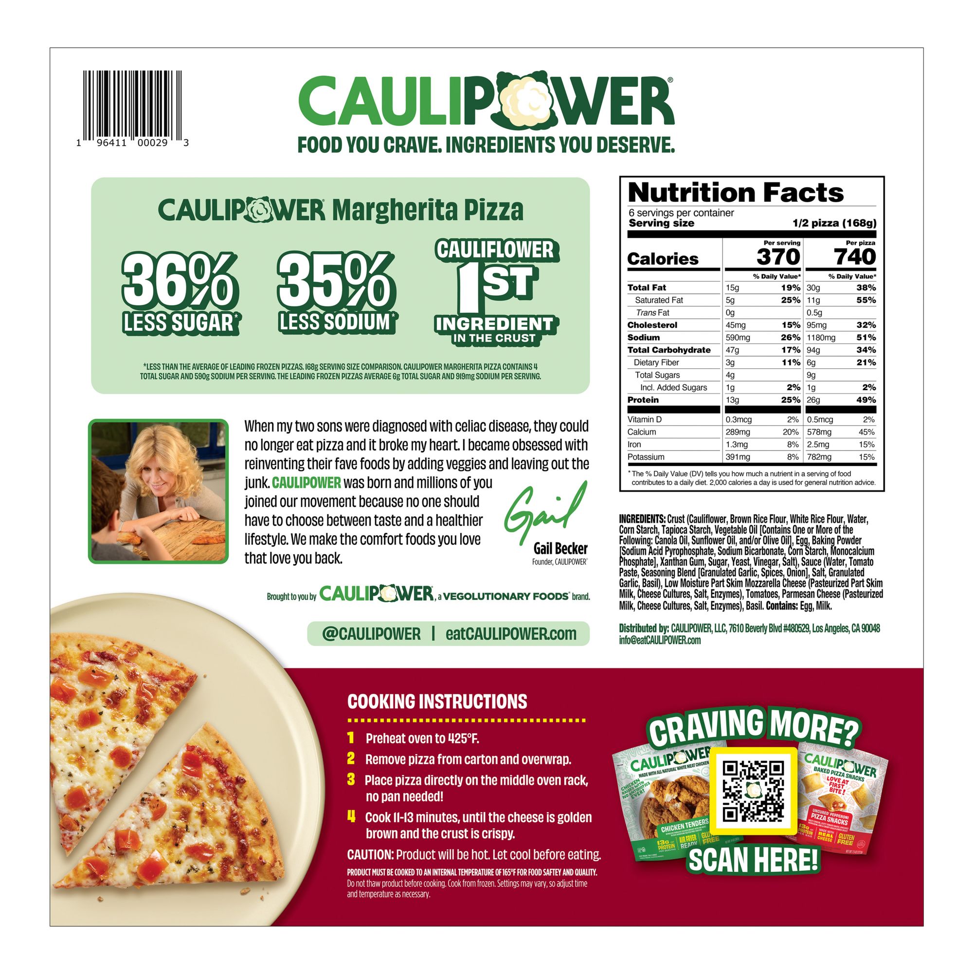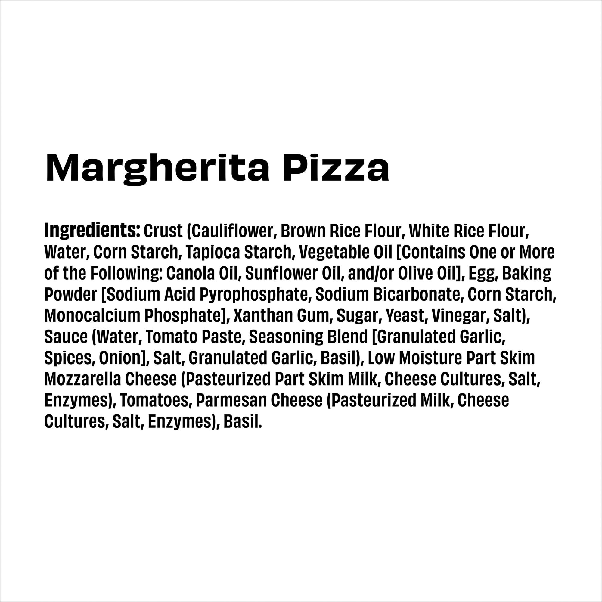 Ingredients: Crust (Cauliflower, Brown Rice Flour, White Rice Flour, Water, Corn Starch, Tapioca Starch, Vegetable Oil [Contains One Or More Of The Following: Canola Oil, Sunflower Oil, and/or Olive Oil], Egg, Baking Powder [Sodium Acid Pyrophosphate, Sodium Bicarbonate, Corn Starch, Monocalcium Phosphate], Xanthan Gum, Sugar, Yeast, Vinegar, Salt), Sauce (Water, Tomato Paste, Seasoning Blend [Granulated Garlic, Spices, Onion], Salt, Granulated Garlic, Basil), Low Moisture Part Skim Mozzarella Cheese (Pasteurized Part Skim Milk, Cheese Cultures, Salt, Enzymes), Tomatoes, Parmesan Cheese (Pasteurized Milk, Cheese Cultures, Salt, Enzymes), Basil. Contains: Egg, Milk