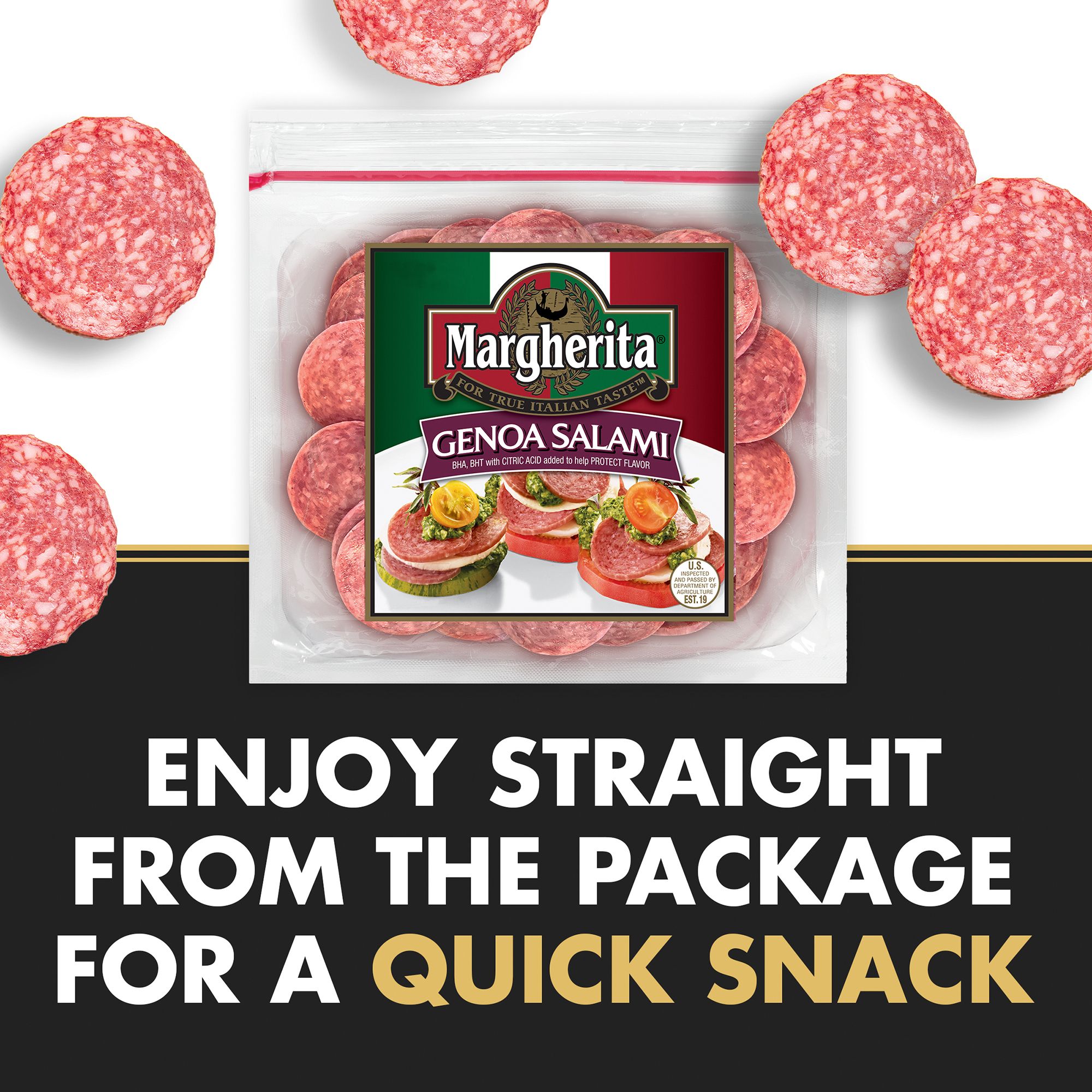 Margherita Pre-Sliced Deli Genoa Salami comes ready to eat in small, versatile slices for quick snacks or additions to your favorite recipes. Made from the finest cuts of pork and beef, this pre sliced salami deli meat delivers authentic Italian taste to your meals and snacks. This Italian sliced Genoa salami is smoked to perfection for a natural, robust smokiness that everyone can enjoy. Margherita Genoa sliced salami is cut into small, consistently thick pieces that work in many different dishes. Add sliced Italian salami to your favorite Italian sub sandwich to boost flavor, or chop it up and add to breakfast frittatas for an Italian twist on a morning classic. Eat them straight from the package for a quick snack, or stack salami and cheese on crackers with veggies or spreads for quick party appetizers. The resealable pouch keeps the Genoa salami slices fresh in your refrigerator after you open the package. For true Italian taste, choose Margherita.