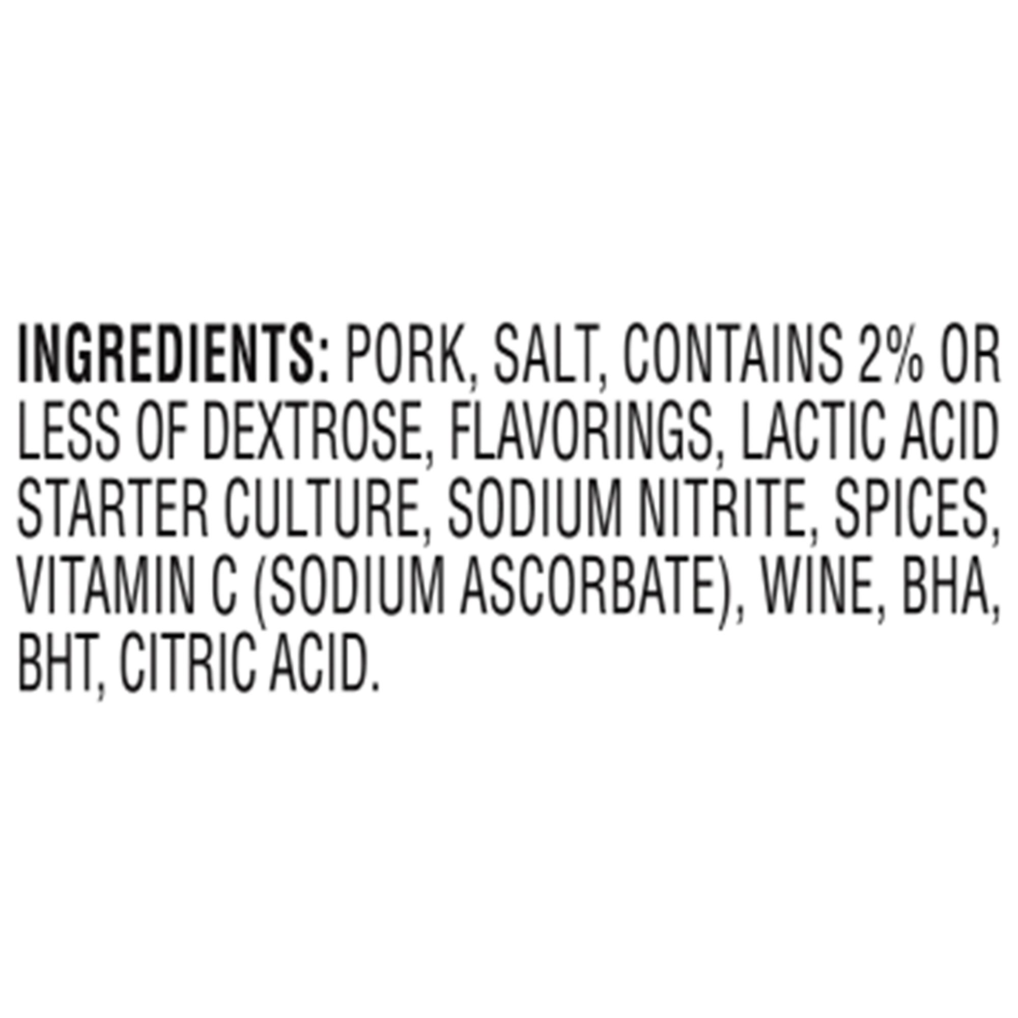 Ingredients: Pork, Salt, Contains 2% Or Less Of Dextrose, Flavorings, Lactic Acid Starter Culture, Sodium Nitrite, Spices, Vitamin C (Sodium Ascorbate), Wine, Bha, Bht, Citric Acid
