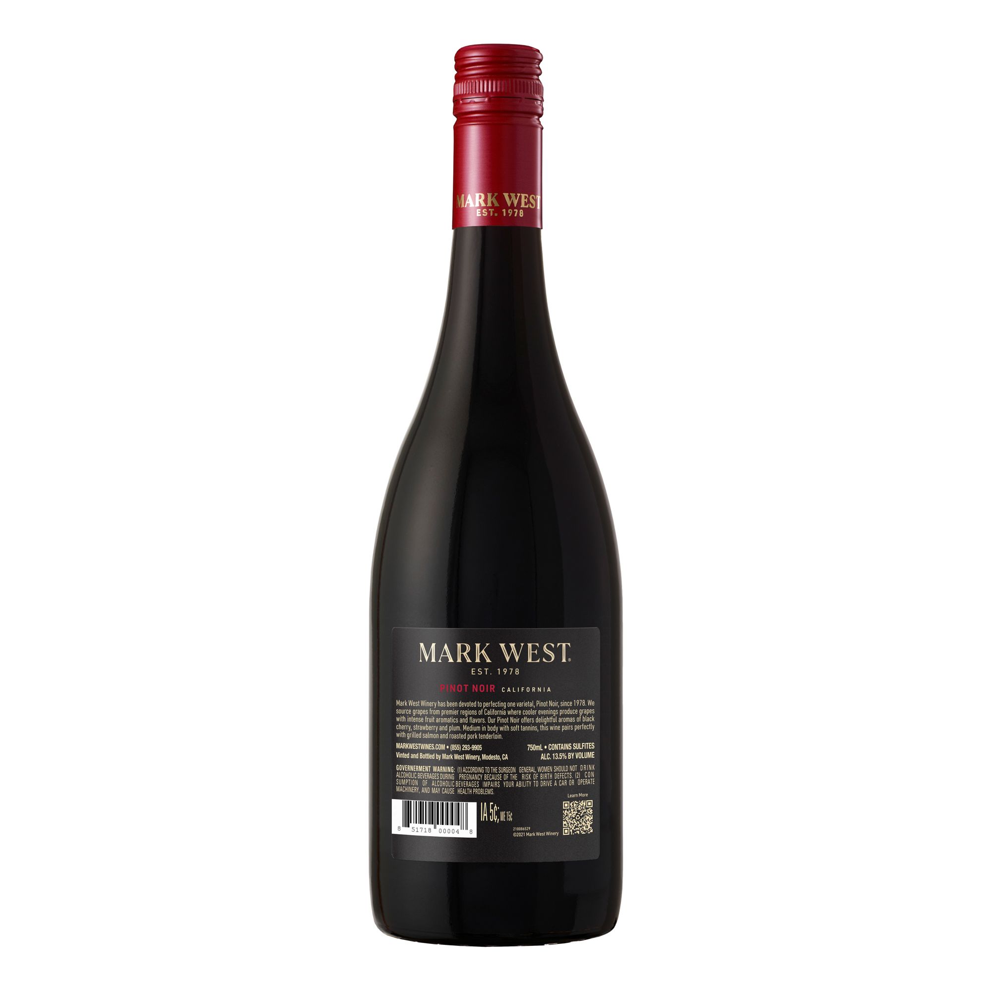 Named after a region in Sonoma, California known for producing the best Pinot Noir, Mark West has focused on perfecting Pinot Noir for over 40 years. This medium-bodied red wine has notes of strawberry plum and black cherry. The wine has a gentle, smooth finish with hints of dried cherries and brown spice, making it perfect for sipping on its own or mixing in cocktail recipes. Pair Mark West Pinot Noir with grilled chicken, pulled pork sliders, jalapeno poppers or spicy guacamole. Break out this wine bottle at your next backyard barbecue or summer picnic, or give it as a wine gift for a holiday or birthday. Each 750 mL bottle contains about 6 glasses of wine with 13.5% alcohol by volume.