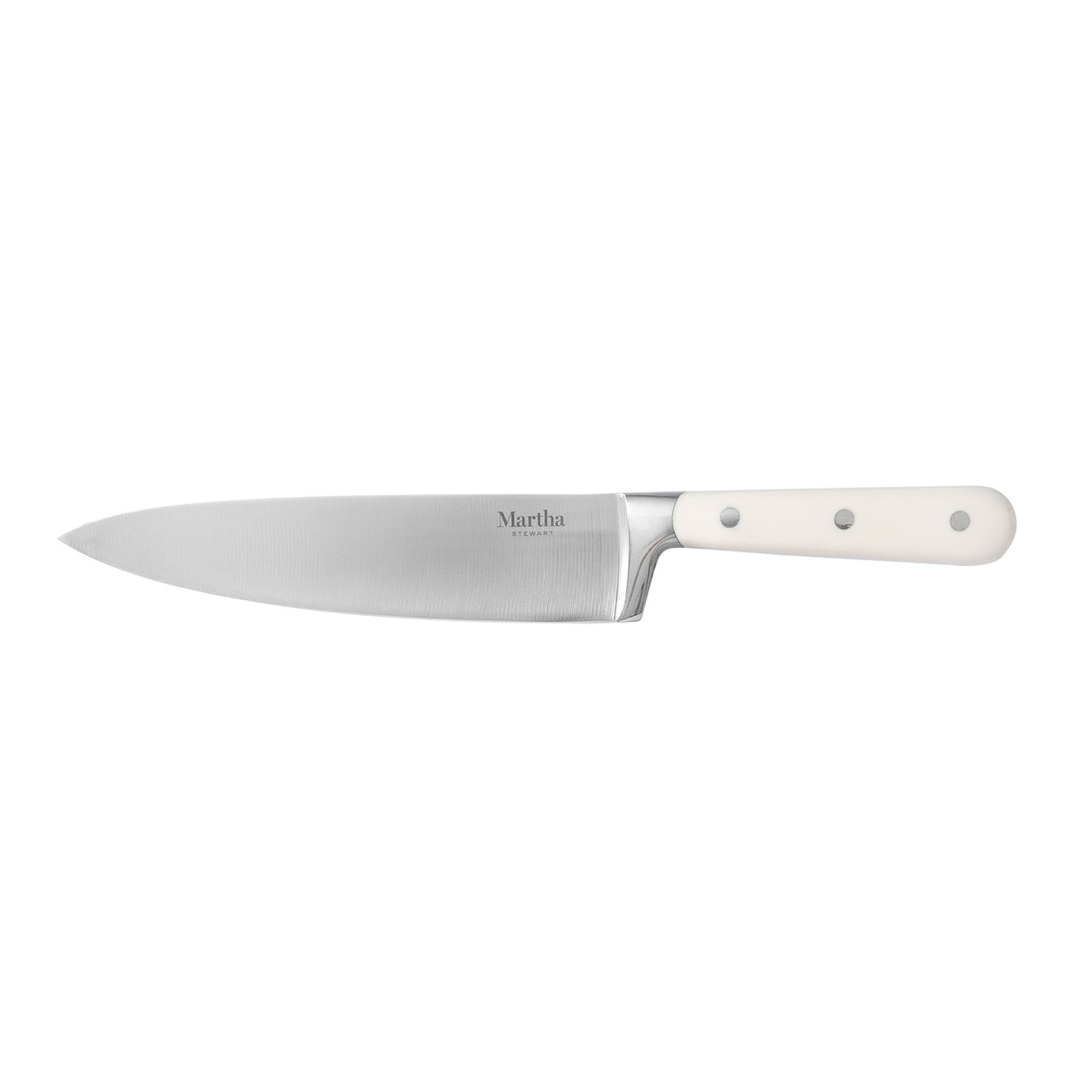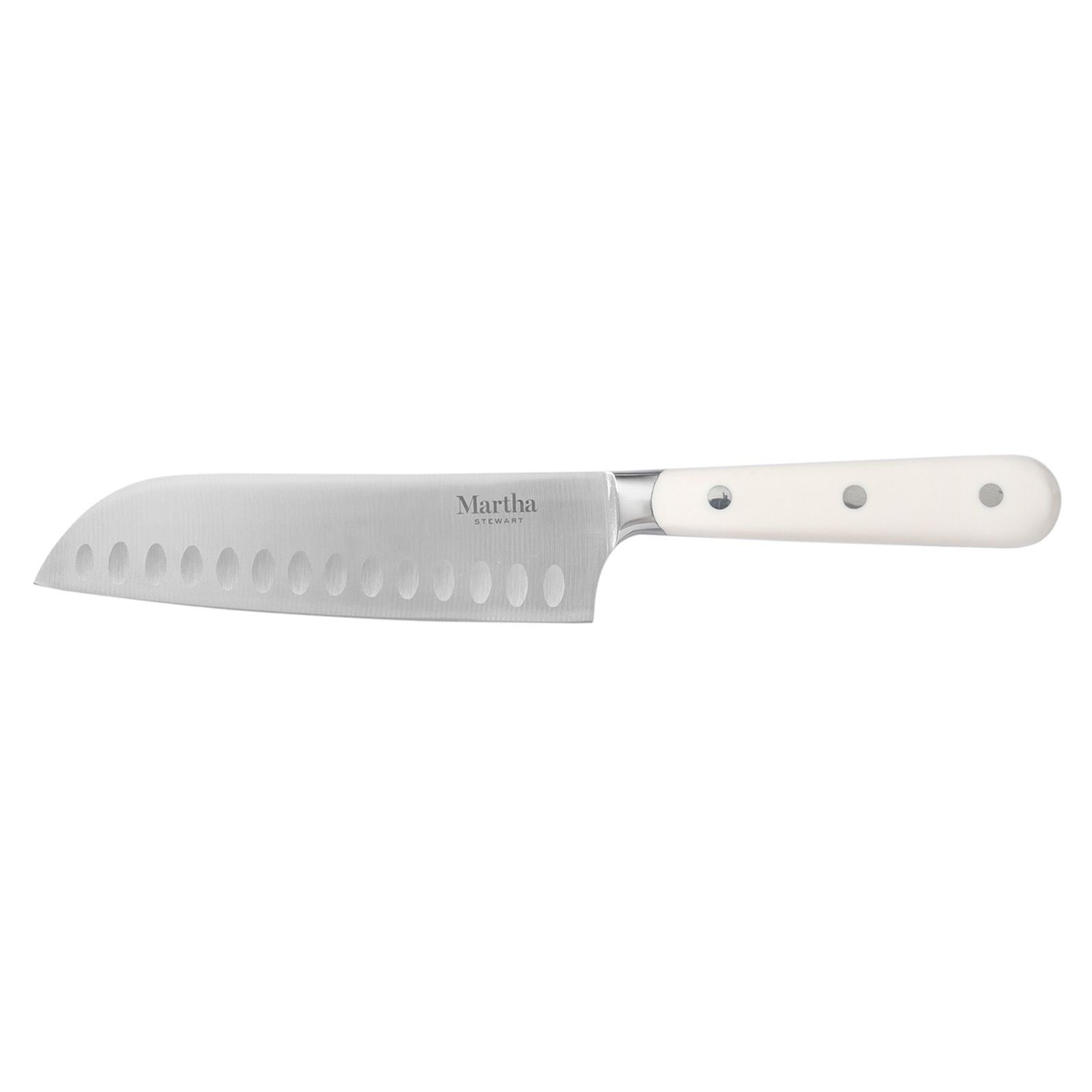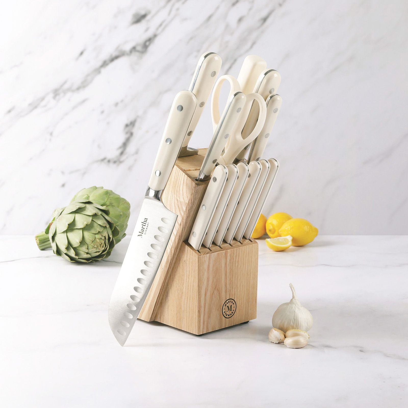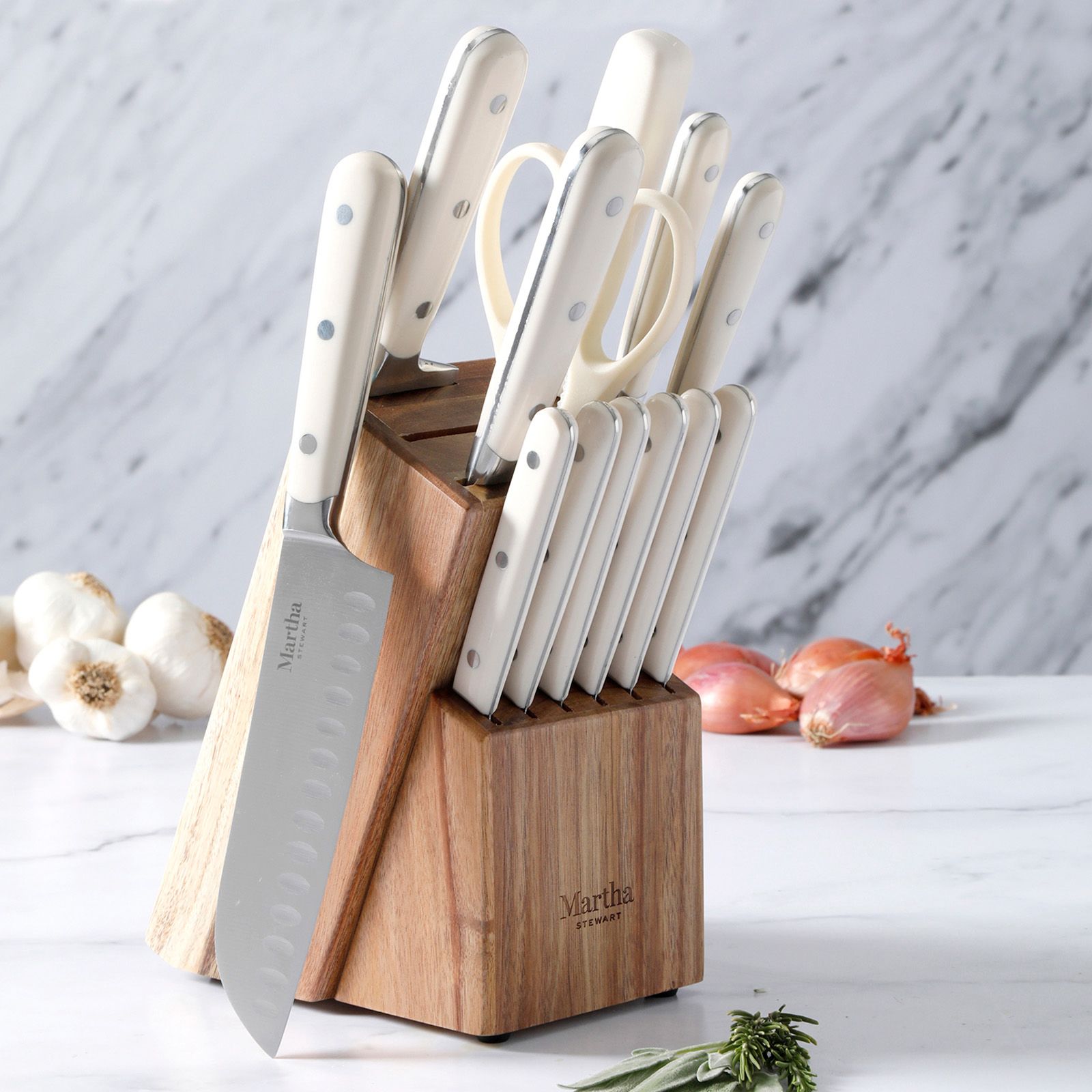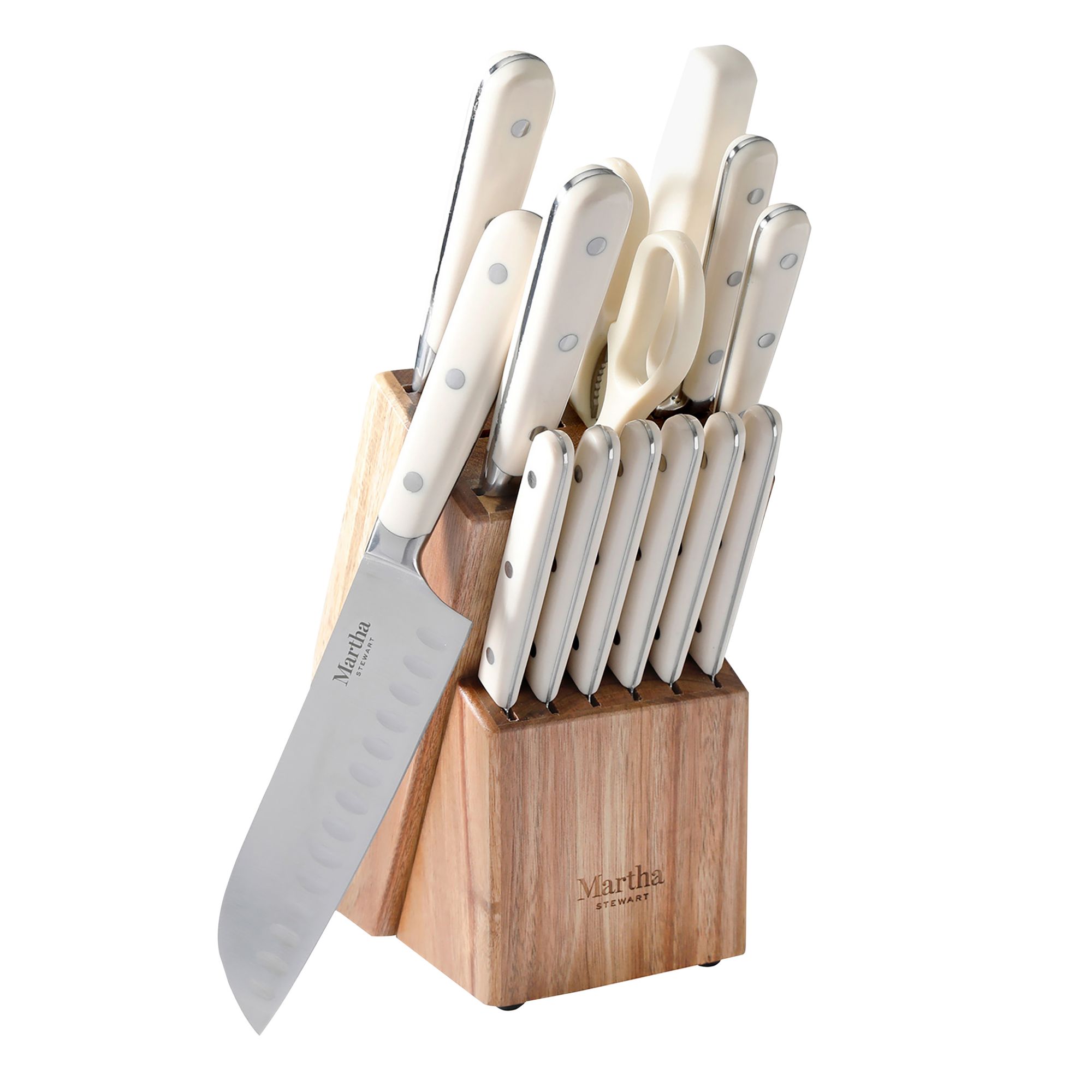 The Martha Stewart 14 pc. Stainless Steel Knife Set meets all the requirements of any home cook’s need for food prep. This set includes one 8" chef’s knife, one 7" santoku knife, one 8" bread knife, one 5" utility knife, one 3.5" paring knife, six 4.5" steak knives, one pair of kitchen shears, one sharpening steel, and one Acacia Wood knife block. Made from forged stainless steel with full tang construction, each knife offers sharpness to slice, mince, chop, dice, and more with ease and precision. Food prep is made easy with these high-carbon stainless steel knives that feature ergonomic, triple-riveted handles for strength and durability. The comfortable ABS handles offer balance, control, and a confident grip to tackle any cutting and slicing task every day. Crafted from smooth-grained acacia wood, the sturdy wood block is a rustic accent piece to any kitchen countertop, proving easy access and safe storage to these trusty kitchen tools. Each knife has a thoughtfully-crafted design to offer style and performance, elevating your kitchen and inspiring home chefs everywhere. Capturing Martha Stewart's love for beauty and versatility, this knife set will help you learn and master her signature dishes and turn them into family favorites.
