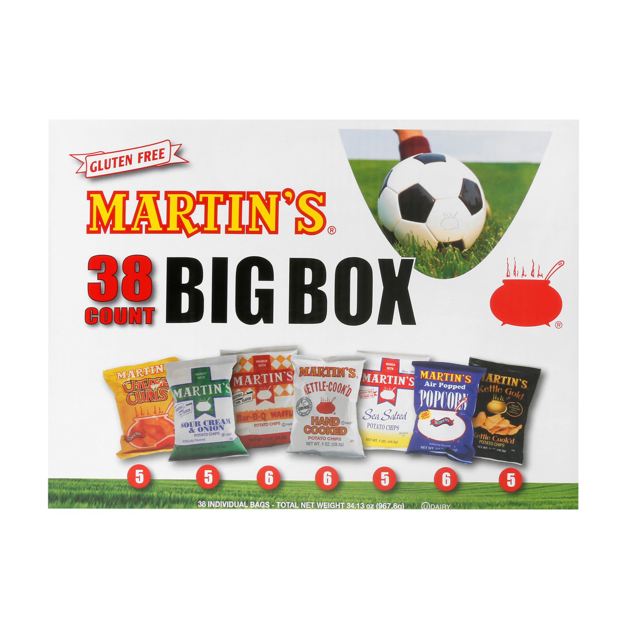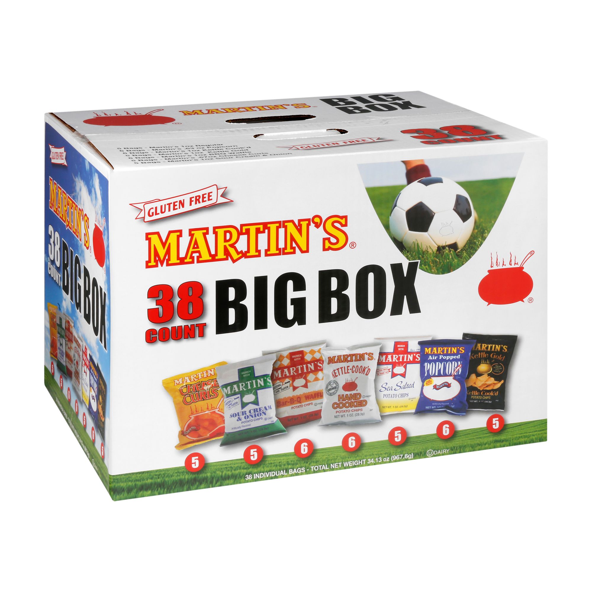 Martin's Big Box Variety Snacks is the perfect combination of single serve salty snacks. It contains a variety of potato chips, popcorn and cheese curls in an easy to carry handled box.