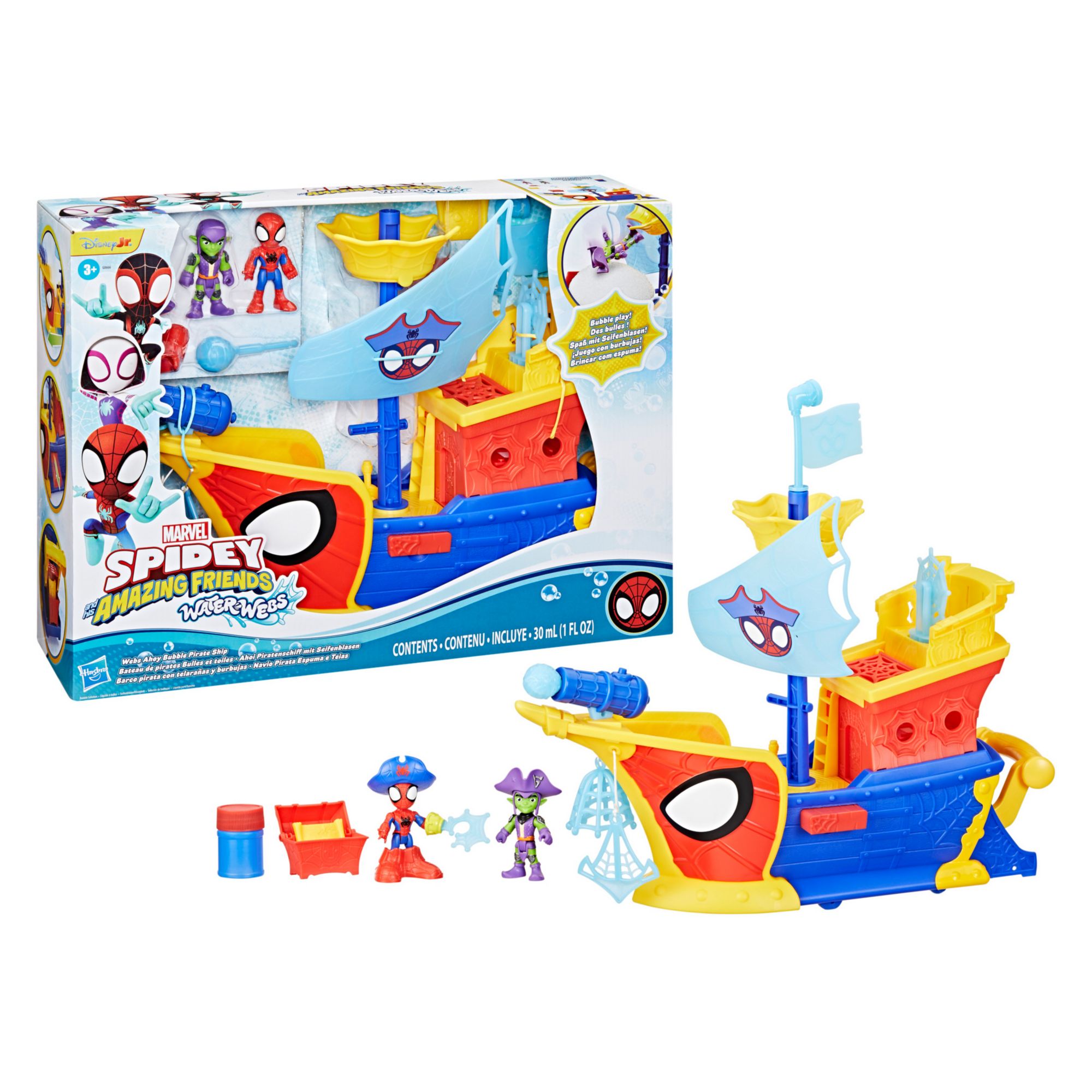 Kids can imagine swashbuckling adventure with Spidey and his Amazing Friends Water-Webs Webs Ahoy Bubble Pirate Ship toy. Playset features include a bubble capture pit, spinning mast & crow’s nest, retractable plank, and more. Comes with poseable 3" (7.6 cm) Spidey and Green Goblin Super Hero figures with cool, detachable accessories, including two pirate hats, one pair of pirate boots, a treasure chest, a map, a bubble refill bottle with solution, and more. To clean the Webs Ahoy Bubble Pirate Ship, simply rinse and dry thoroughly after each use (see instructions for more details). Look for more Marvel action figures and vehicle toys to build an awesome collection. Spidey toys, such as figures and playsets, also make great gifts for kids ages three and up. Available characters include Miles “Spin” Morales, Ghost-Spider, Captain America: Steve Rogers, Black Panther, and Iron Man. (Each sold separately. Subject to availability.) Copyright Marvel. All trademarks and registered trademarks are the property of their respective owners. Hasbro and all related trademarks and logos are trademarks of Hasbro, Inc.