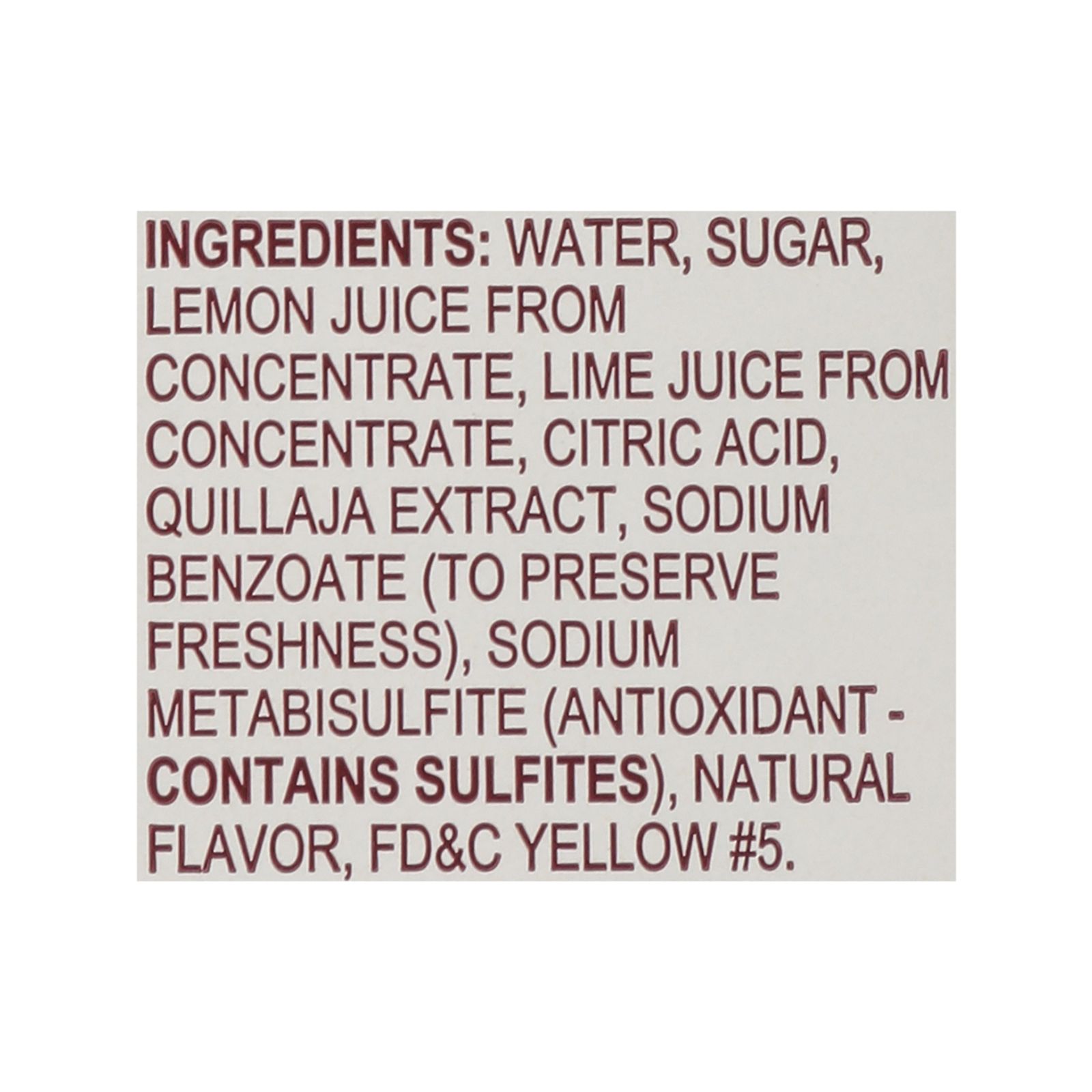 Ingredients: Water, Sugar, Lemon Juice from Concentrate, Lime Juice from Concentrate, Citric Acid, Quillaja Extract, Sodium Benzoate (to Preserve Freshness), Sodium Metabisulfite (Antioxidant Contains Sulfites), Natural Flavor, FD&C Yellow 5.