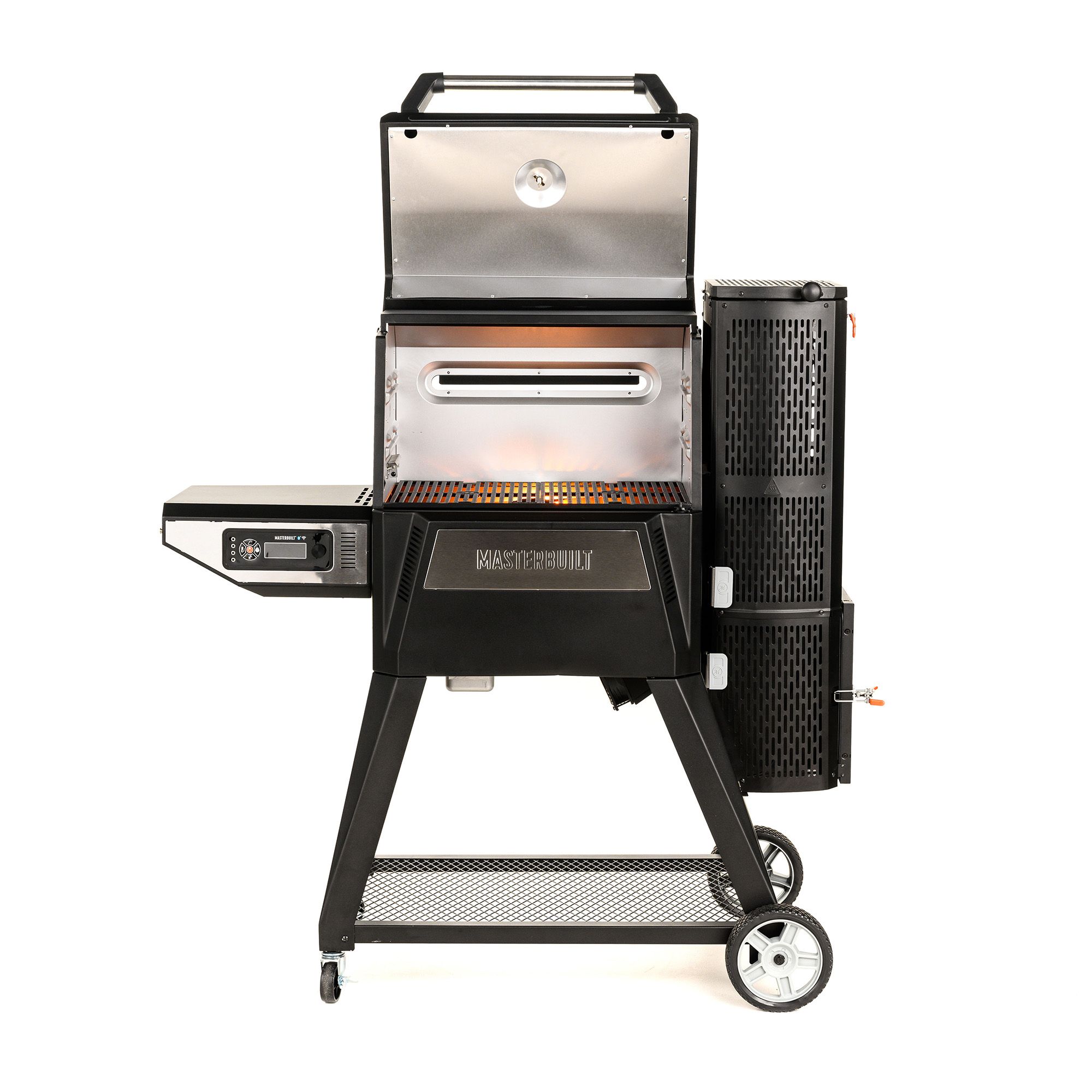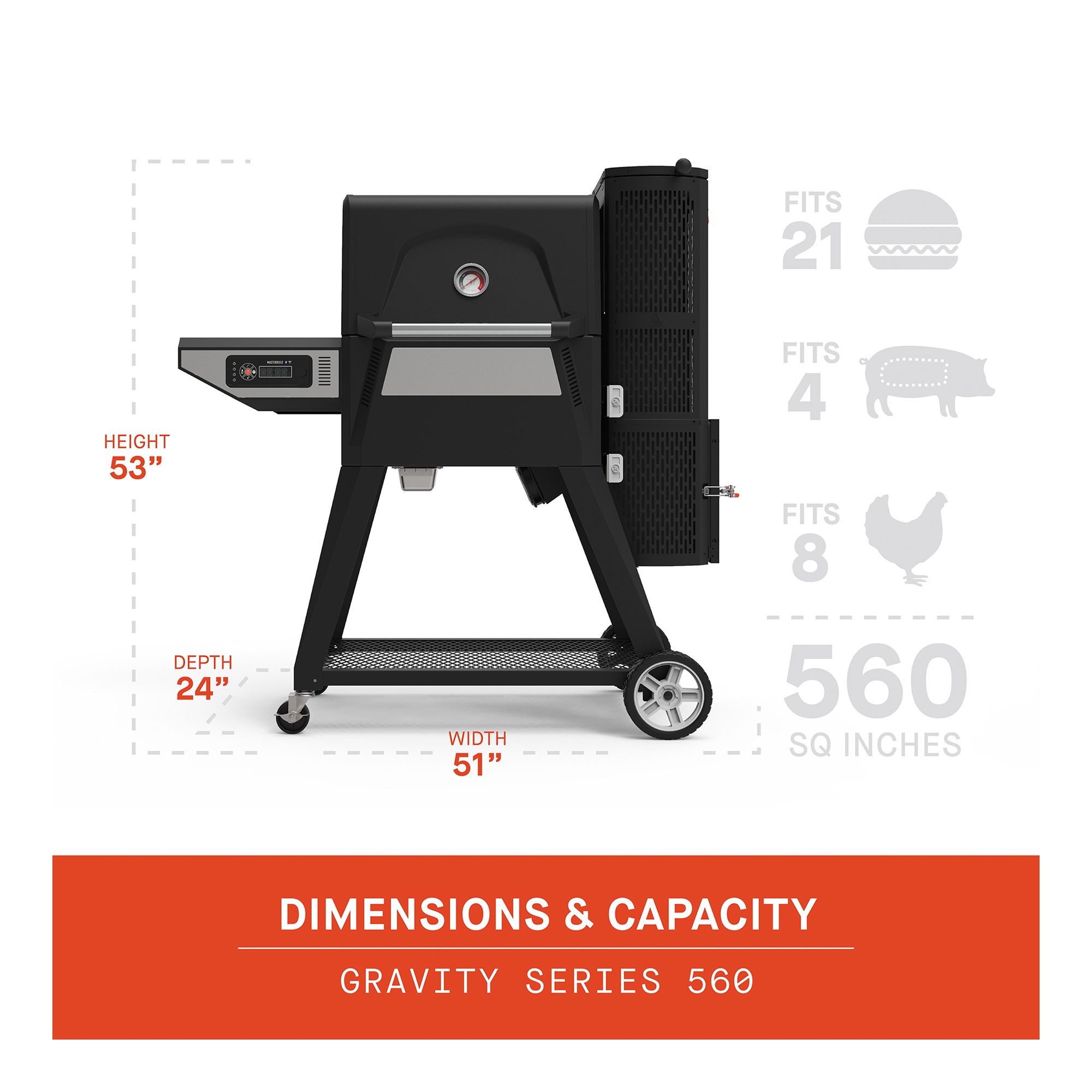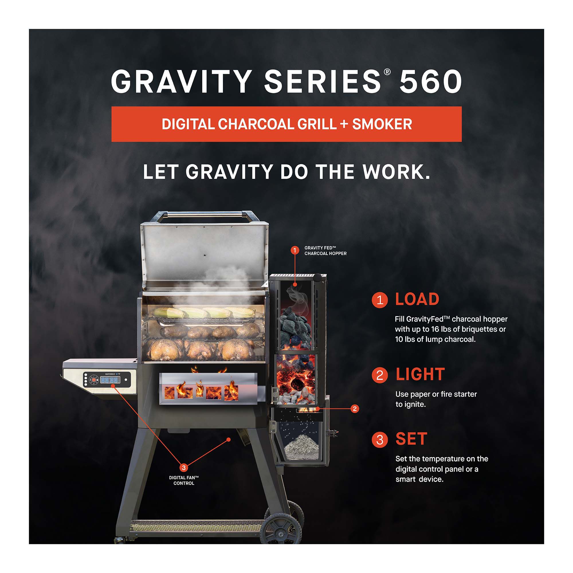 With the Gravity Series 560 Digital Charcoal Grill and Smoker by Masterbuilt, you can smoke, grill, sear, bake, roast and so much more. Set the temperature on the digital control panel or your smart device and the digitalfan maintains the desired cooking temperature. The gravityfed charcoal hopper holds up to 12 hours of charcoal and gravity ensures you have constant fuel to the fire. The reversible cast-iron grates are perfect for smoking or searing and in just 13 minutes this grill can reach 700 degrees. Master the art of charcoal grilling and smoking with Masterbuilt.