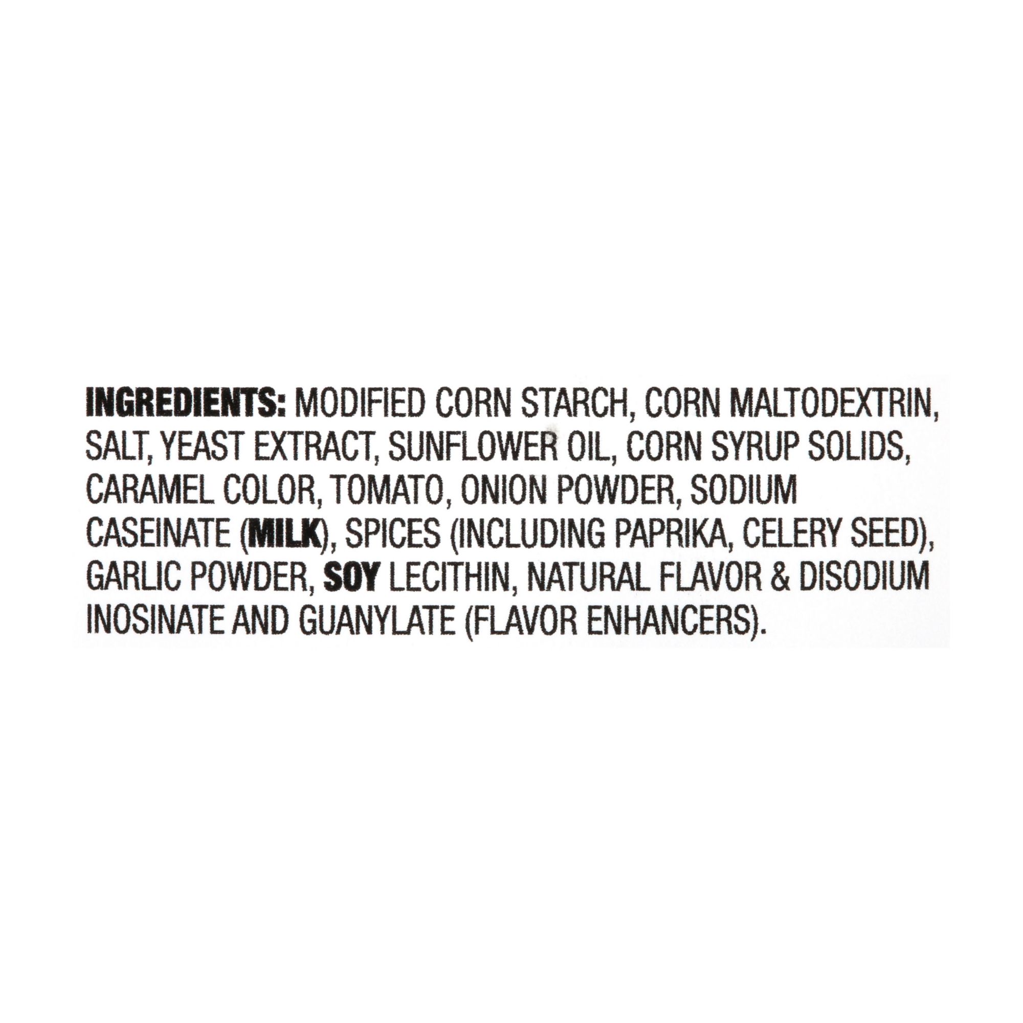 Ingredients: Modified Corn Starch, Corn Maltodextrin, Salt, Yeast Extract, Sunflower Oil, Corn Syrup Solids, Caramel Color, Tomato, Onion Powder, Sodium Caseinate (Milk), Spices (Including Paprika, Celery Seed), Garlic Powder, Soy Lecithin, Natural Flavor & Disodium Inosinate and Guanylate (Flavor Enhancers).