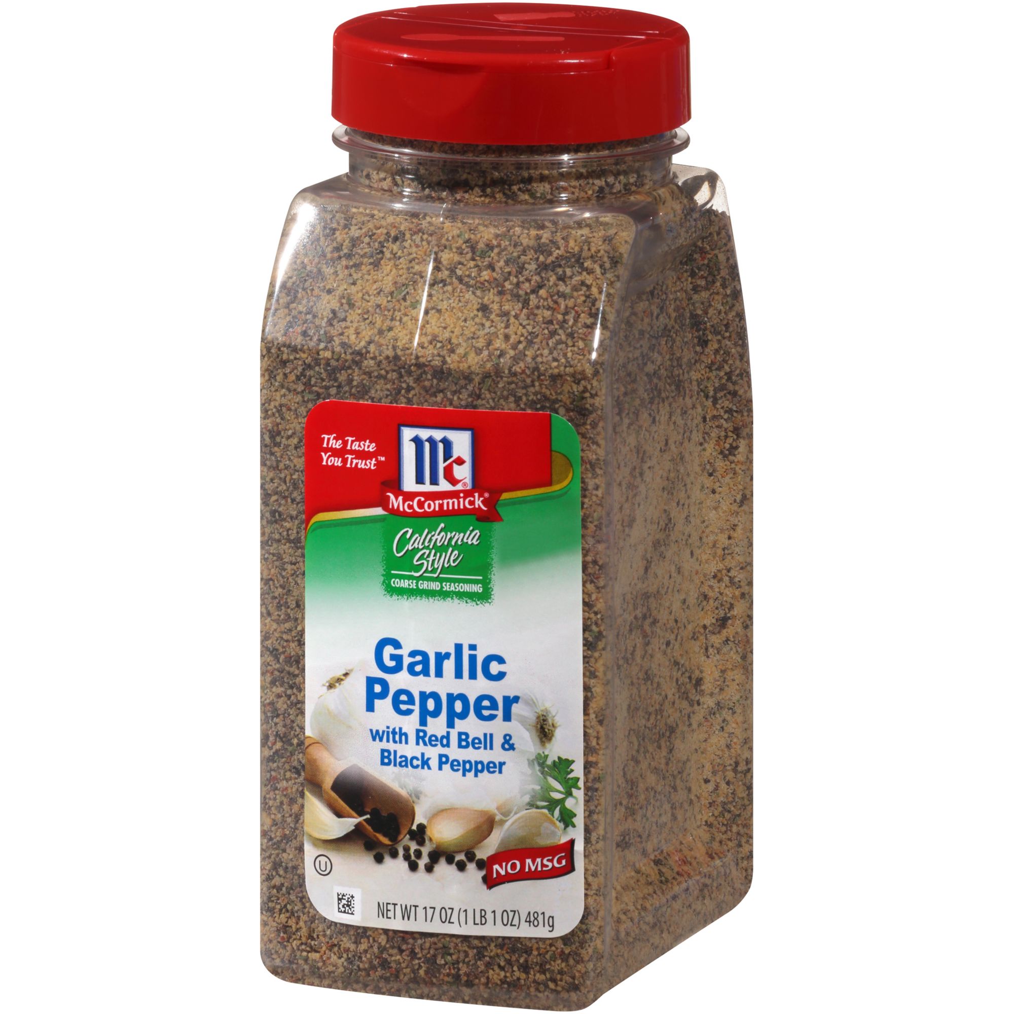 Coarsely ground garlic, red bell and black pepper, salt, brown sugar and onion Use as a rub or season burgers, chicken and seafood before you broil or grill Versatile seasoning kicks up the flavor of salads, vegetables, pasta and rice Larger size perfect for frequent home cooking or professional kitchens No MSG; certified Kosher Pareve by the Orthodox Union Includes 17-oz. California style garlic pepper