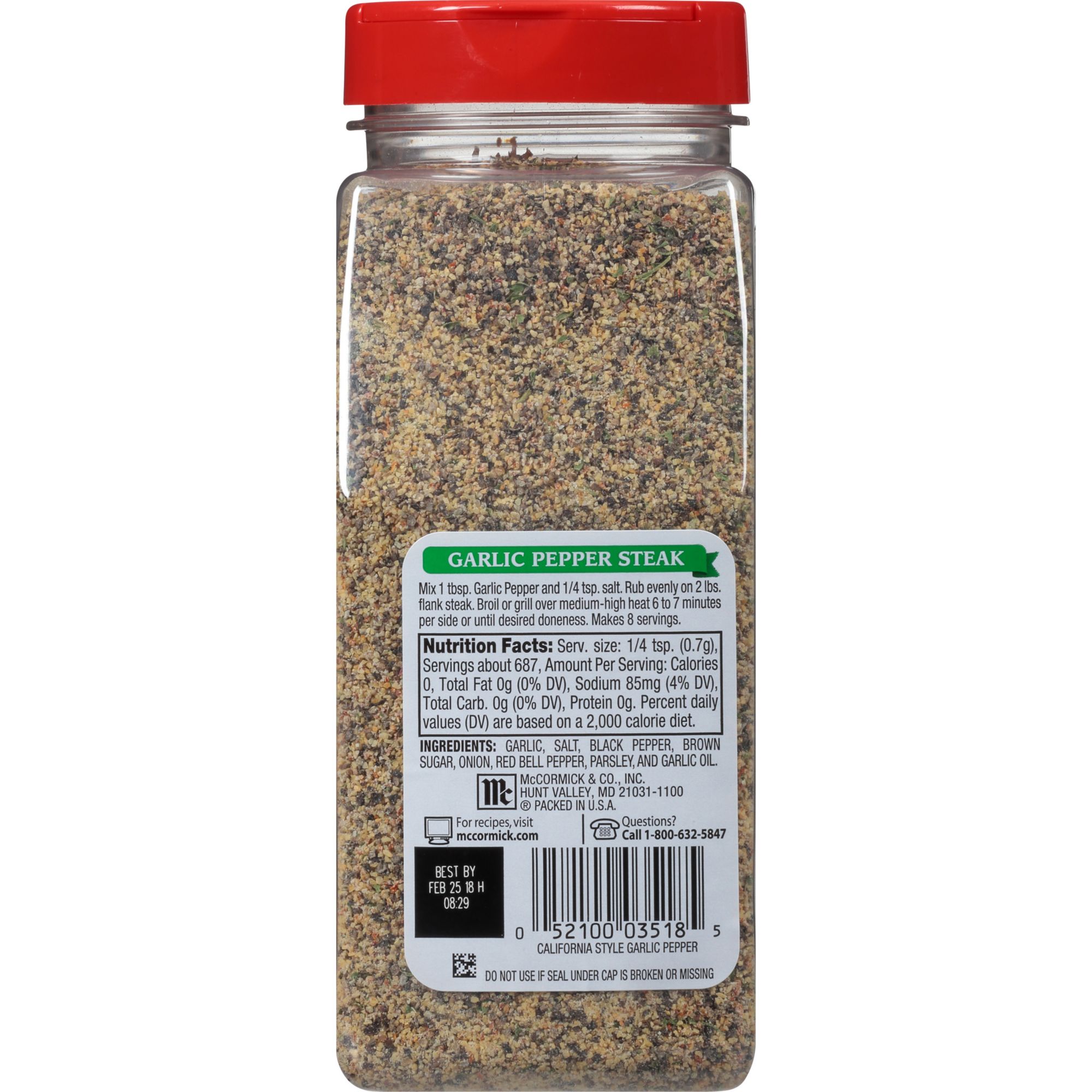 McCormick California Style Garlic Pepper is a kitchen staple made with garlic, black pepper and red bell peppers. Perfect as a rub or seasoning, use it on steaks, hamburgers, salads, baked potatoes and vegetables. Best of all, this California Style Garlic Pepper is sourced for superior quality and fresh flavor guaranteed.