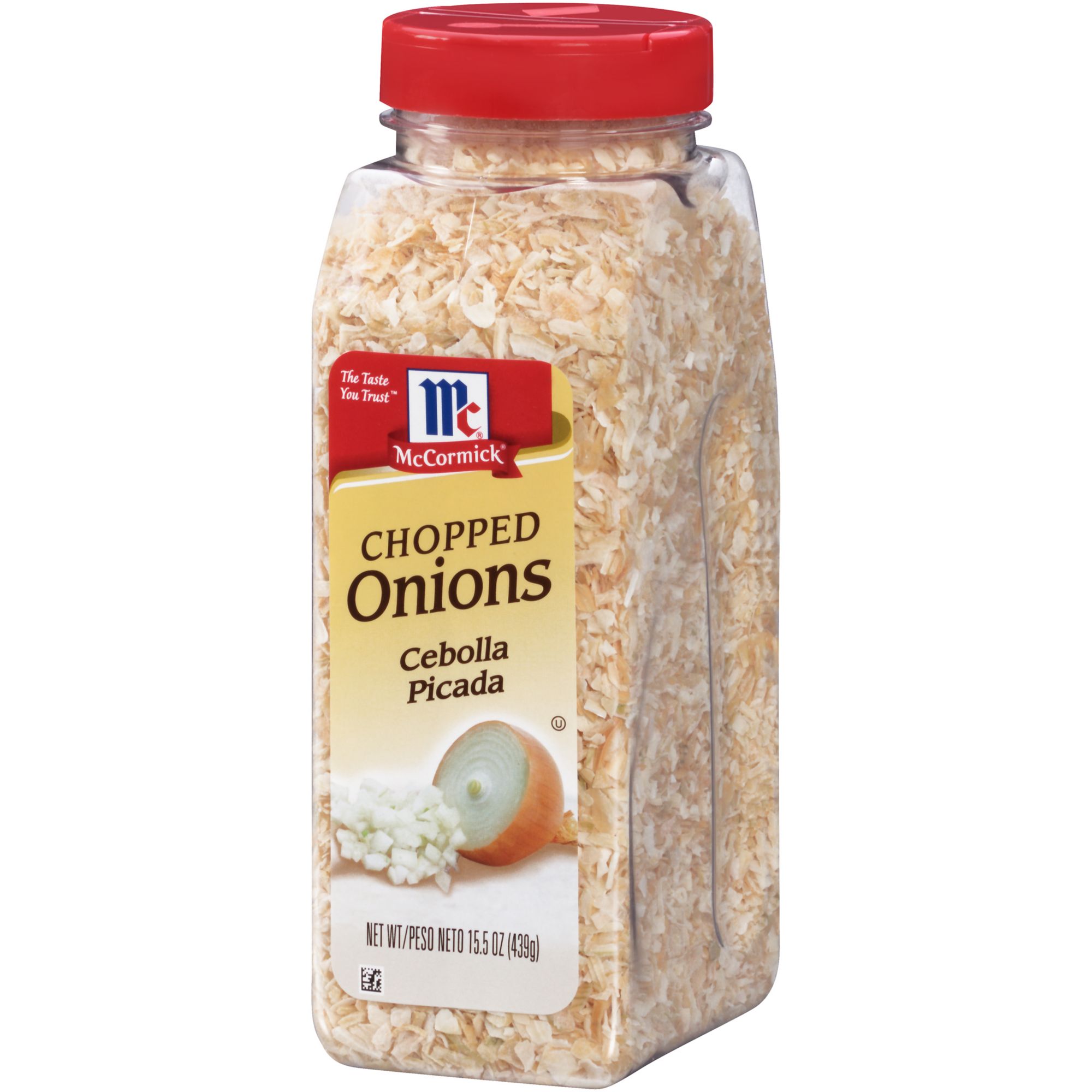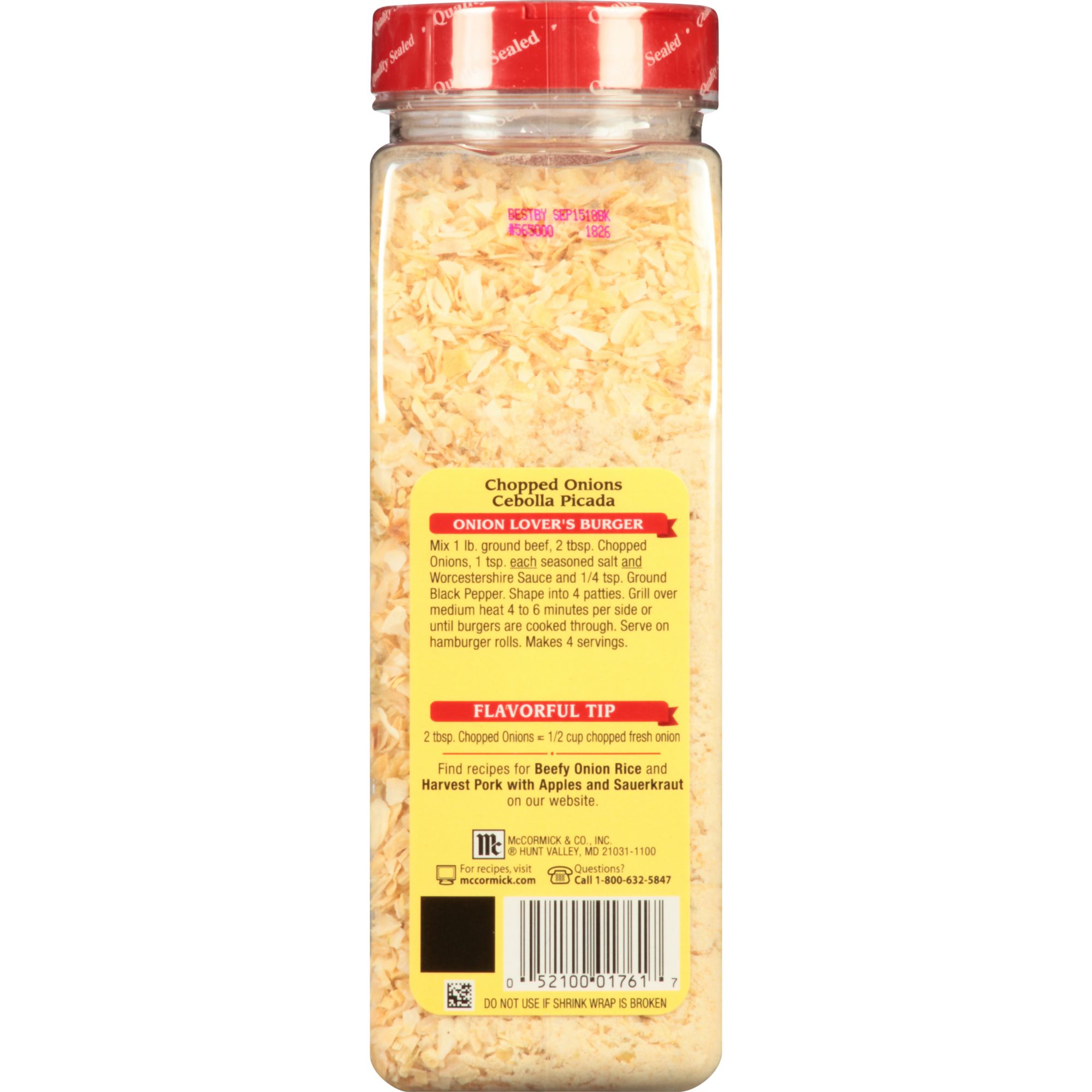 1/4 cup dried chopped onion equals 1 cup chopped raw onion Use anywhere you would use fresh onion Packaged in flavor sealed bulk container with dual flip top lids for sprinkling or measuring Includes 15.5 oz. of McCormick chopped onions