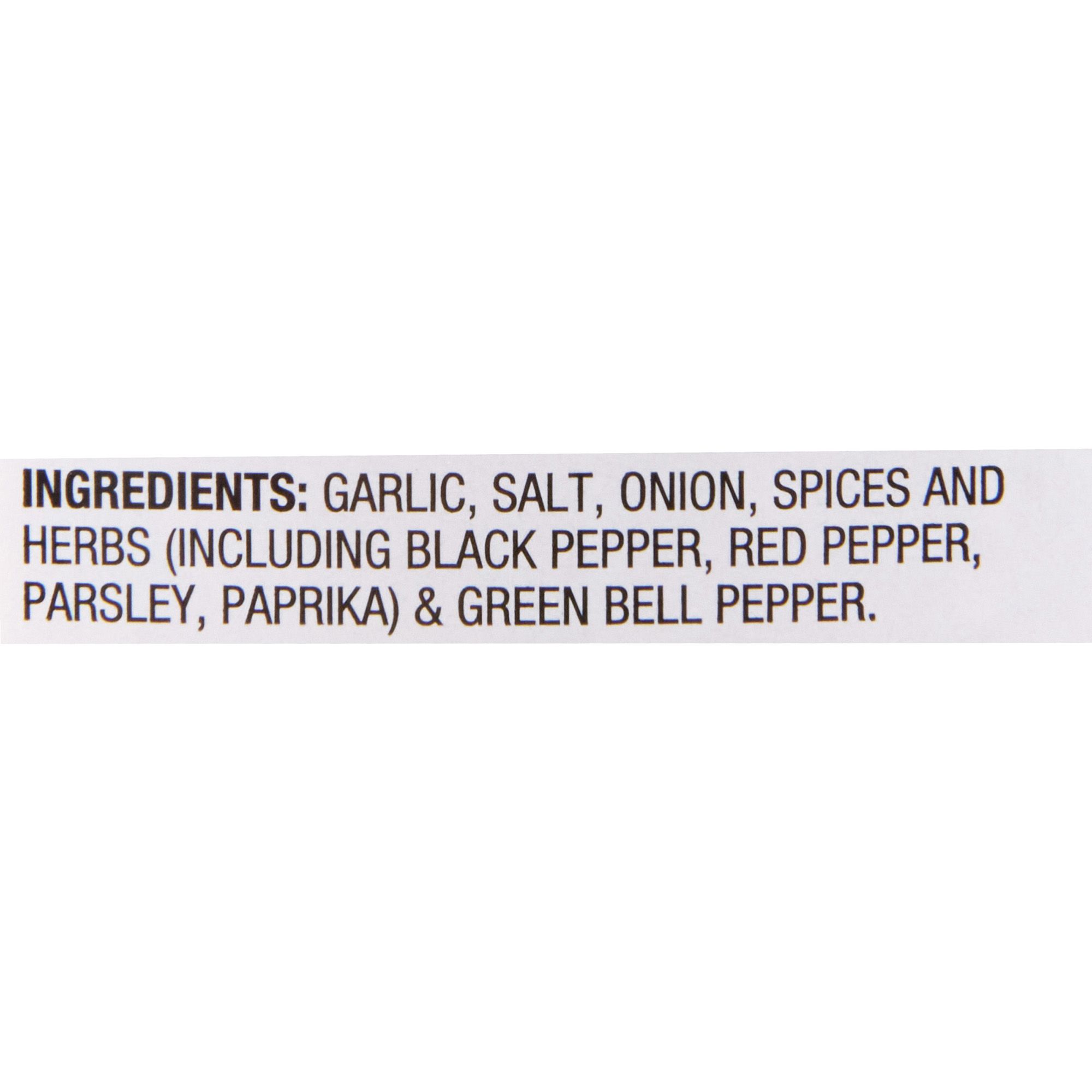 Ingredients: Garlic, Onion, Salt, Spices and Herbs (Including Black Pepper, Parsley, Red Pepper, Paprika), and Green Bell Pepper.