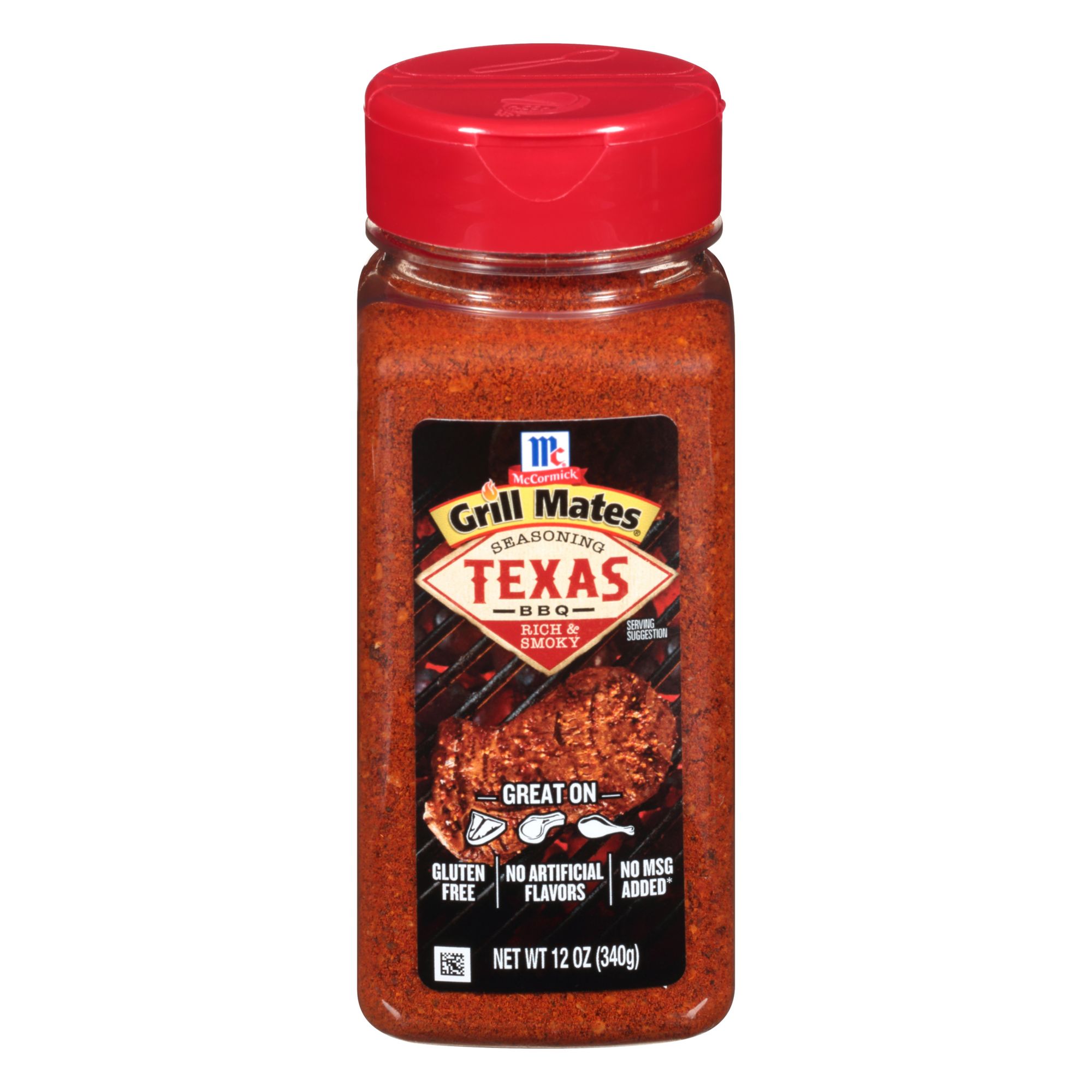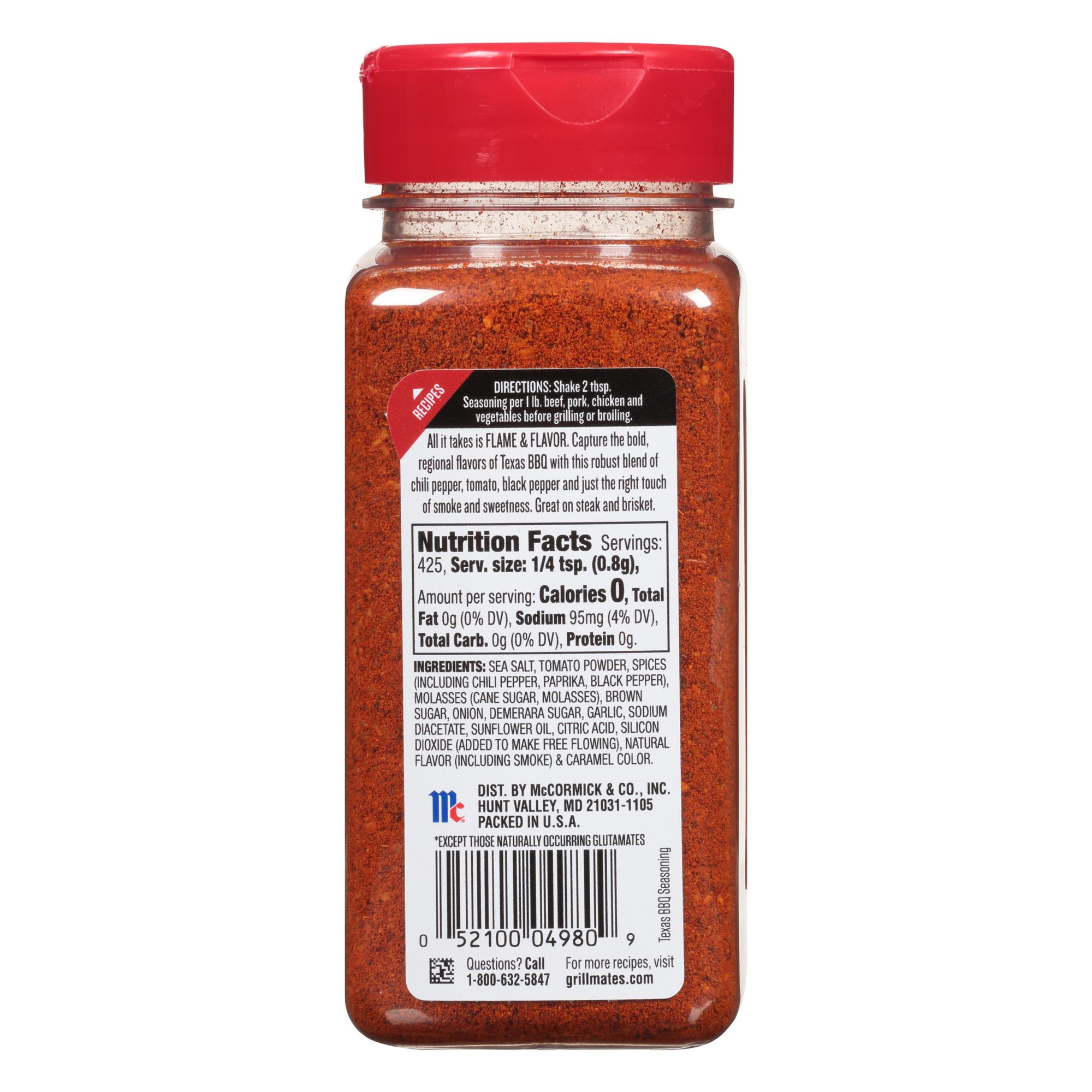 Grill Mates Texas BBQ Seasoning takes the guesswork out of grilling seasonings with an authentic regional variation of iconic American barbecue flavors. They say everything’s bigger in Texas, and this Texas BBQ seasoning proves it with a rich and smoky blend that’s great on steak and brisket. Infuse your grilling fare with the barbecue tradition of the Lone Star State with Grill Mates Texas BBQ Seasoning. It’s a robust blend of tomato, chili and black pepper, and just the right touch of smoke and sweetness. Shake 2 tablespoons Seasoning per 1 pound of beef, pork, chicken or vegetables before grilling or broiling. Grill masters can grill confidently, knowing this epic seasoning gets its flavor from trusted McCormick ingredients, plus it’s gluten free!