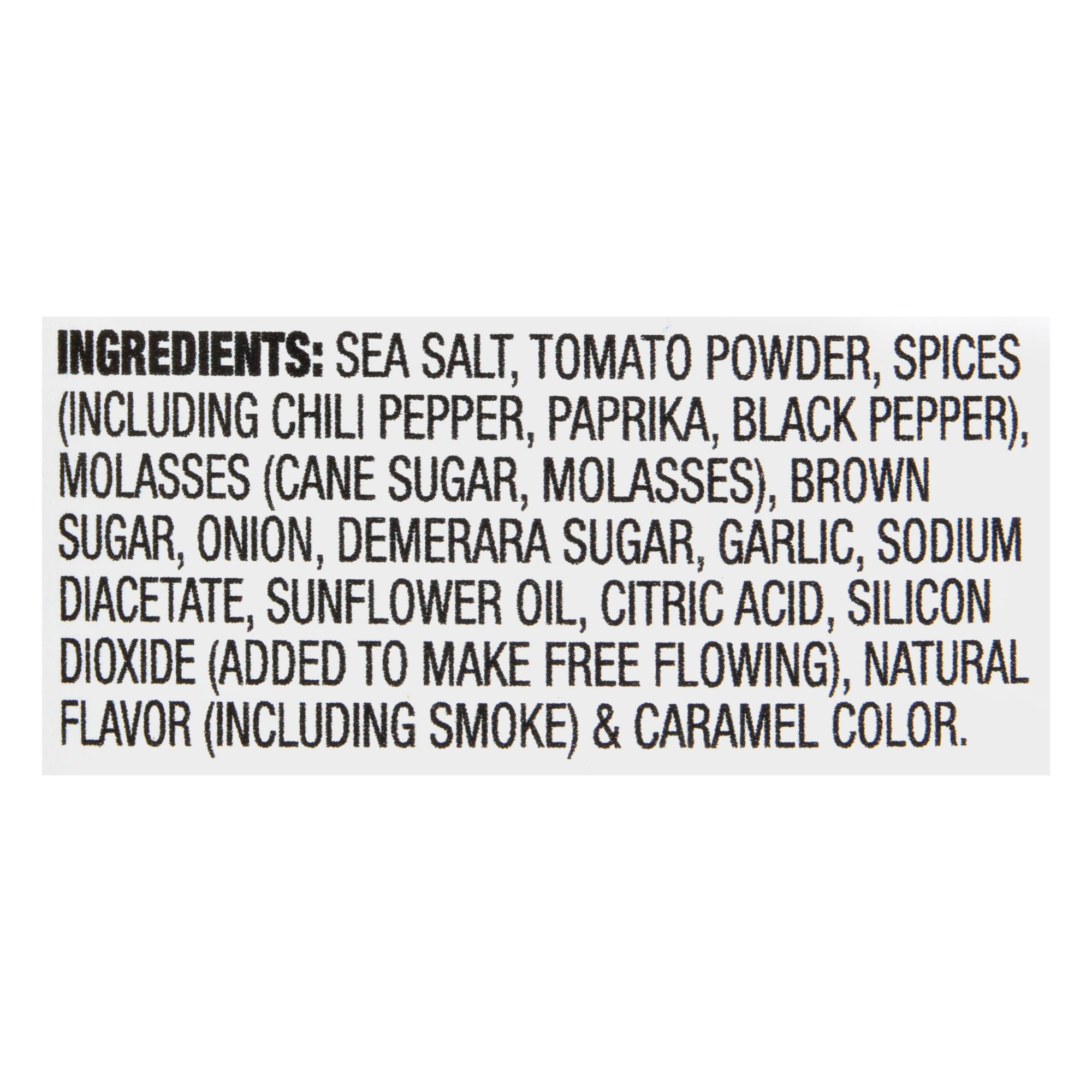 Sea Salt, Tomato Powder, Spices (Including Chili Pepper, Paprika, Black Pepper), Molasses (Cane Sugar, Molasses), Brown Sugar, Onion, Demerara Sugar, Garlic, Sodium Diacetate, Sunflower Oil, Citric Acid, Silicon Dioxide (Added to Make Free Flowing), Natural Flavor (Including Smoke) & Caramel Color