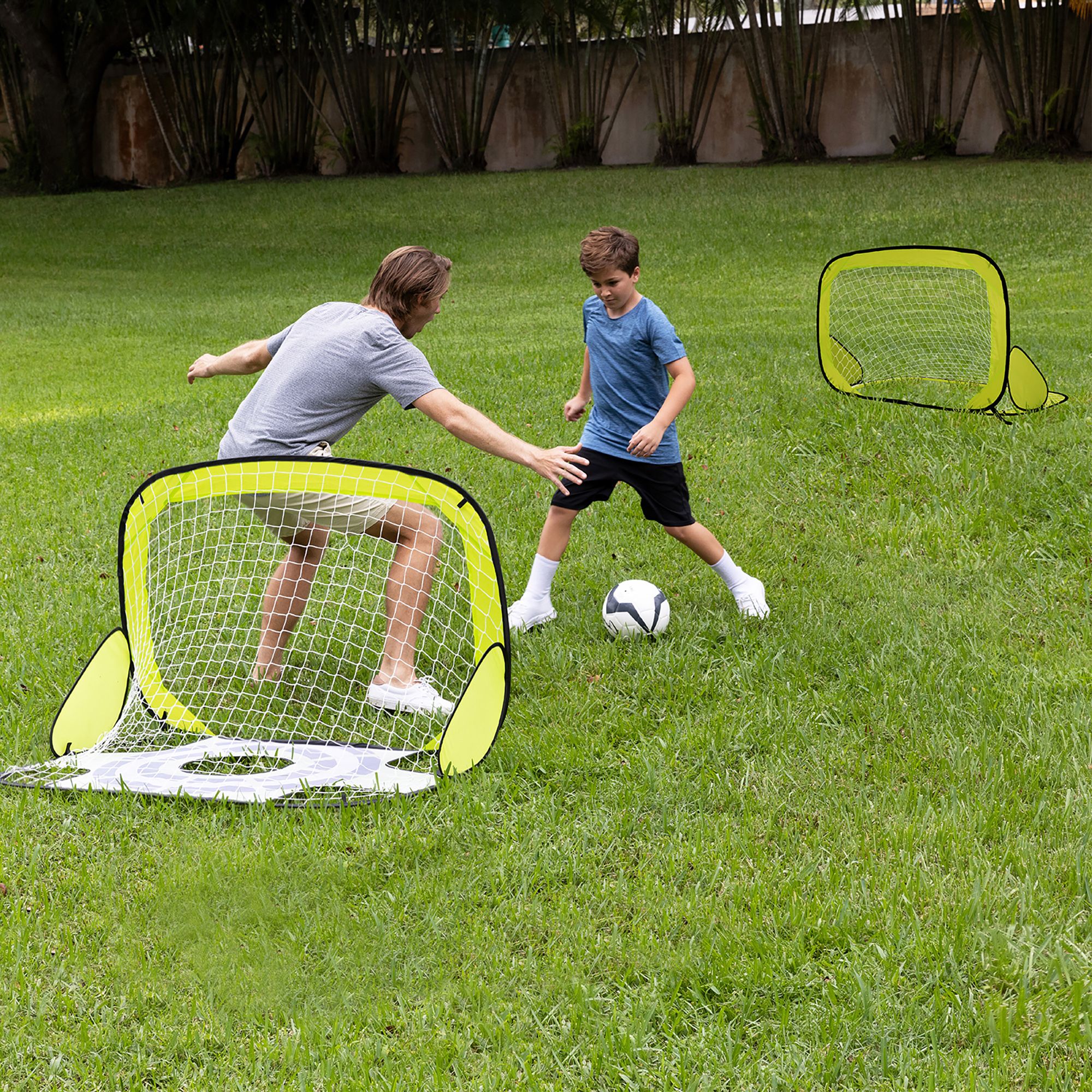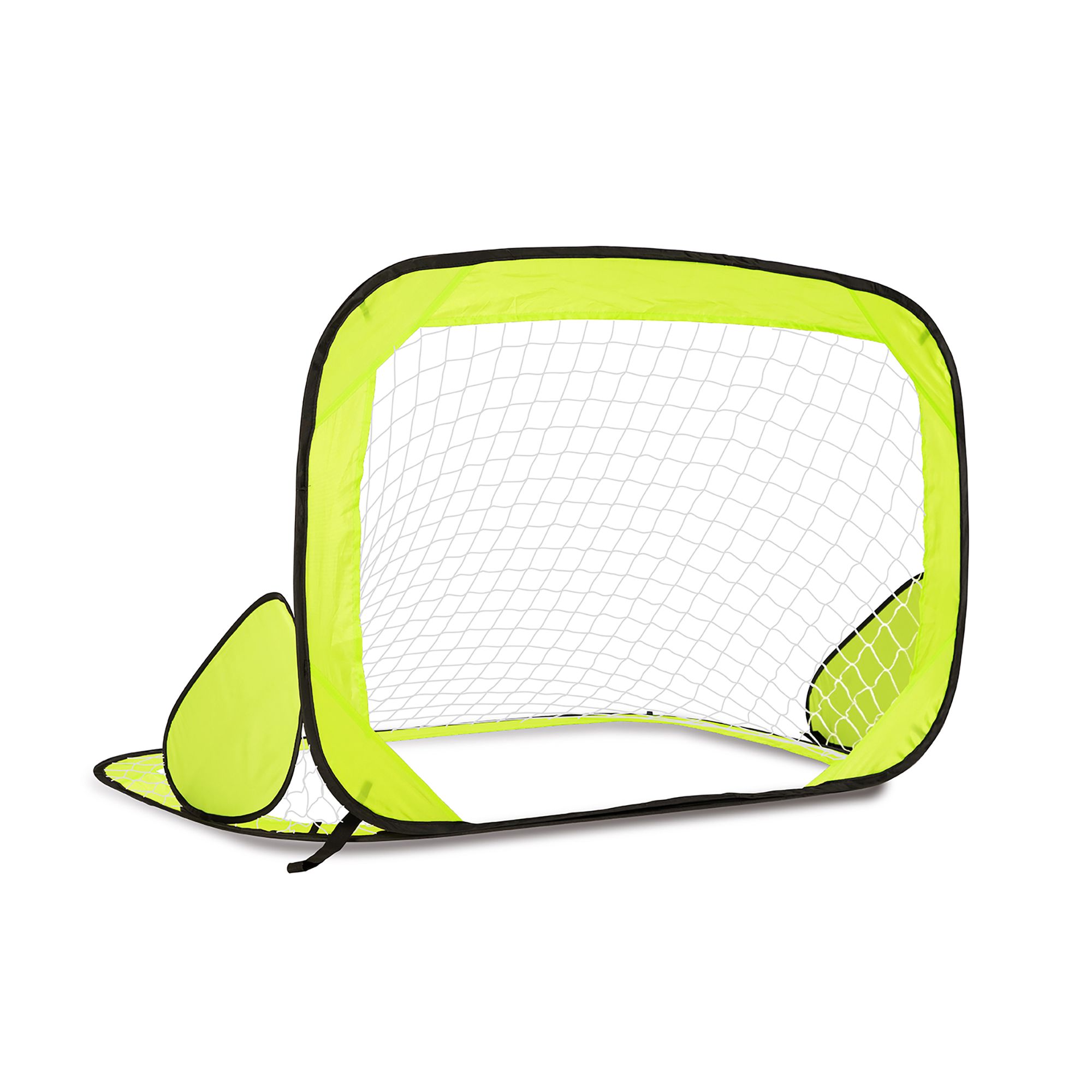 Sharpen your soccer skills with the MD Sports 2-in-1 Pop Up Goal Set. It is ideal for all types of play, from live soccer matches, team practices, individual training to improve your ball handling and shooting skills, or all-around backyard fun. This set comes with two durable all weather and light weight targets that have a steel frame. The twist and fold design allows you to set up and tear down in seconds, for quick and easy assembly with no tools required. Two game options are available; standard soccer goal set plus one bonus target panel included on one of the goals to practice your accuracy skills. The set also includes eight ground stakes for additional stability to keep the goals in place during use. Comes with convenient carrying bag to pick up and transport hassle free while providing space saving storage. Have fun playing soccer or improving your soccer skills!