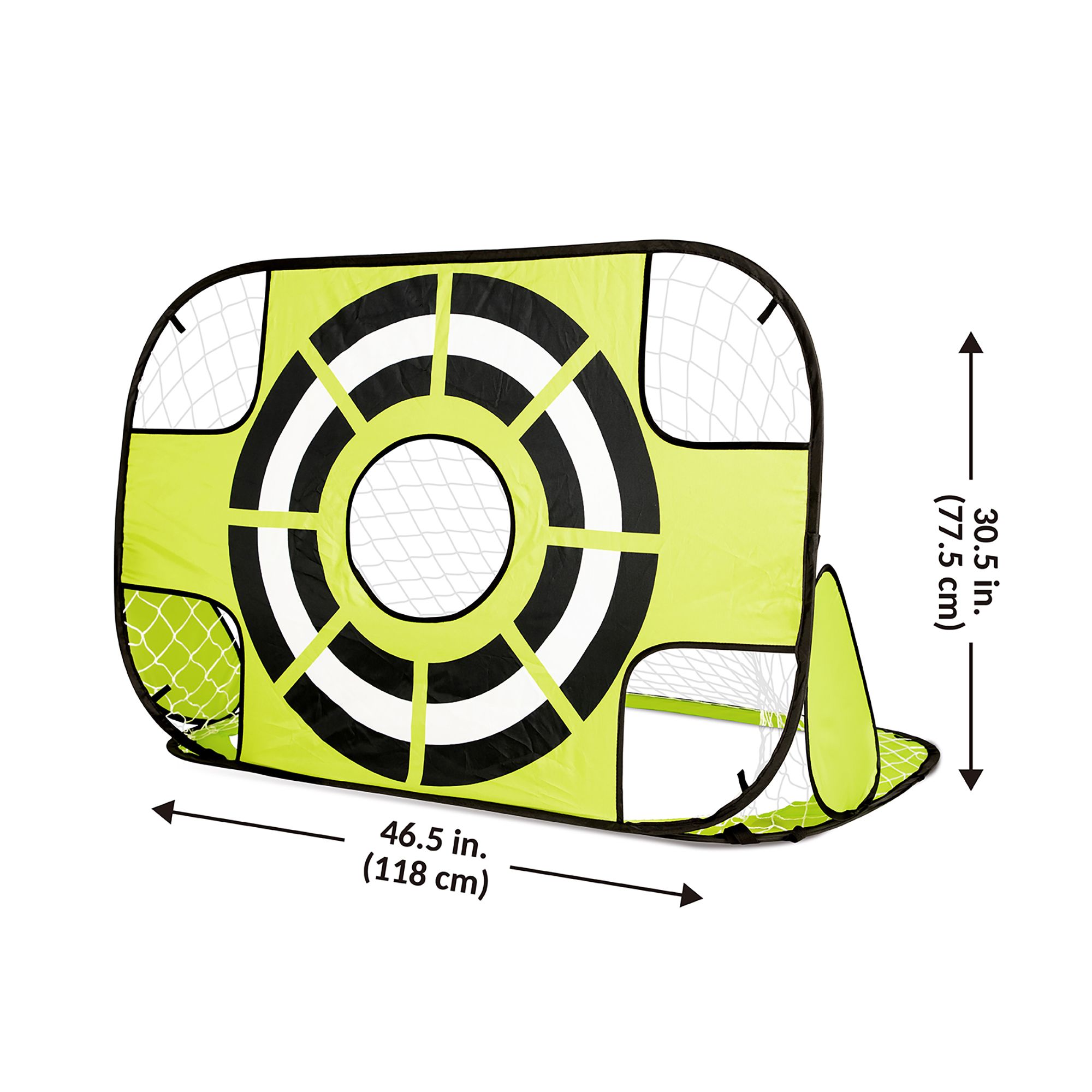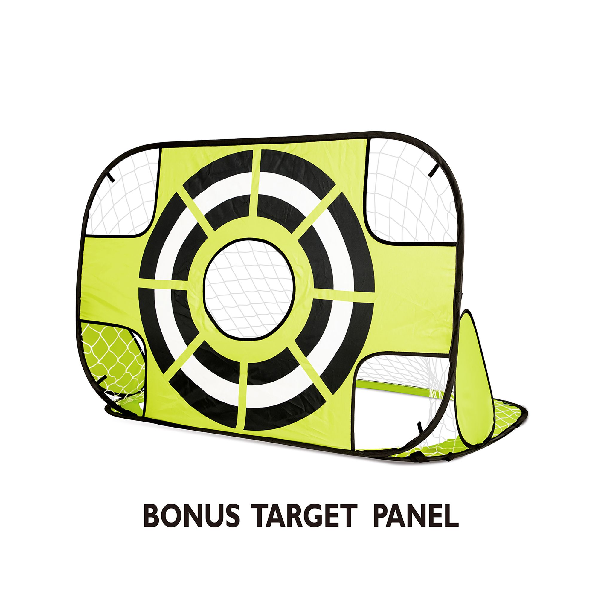 Includes two pop up goals, bonus target panel, ground stakes, and storage bag