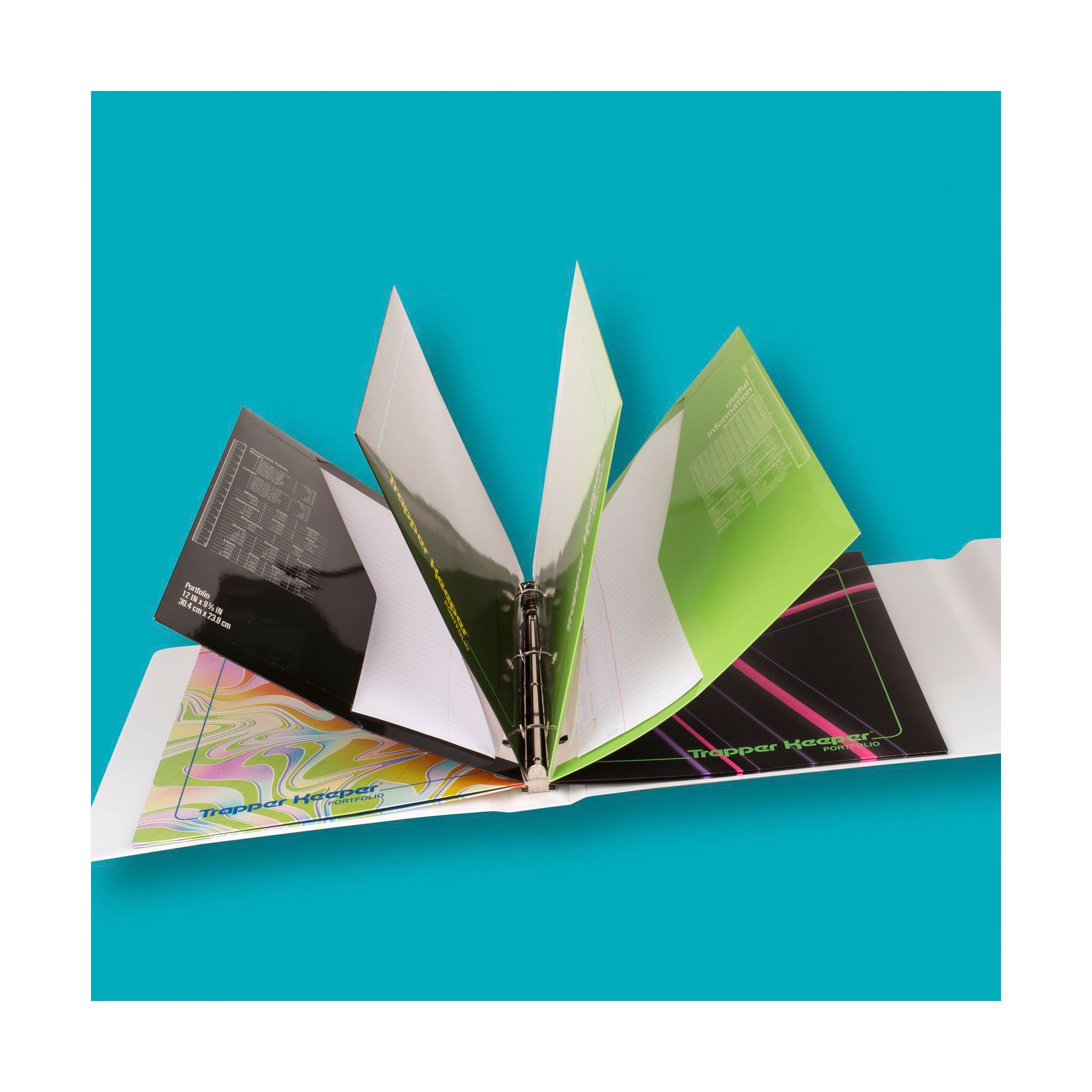 It's time to get nostalgic. Remember leg warmers, bold colors, big hair, and oversized blazers? This original Mead Trapper Keeper keeps the 80s and 90s vibe alive. Stay cool with the timeless vibes of its brightly colored cover design. The hook and loop closure helps trap all your stuff inside – even if you drop it. Four folders help keep your papers secure. Each folder has a vertical pocket that holds loose sheets so they won't fall out. Common stats are printed right on the folders so you don’t forget the basics. Store all the folders and other three-hole punched sheets in the sturdy 1" metal binder rings. A metal clip on the back of the trapper keeper helps secure loose papers and notes while on the go. Store even more in the inside pocket, perfect for keeping hand-outs, assignments, extra paper, and other loose sheets that you need to keep close at hand.