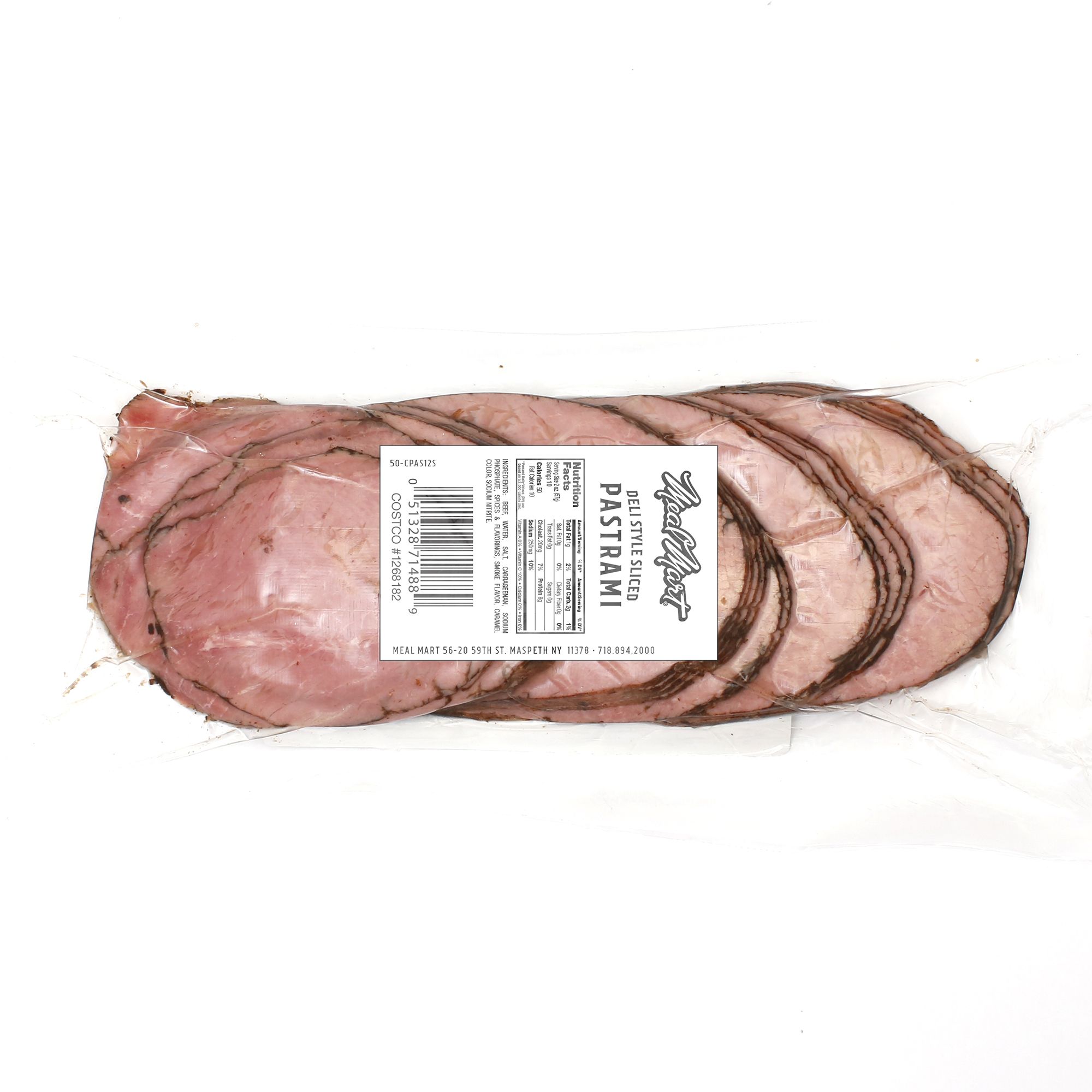 Glatt Kosher sliced Meal Mart deli-style pastrami is from your trusted purveyor of quality meats. For over 75 years, Meal Mart is the Kosher consumer's premier source for quality Glatt Kosher meat. Meal Mart uses trusted, old world traditions and recipes combined with new world innovation and technology to bring a complete line of meat products. Using a one-hundred year old family recipe for its pastrami, Meal Mart packages the classic taste of your favorite sliced deli in a convenient 1.25 lb. pack. Classic spices and slow roasting makes Meal Mart pastrami a customer favorite. Meal Mart pastrami can be enjoyed hot or cold, served on your favorite bread or piled high next to your favorite salad or potato dish. Meal Mart pastrami can also be part of a sliced cold cut platter teamed up with pickles, mustard, salads and sides. Rest assured, the tender, moist and juicy pastrami from Meal Mart is sure to please even the most discerning deli lovers.