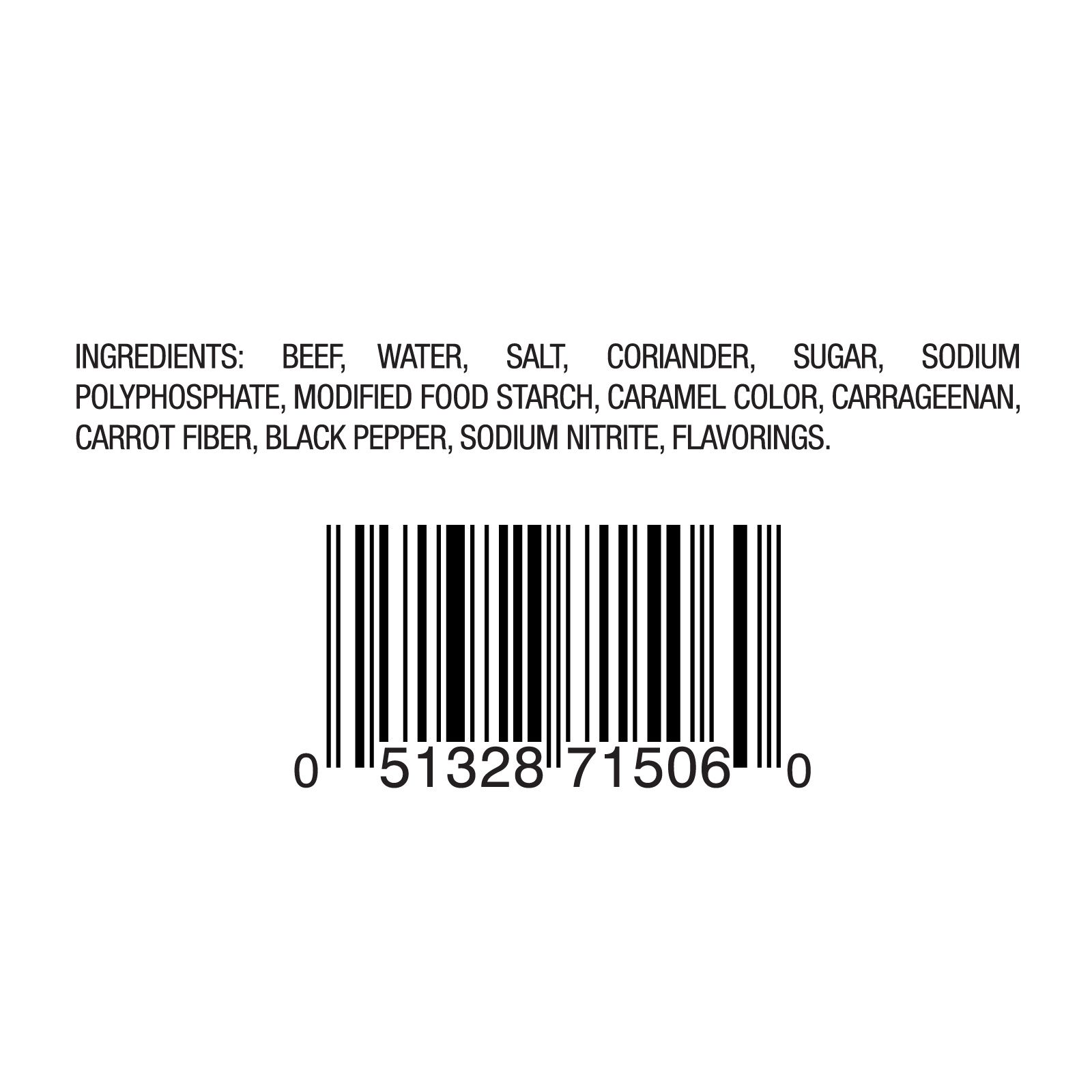 beef, water, salt, carrageenan, sodium phosphate, spices & flavorings, caramel coloring, sodium nitrite