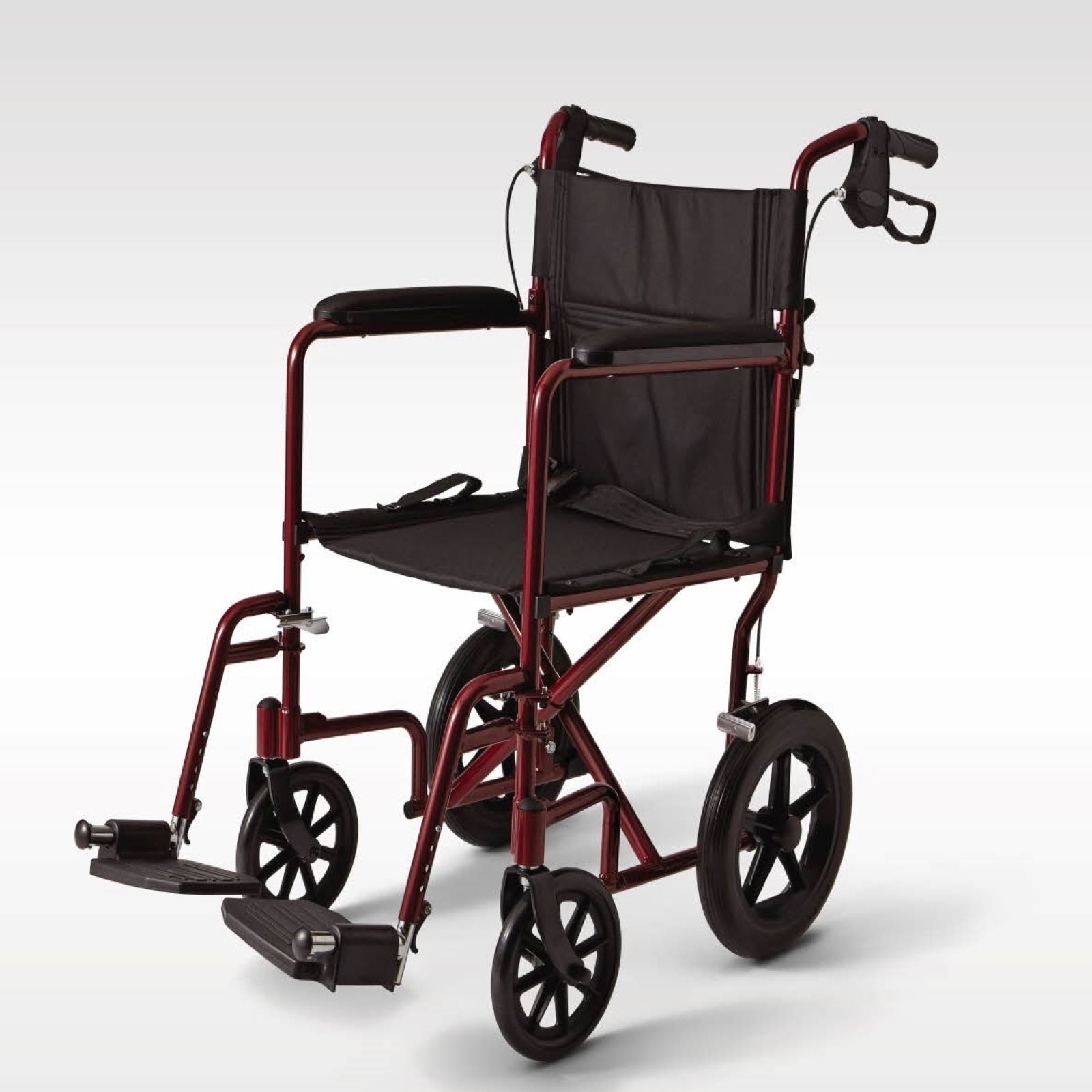 The basic Aluminum Transport Chair with a lightweight powder-coated aluminum frame and 12"(30.5cm) wheels with handbrakes on top, plus a seat belt, make transport safe and smooth.