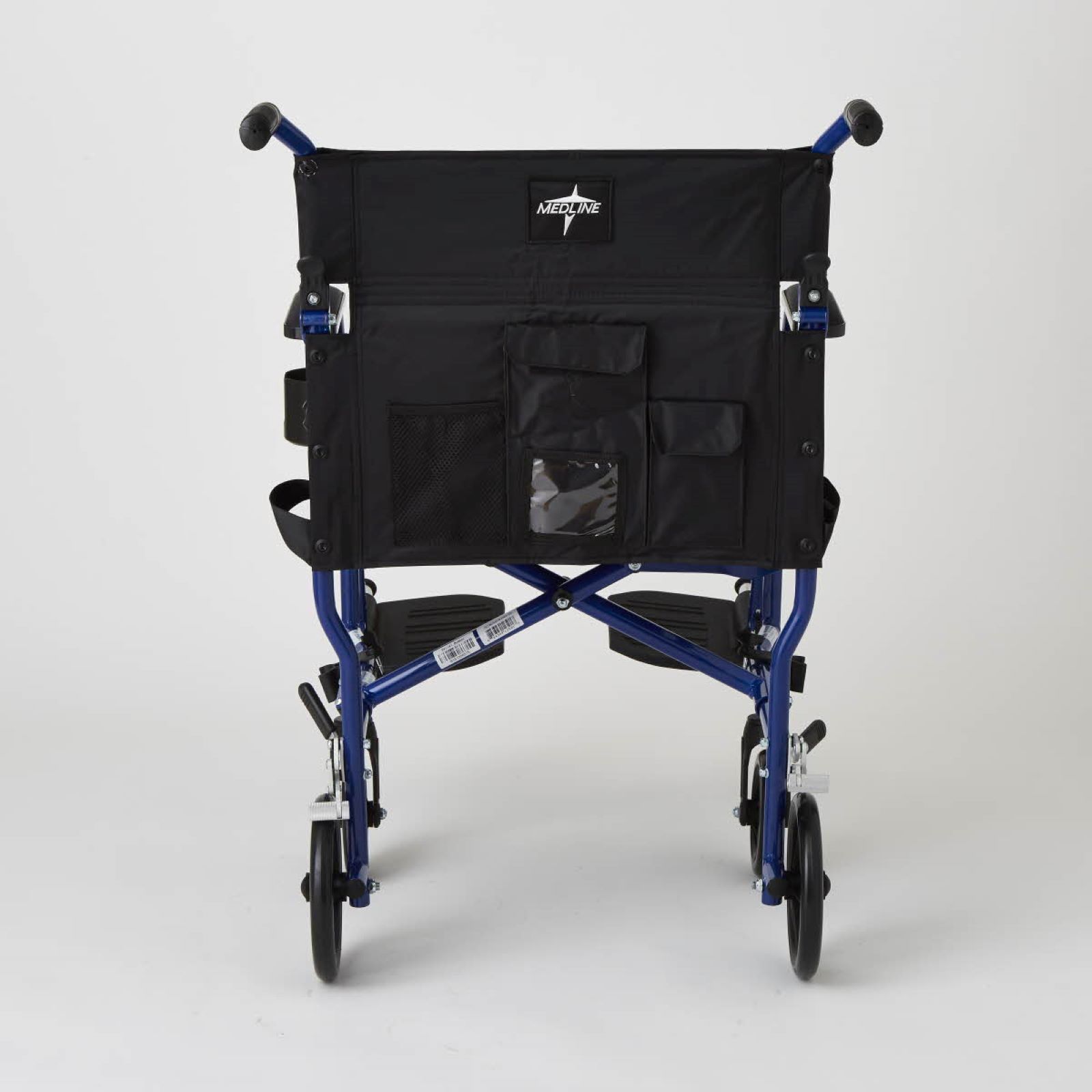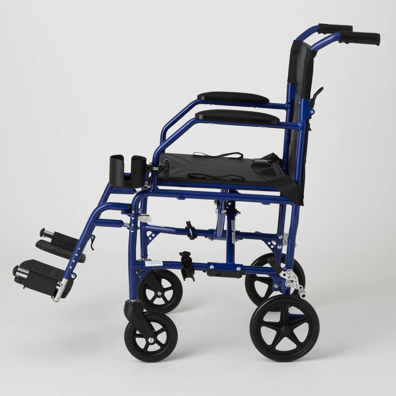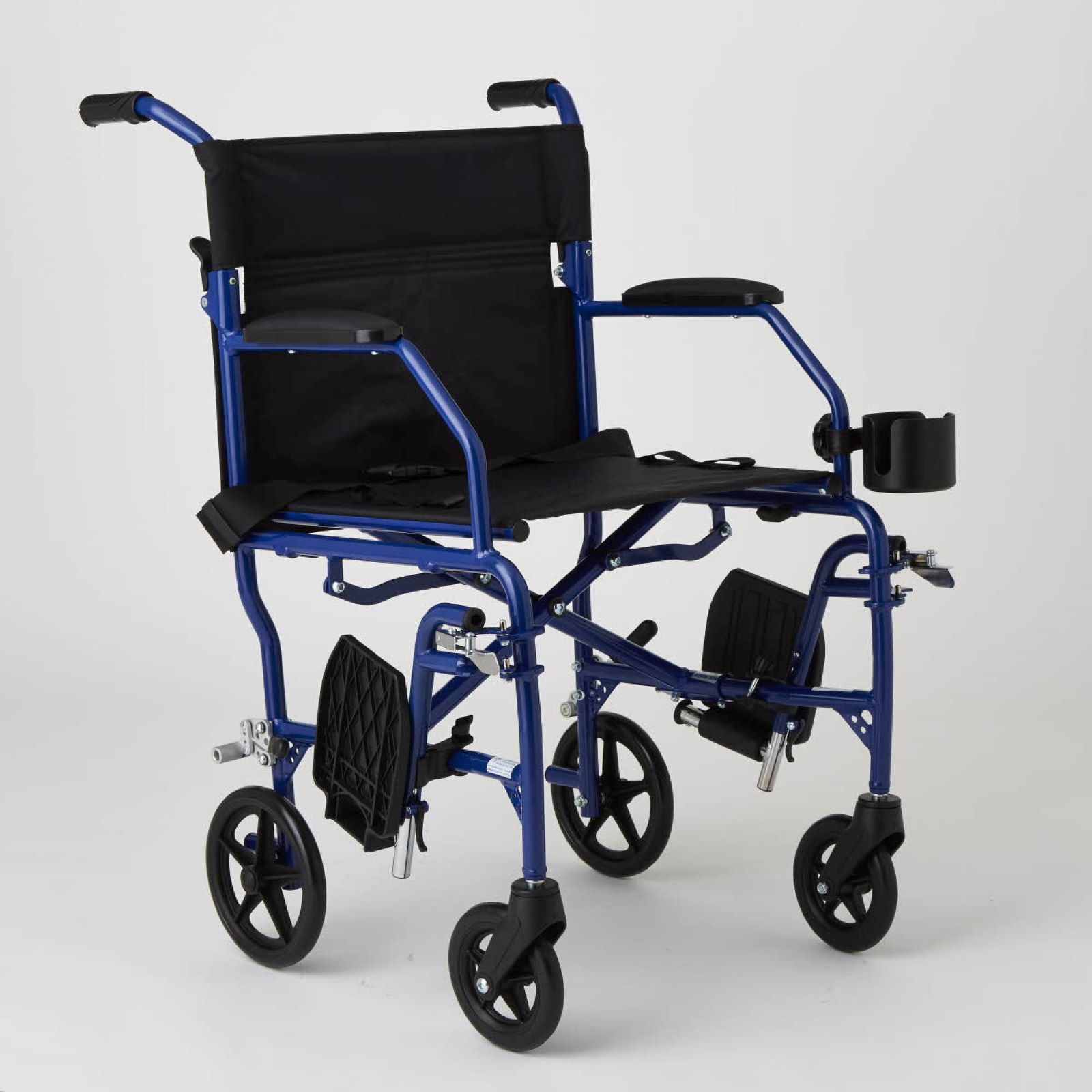 This durable transport chair weighs less than 15 lbs. (6kg), yet has a weight capacity of 300 lbs. (136kg) Convenient carrying handles on the seat for simple portability Permanent restaurant-style armrests allow for sitting closer to tables and desks Made of high-grade aluminum and soft nylon 8" rear wheels Includes ultralight transport chairs blue