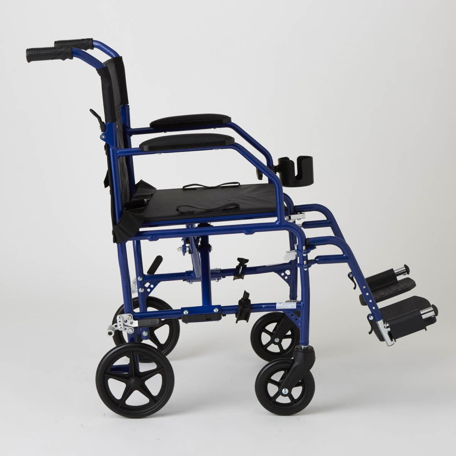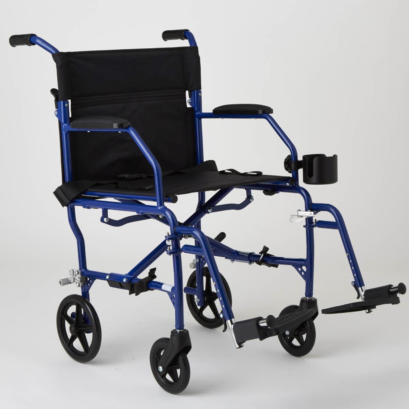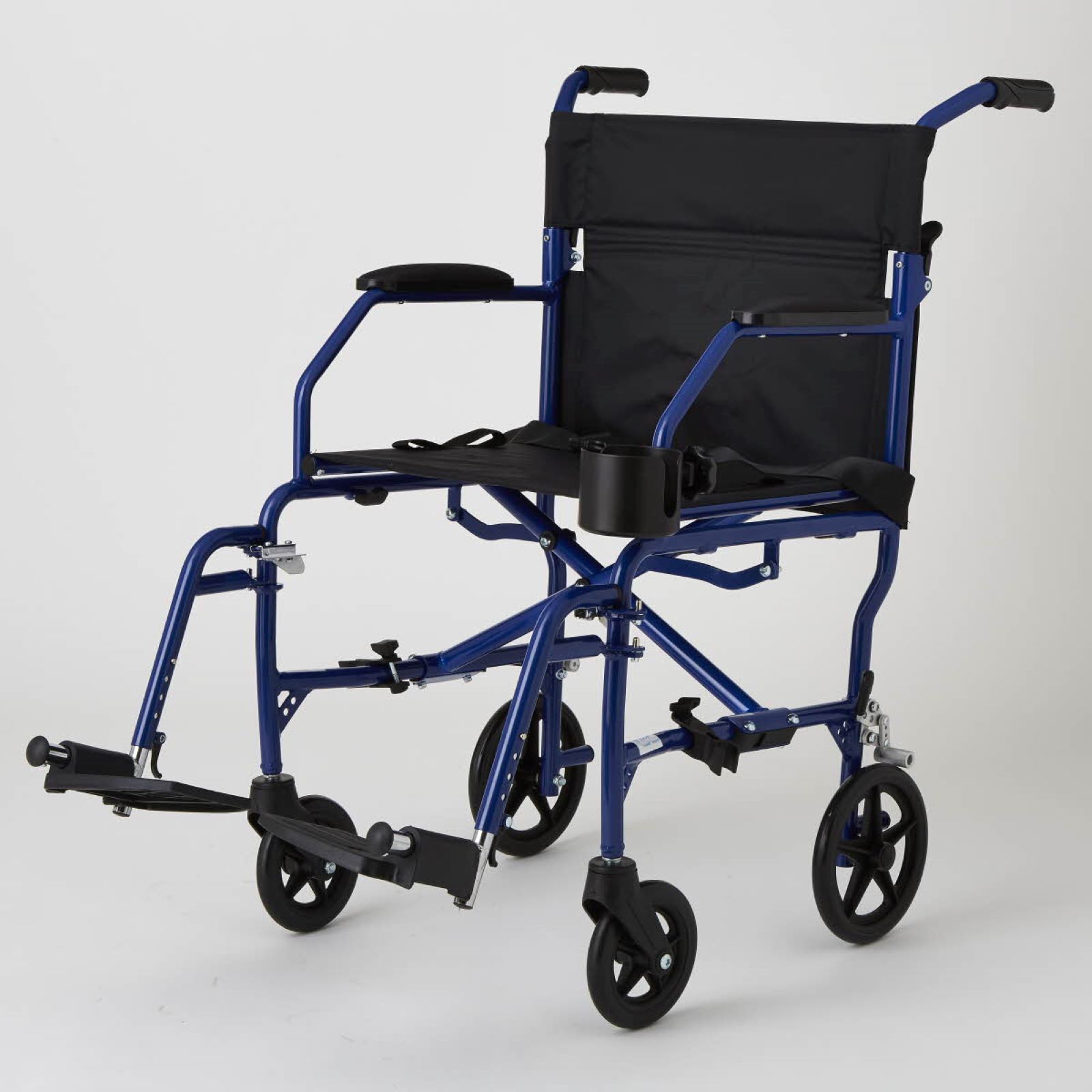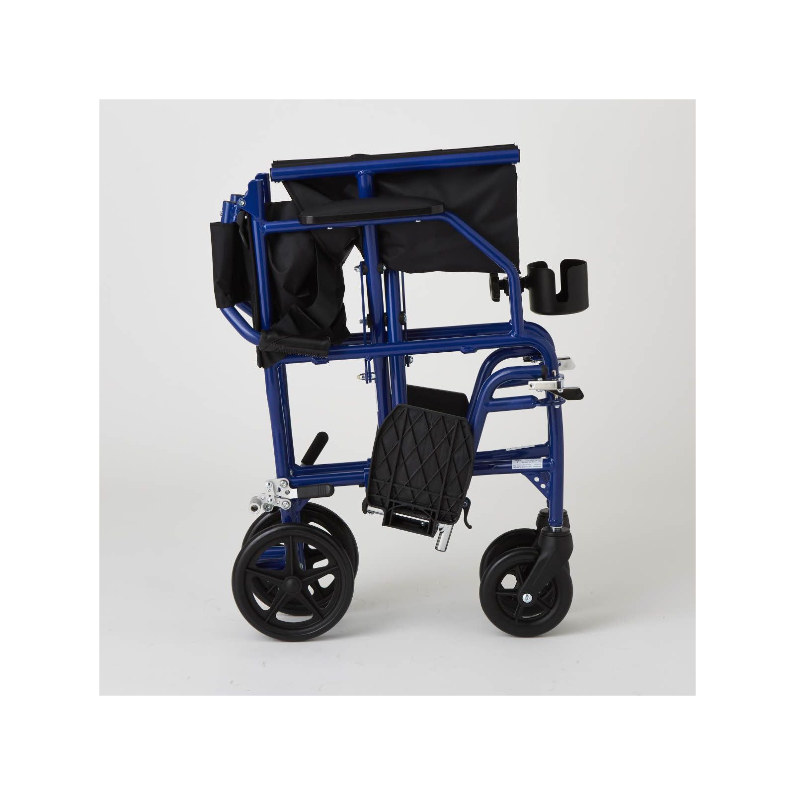 This durable transport chair weighs less than 15 lbs. (6kg), yet has a weight capacity of 300 lbs. (136kg) Convenient carrying handles on the seat for simple portability Permanent restaurant-style armrests allow for sitting closer to tables and desks Made of high-grade aluminum and soft nylon 8" rear wheels Includes ultralight transport chairs blue
