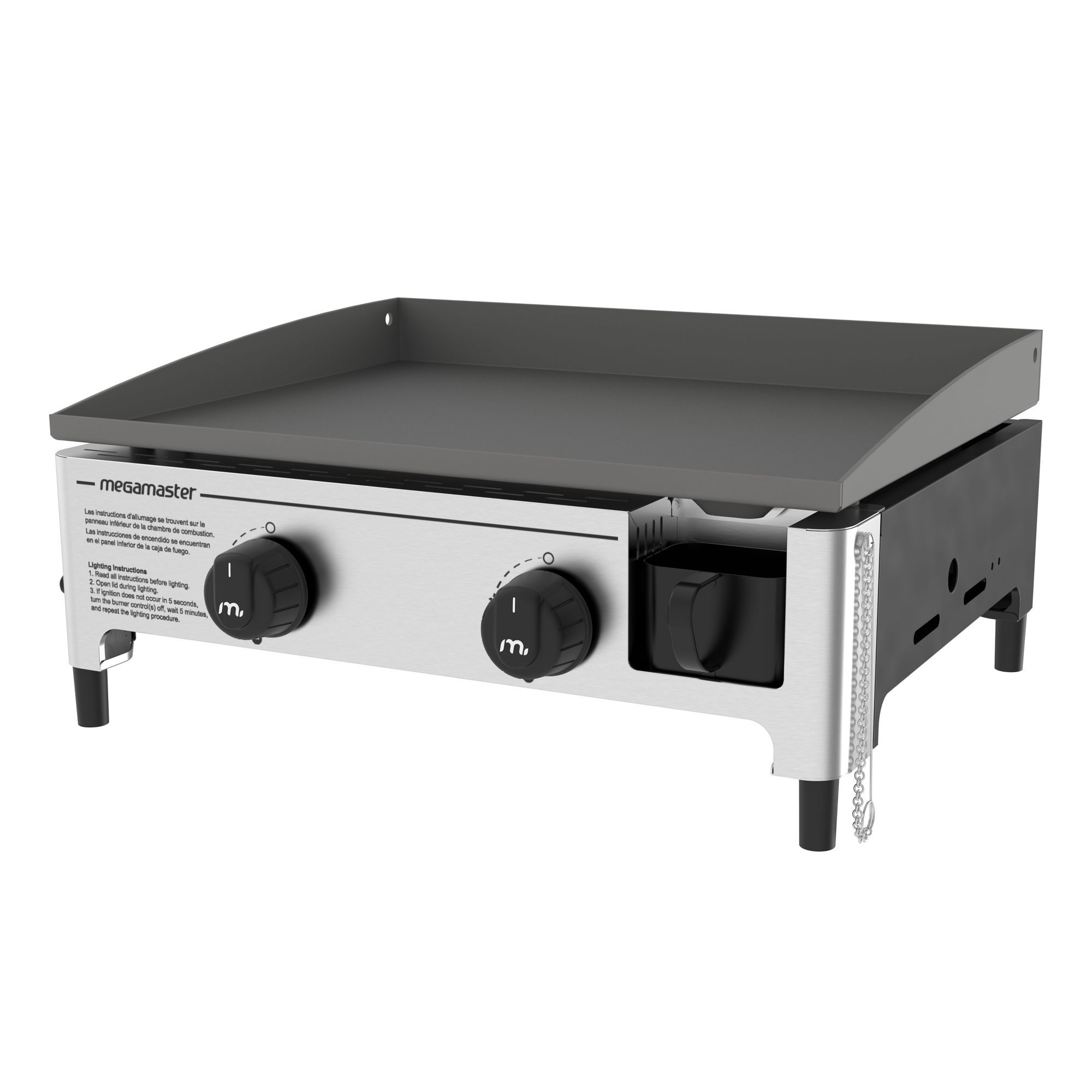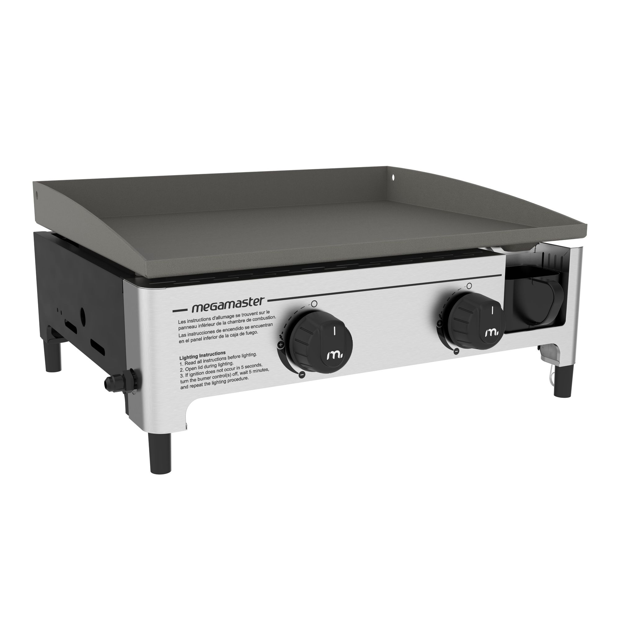 Check out the versatile Megamaster 2-Burner Propane Gas Tabletop Griddle for rustling up breakfast, brunch, lunch, dinner, and late-night munchies. This grill's sleek stainless-steel control panel is made to take the heat. Feed the hungry with over 300 sq. in. of pre-seasoned durable hot-rolled steel griddle. Two flat stainless-steel burners spread the heat from corner to corner for that perfect sear and sizzle. Both burners are controlled independently with an easy push-and-turn ignition offering up a total of 18,000 BTUs of grilling power. A handy removable grease box makes cleaning a breeze while silicone feet help keep your grill secured on most surfaces.
