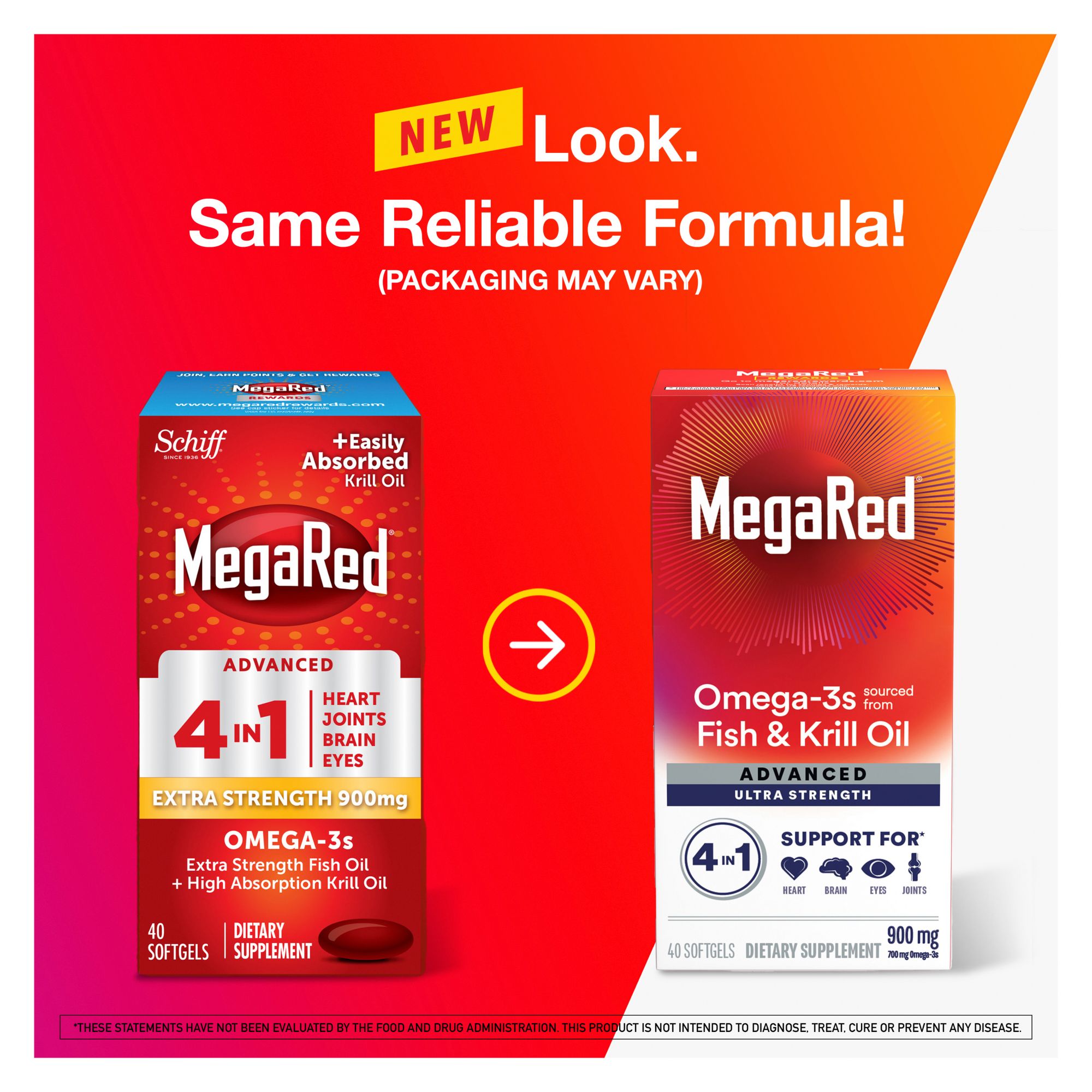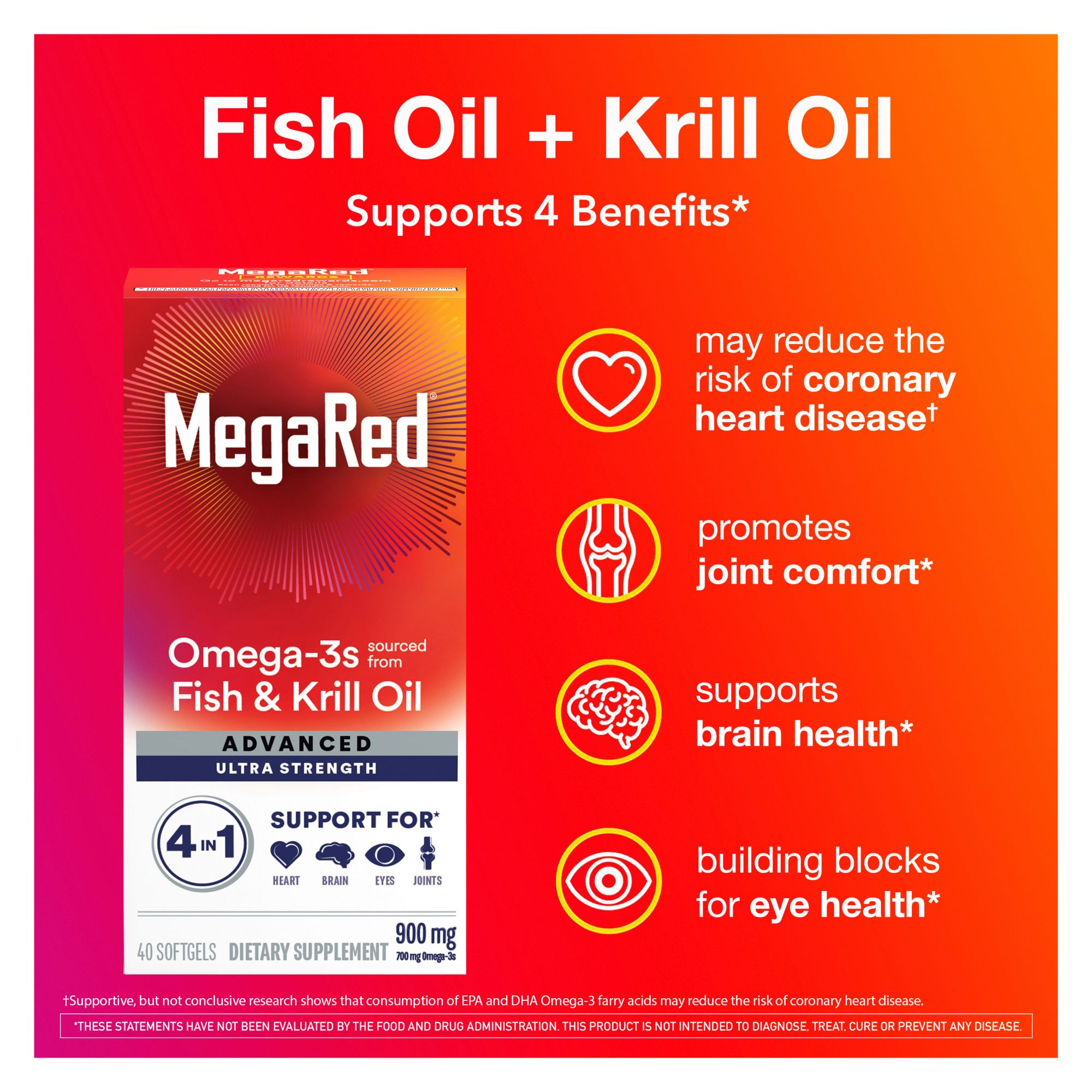 MegaRed Advanced is a special combination of high-concentration fish oil and high-absorption krill oil that has 2 times more Omega-3s than standard fish oil alone and supports 4 benefits. MegaRed Advanced 4-in-1 may reduce the risk of coronary heart disease, promotes joint comfort, supports brand health and is a building block for eye health.
