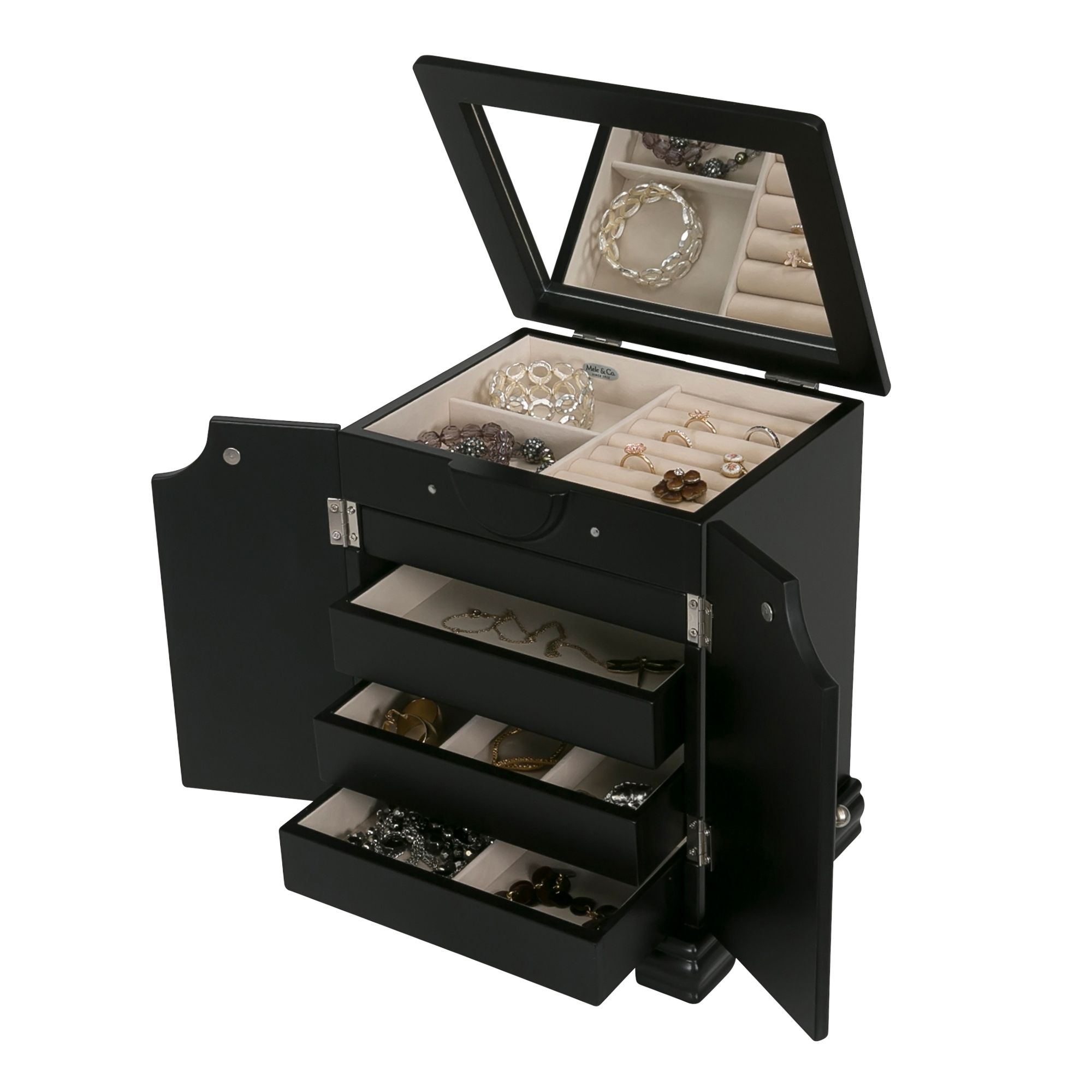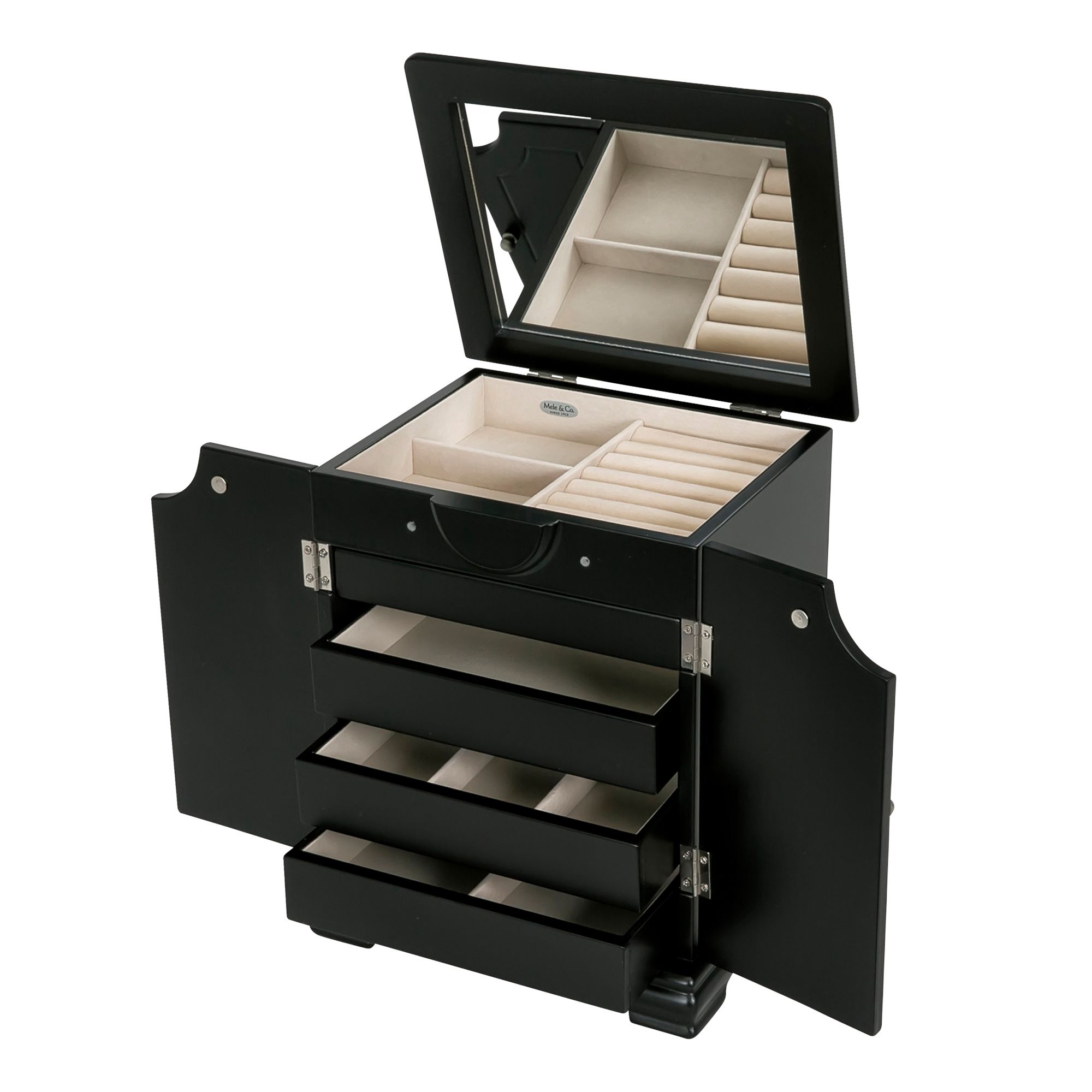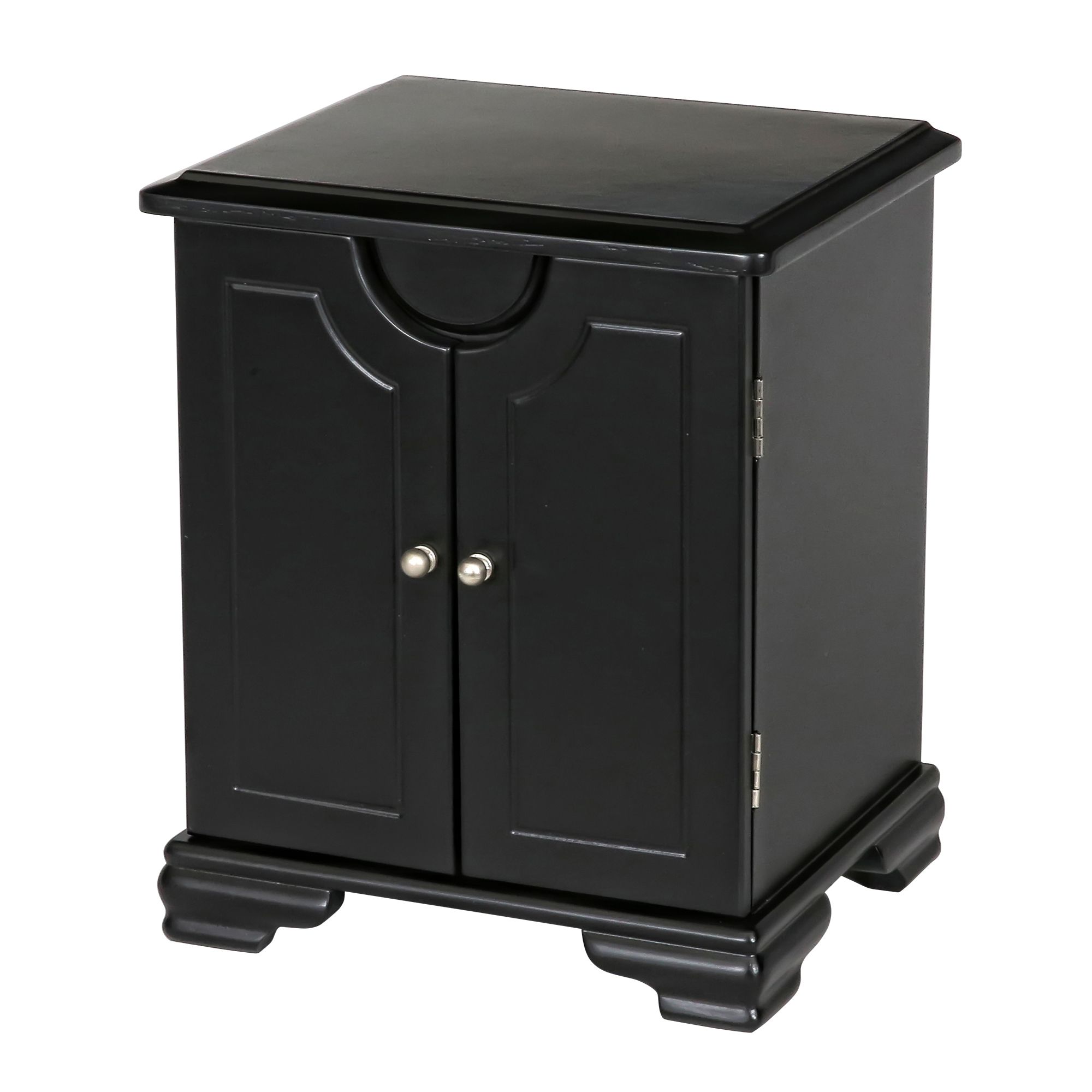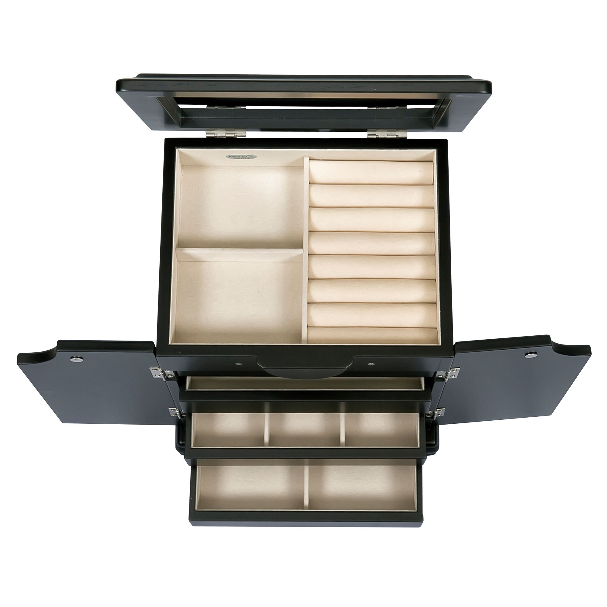 Exotic, yet elemental, the Cyprus jewelry box is a fresh fusion of modern sensibilities. With its satiny java finish, double door design and drop down necklace compartment, this jewelry chest offers polish without pretension. It features double doors and a drop-down necklace drawer.