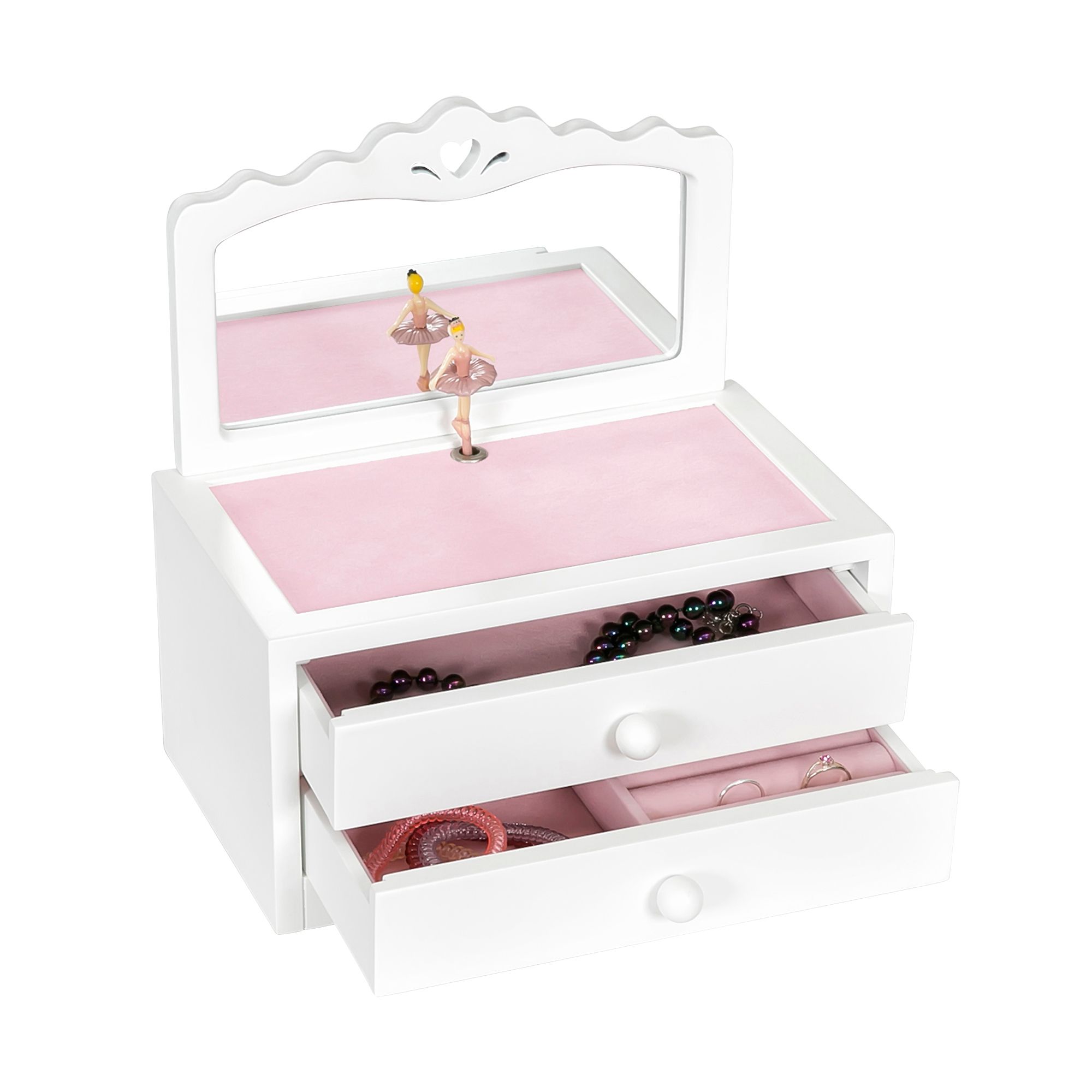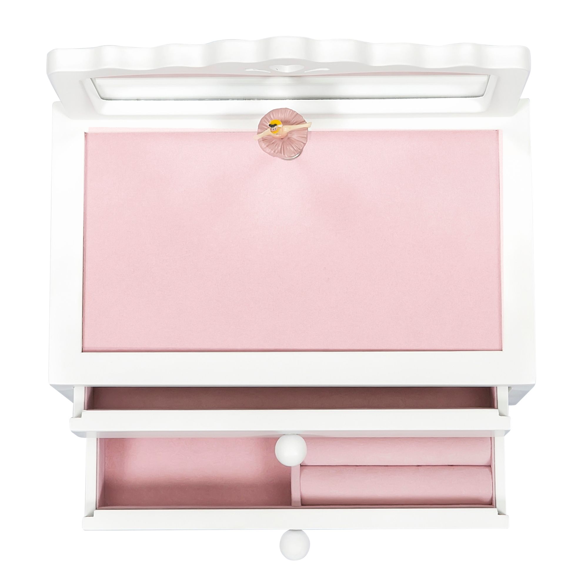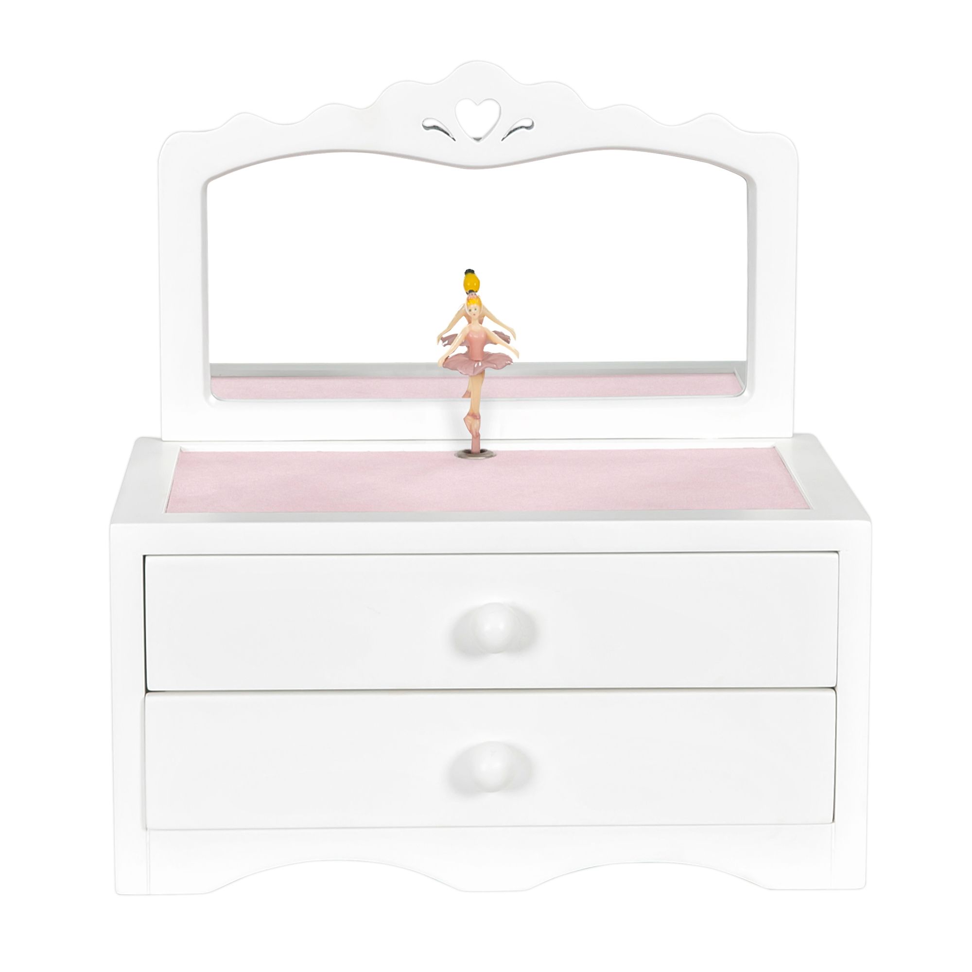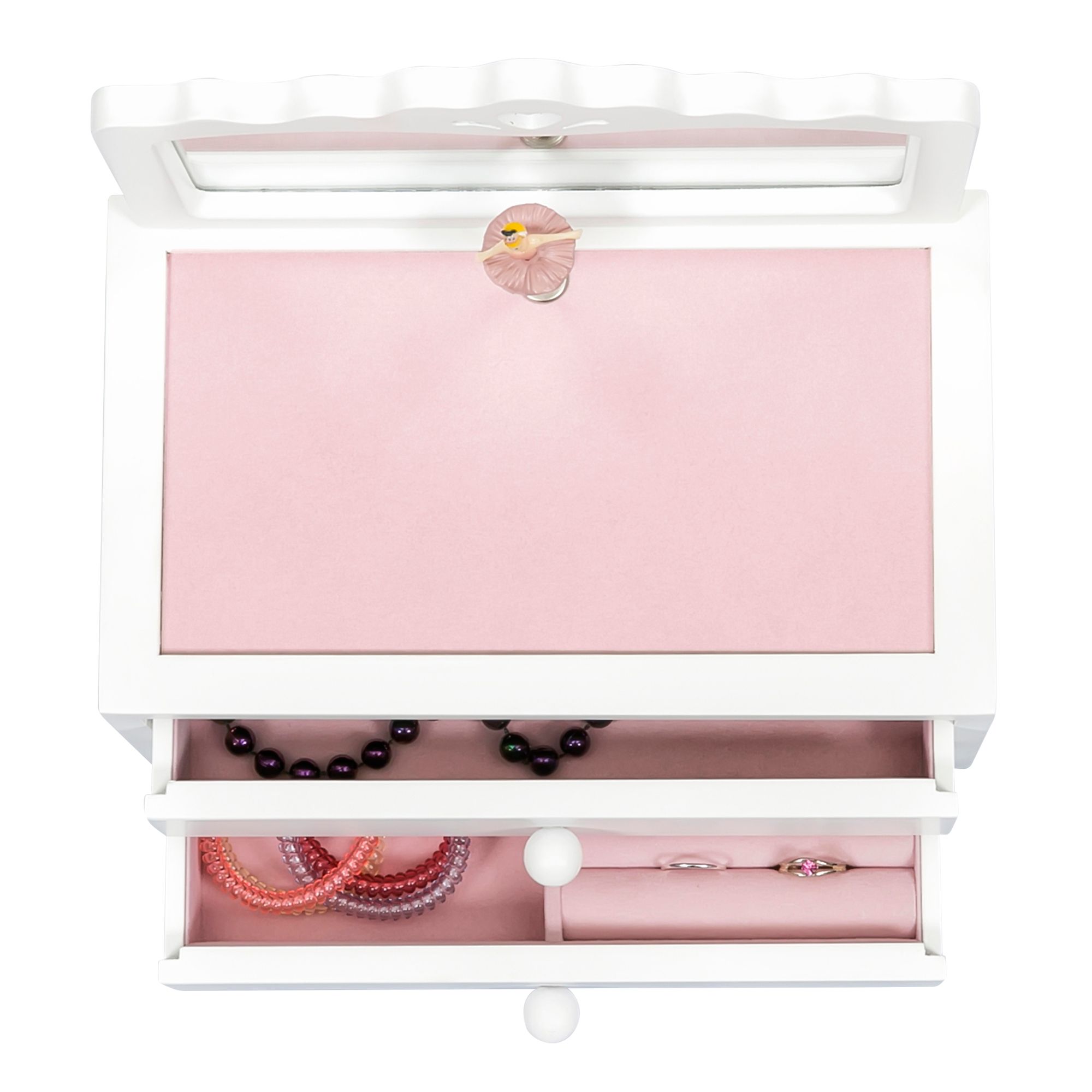 Simply adorable, the Kelby girl's musical ballerina jewelry box is a modern take on a childhood classic. Delicate cut-outs combined with plush pink sueded lining and a twirling ballerina give this jewelry box a fresh retro vibe that will please every tiny trendsetter. It features a scalloped vanity mirror and ring rolls in the bottom drawer.