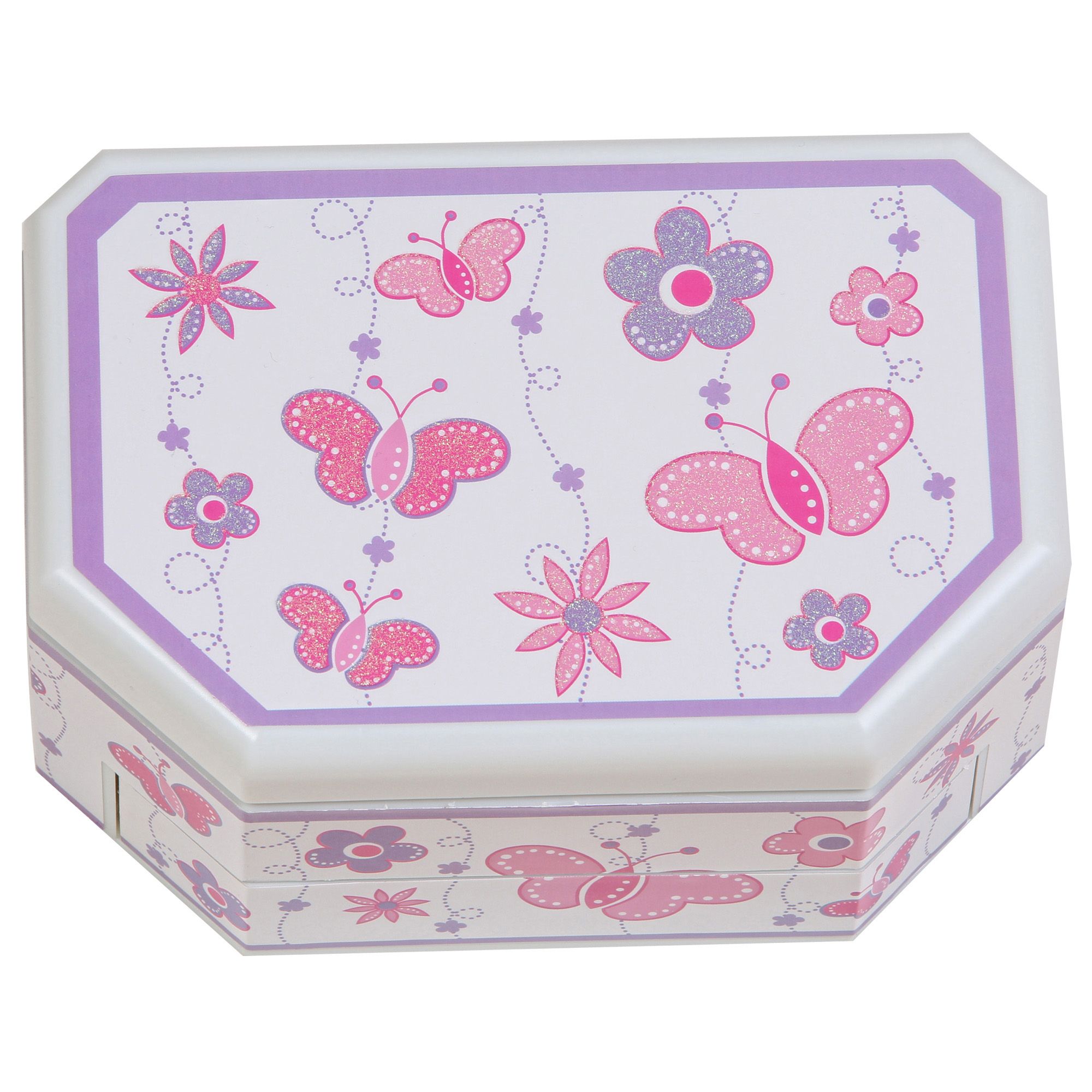 Glittery butterflies and flowery flourishes dance across the Kelsey girl's musical ballerina jewelry box, promising sunny smiles and daydreams. Double mirrors, automatic tray and drawer offer plenty of storage. Plus, a twirling ballerina will capture the imagination of every play time prima ballerina.