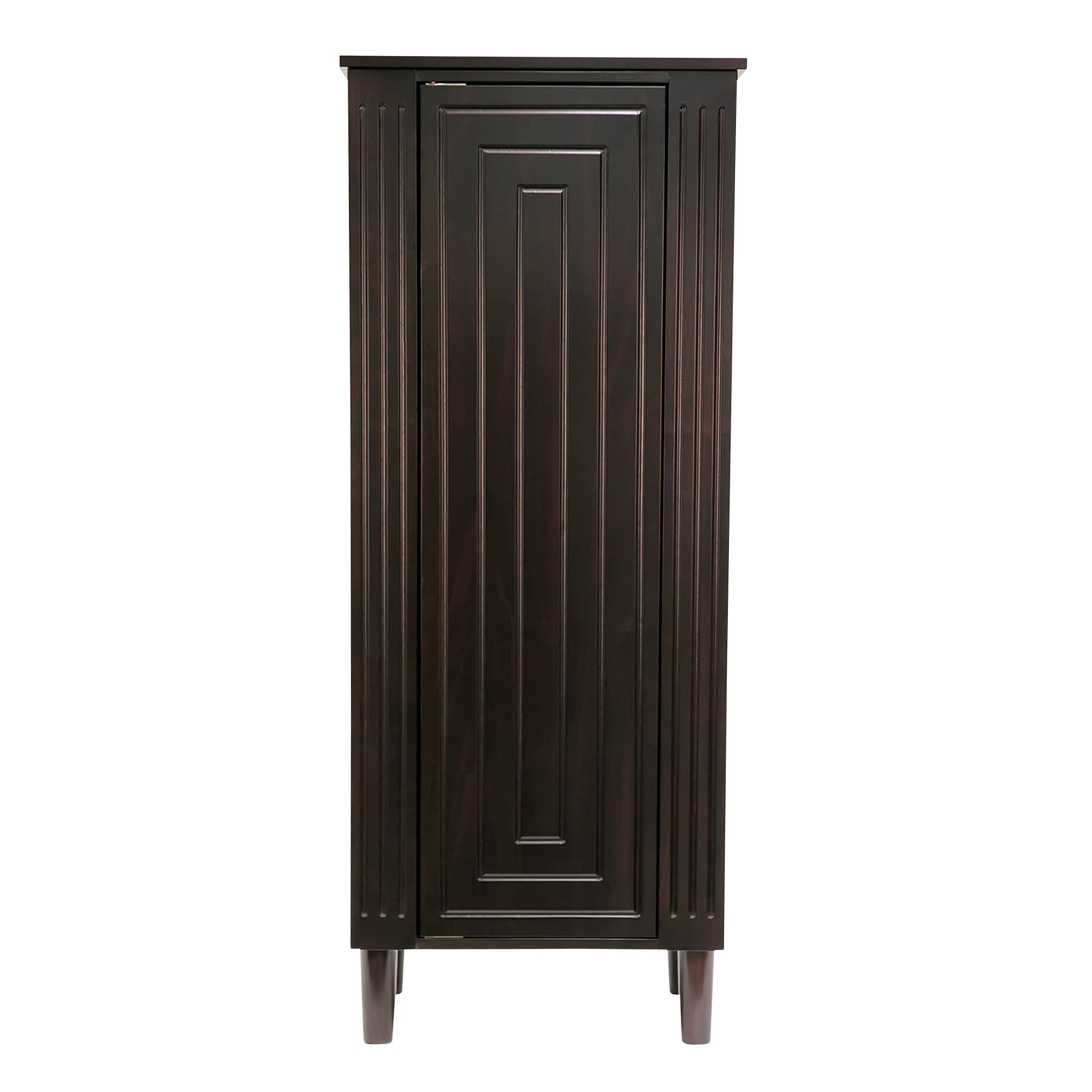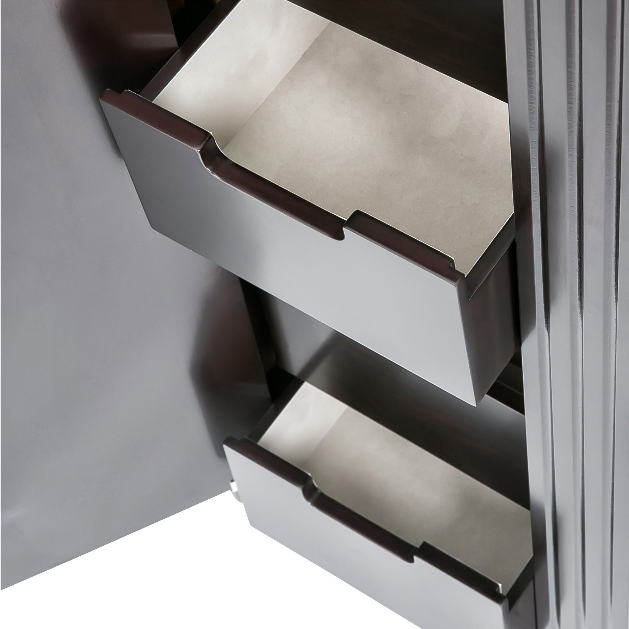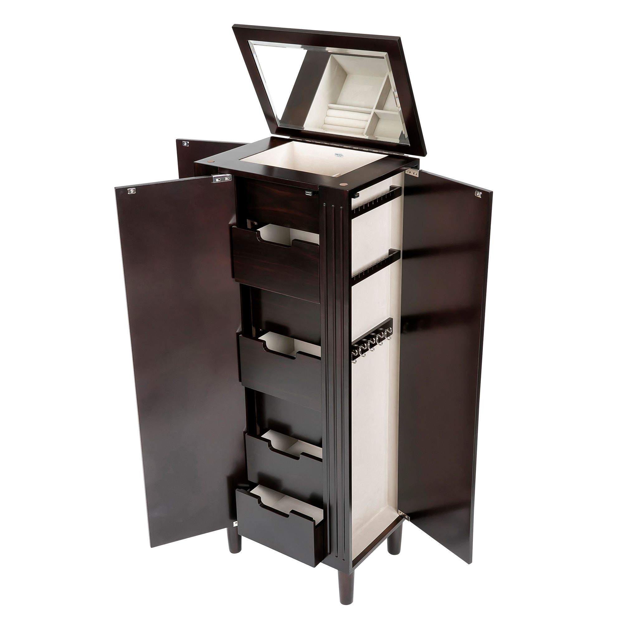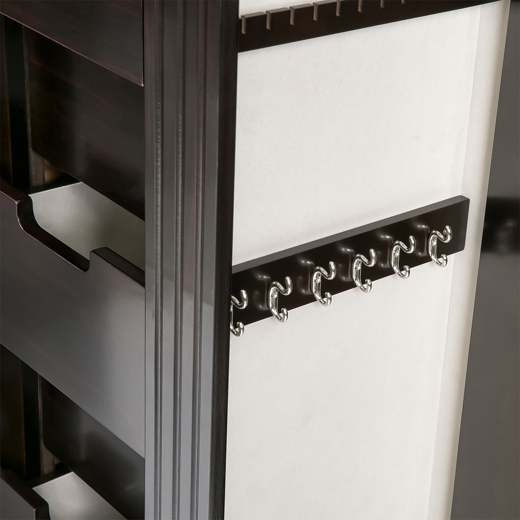 The streamlined geometry of the Sicily jewelry armoire echoes the Art Deco ideal of functional design. Dual side closets incorporate custom necklace and earring storage while the six extra deep drawers can accommodate larger accessories such as scarves, belts and gloves. The java finish brings elegance to the armoire.