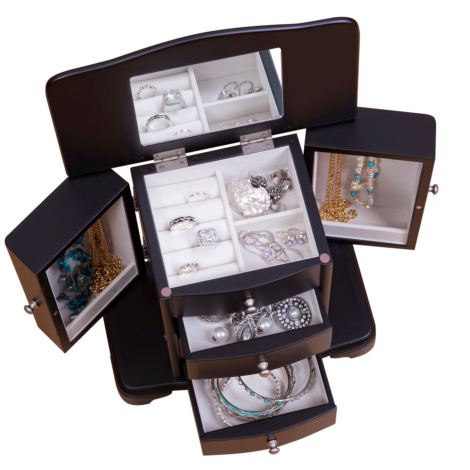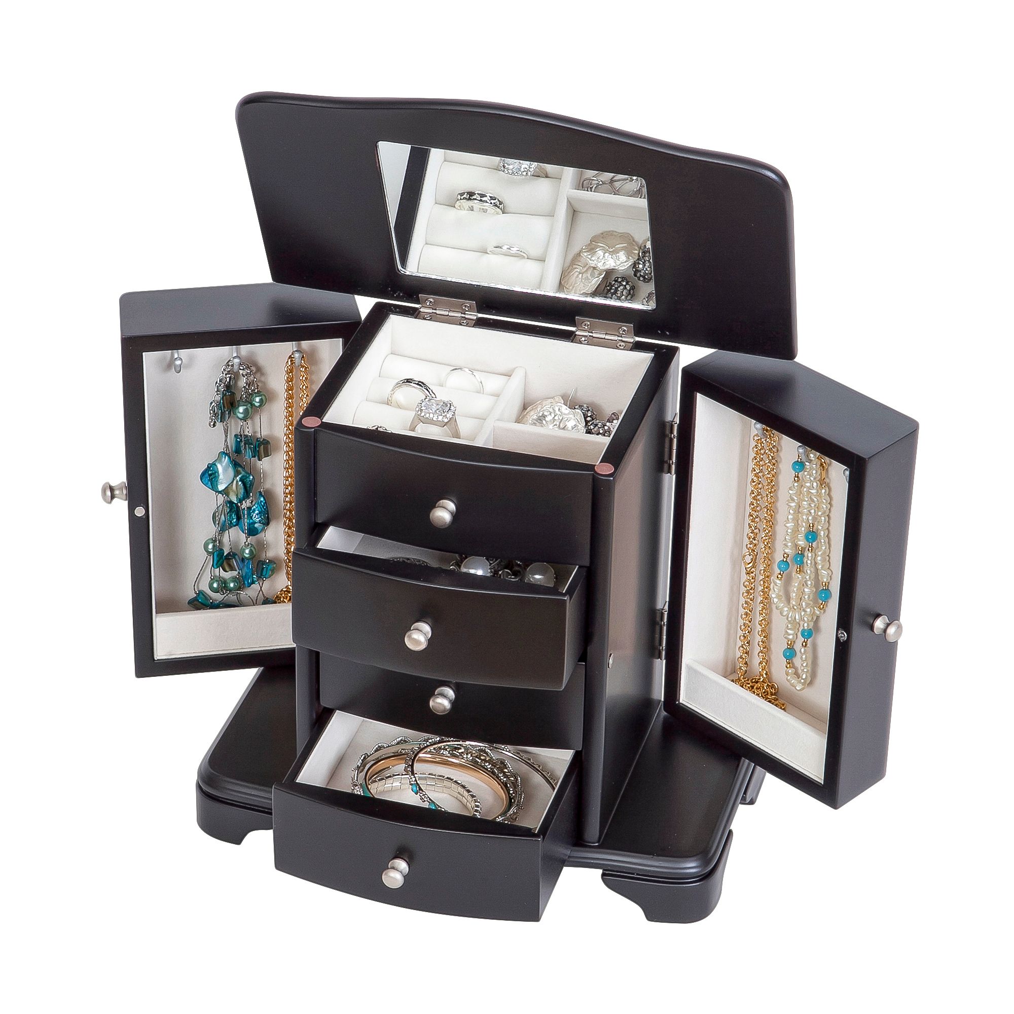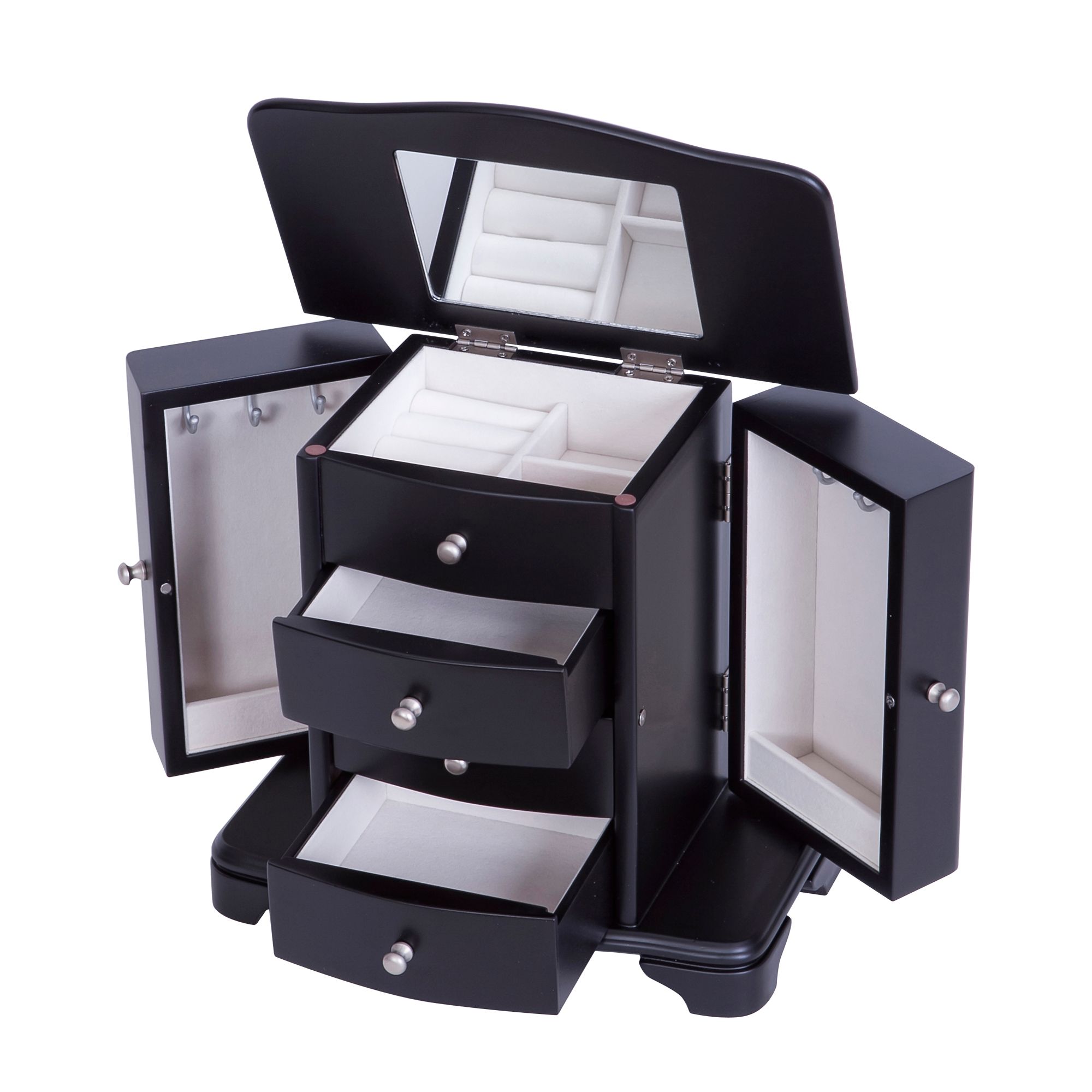 Java finish wooden jewelry box Upright Scroll-footed platform base Lift lid with interior mirror Top compartment has 2 open sections and 1 set of ring rolls 3 open drawers Dual necklace doors feature catch panels and house 3 hooks each, 6 hooks in all Silver tone drawer pulls and hardware Hand lined in ivory sueded fabric Includes jewelry box