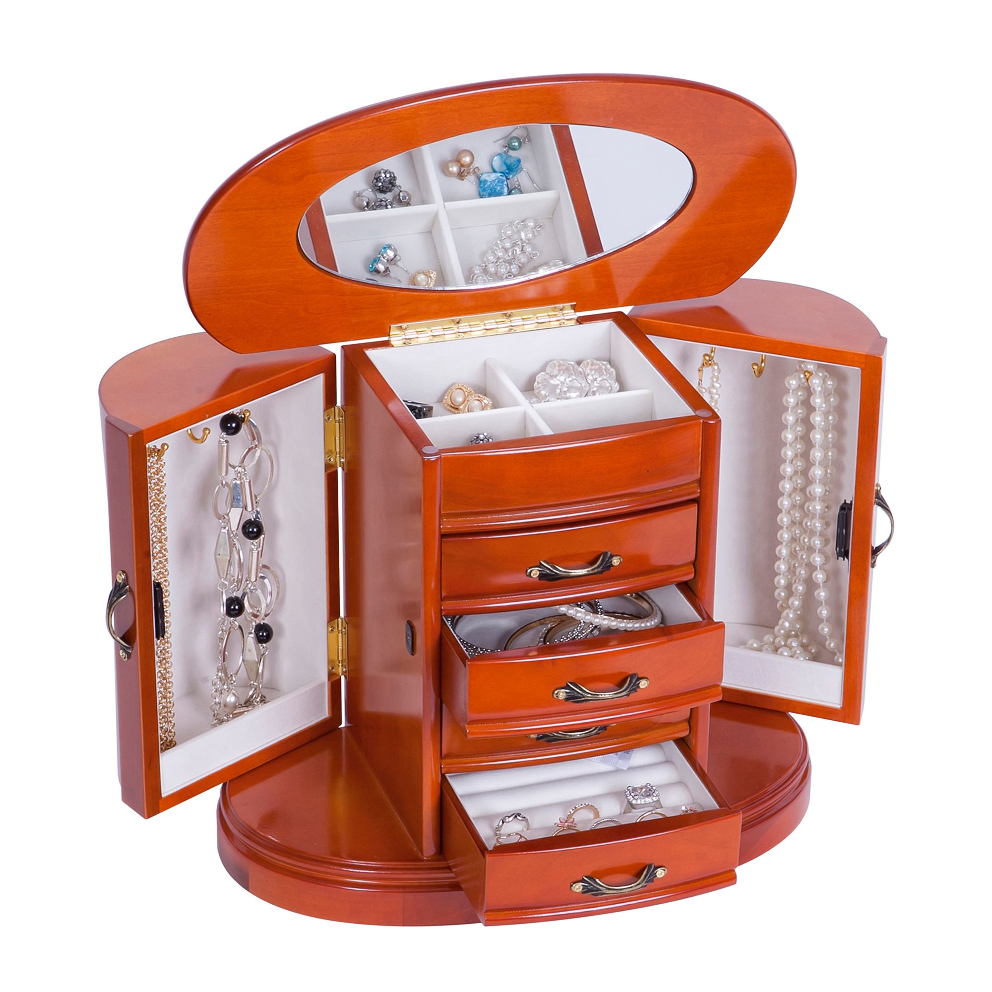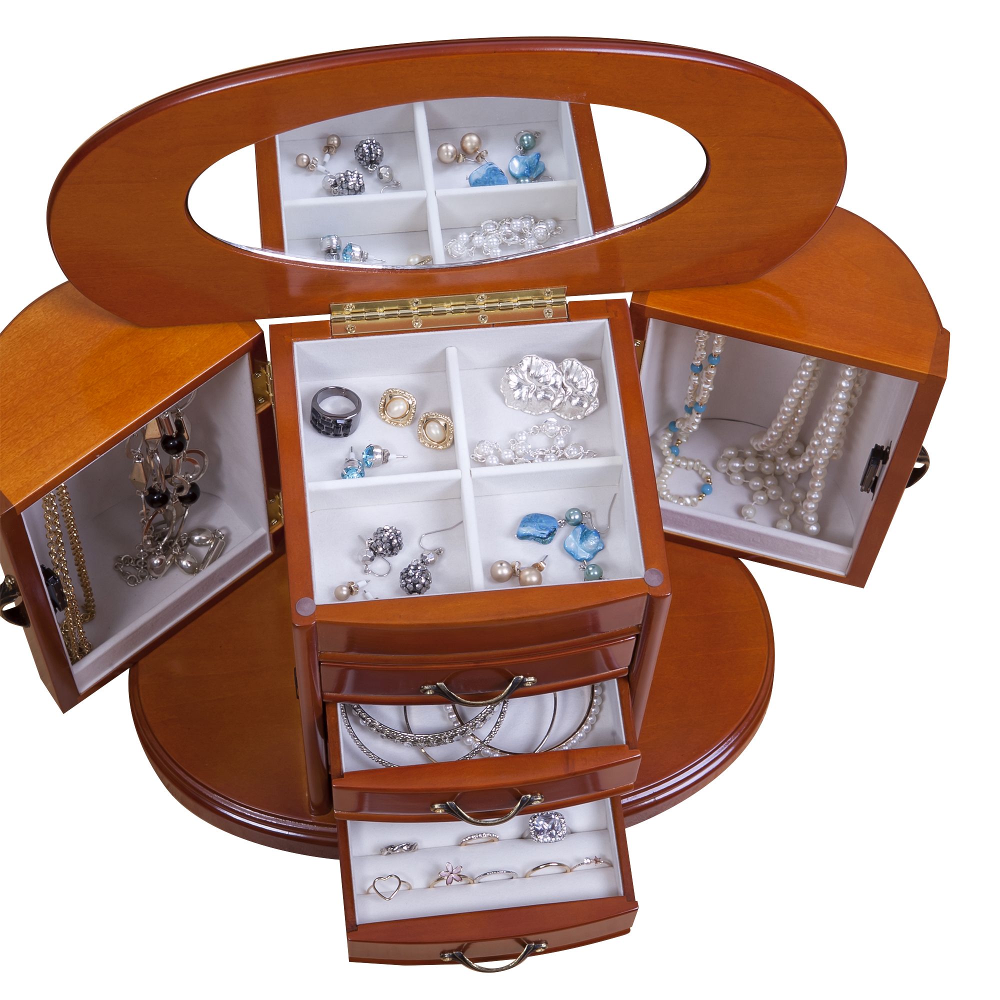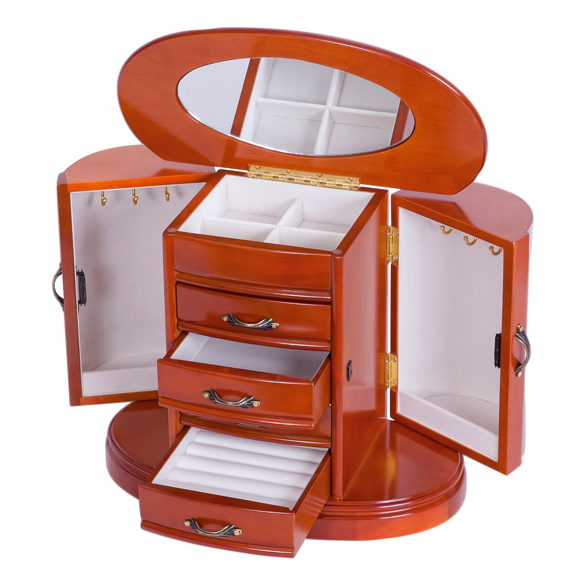 Burlwood oak finish wooden jewelry box Flattened cylindrical shape Platform base Lift lid with oval interior mirror Main compartment features 4 sections Dual necklace doors feature catch panels and house 3 hooks each, 6 in all 3 open drawers plus one ring roll drawer Carved antiqued gold tone door and drawer pulls Hand lined in ivory sueded fabric Includes jewelry box