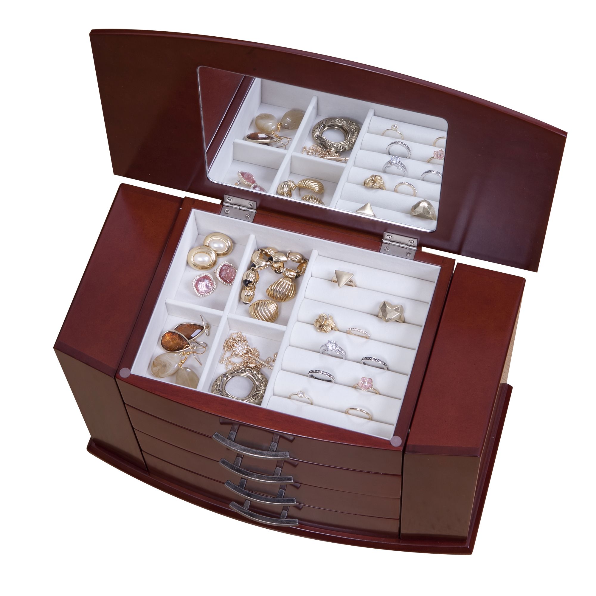 Dark burlwood walnut finish upright wooden jewelry box Rounded front profile Lift lid with interior mirror Top compartment has four open sections and large ring roll section 3 open drawers Dual necklace doors feature catch panels and house 4 hooks each, 8 in all Antiqued pewter tone drawer pulls and hardware Hand lined in ivory sueded fabric Includes jewelry box