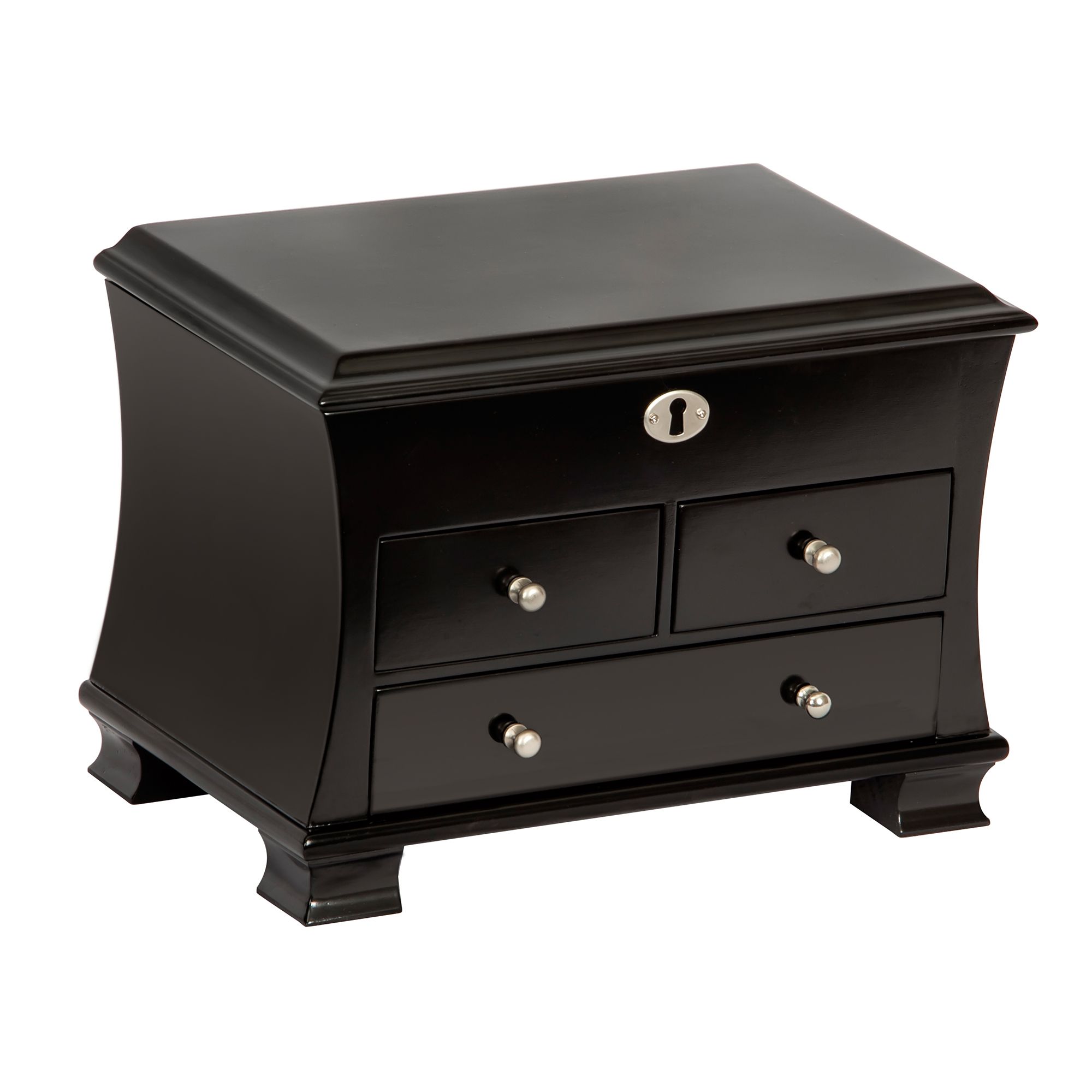 Cleverly contoured, the Mele Designs Westbrook jewelry box melds modern style with eastern flair. Offering three drawers and a full interior mirror, this jewelry chest is fabulous and functional.