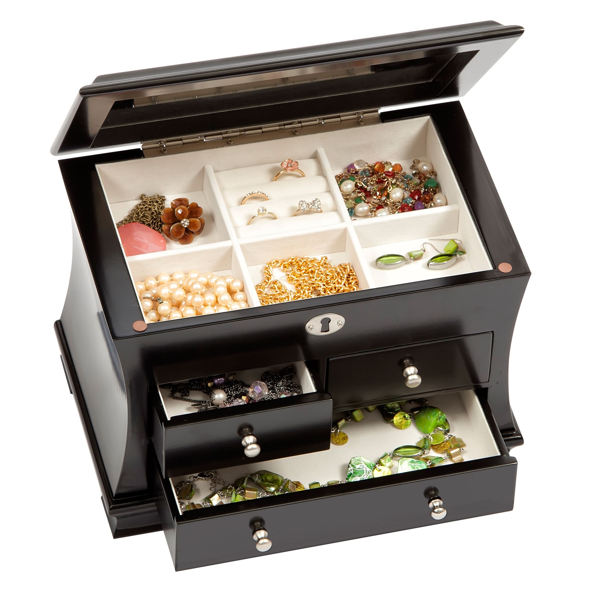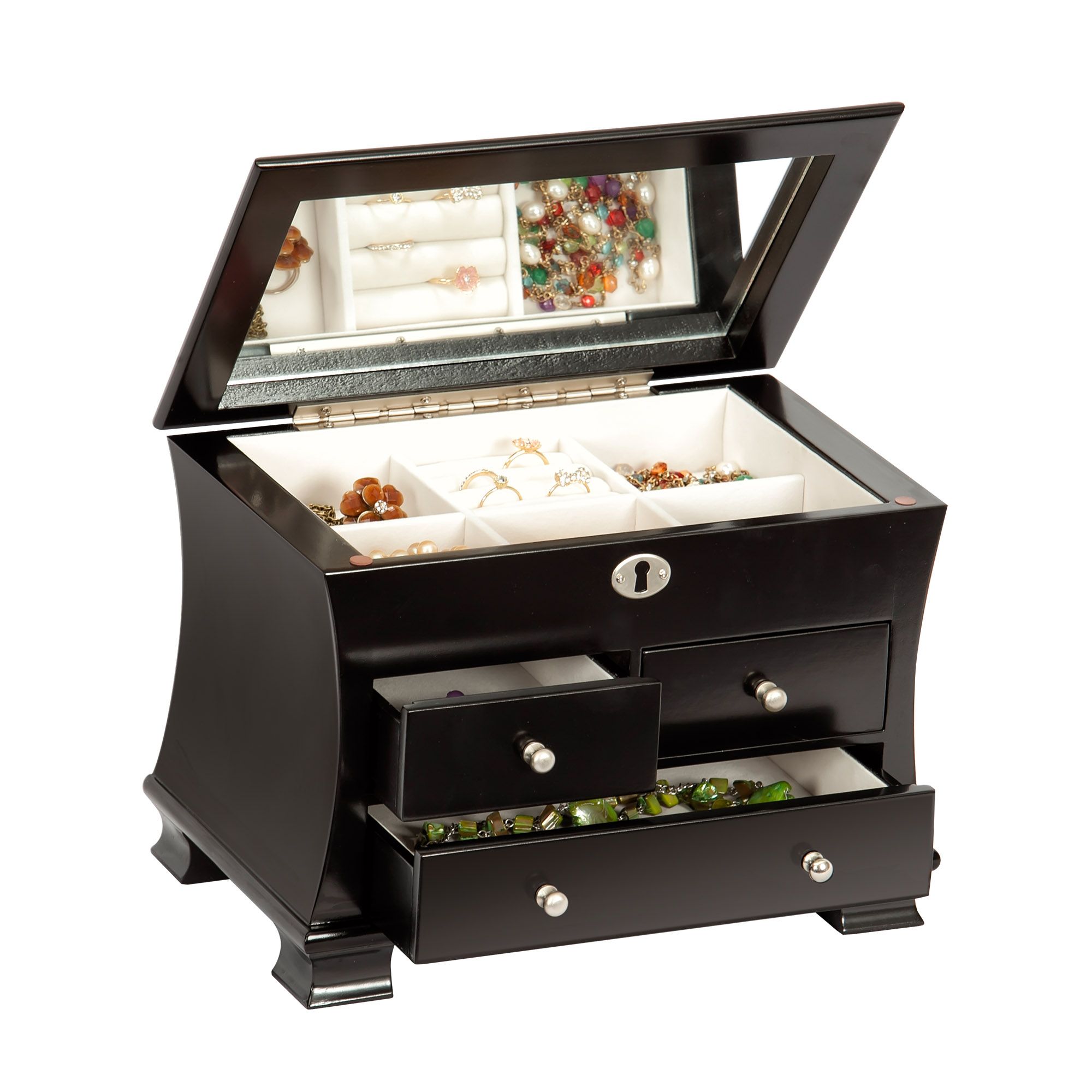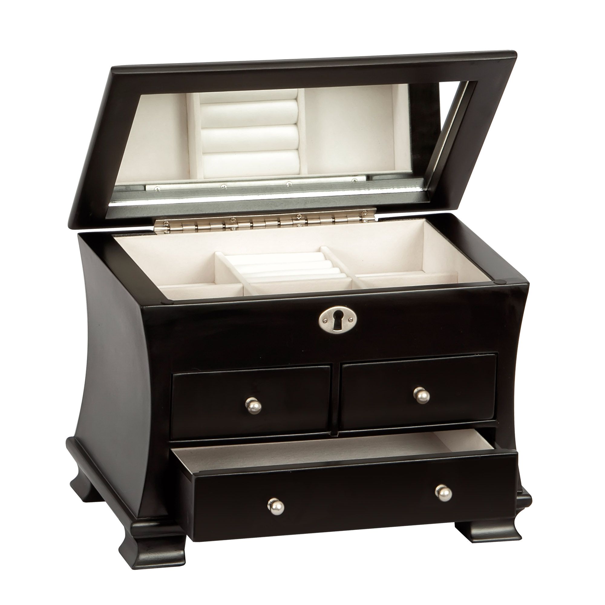 Java finish wooden jewelry box Gracefully curved sides Footed platform base Lift lid with full interior mirror Ring rolls 5 equally sized sections 2 side-by-side drawers Large bottom drawer with open area storage Silver tone faux lock and hardware Hand lined in ivory sueded fabric Includes jewelry box