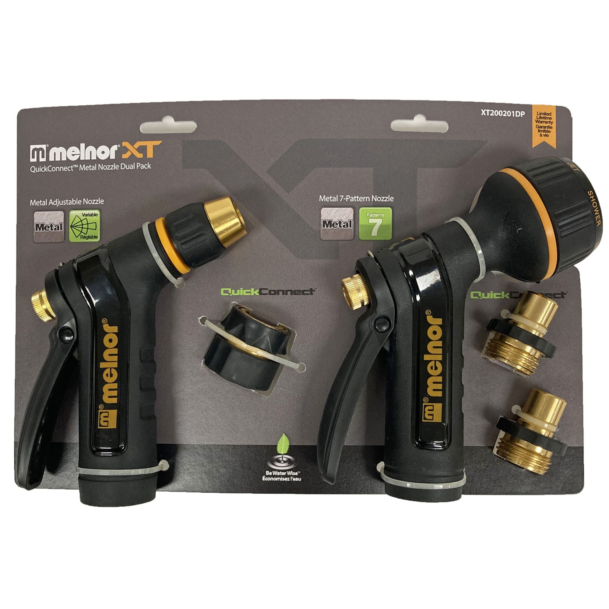 Dual pack nozzle and quick connect set is great for all watering applications Metal XT seven pattern nozzle provides for a wide range of watering applications Metal XT adjustable tip nozzle is great for cleaning applications Nozzles are both comfortable and slip resistant Quick connect set allows for a comfortable and easy switch between nozzles Set is part of Melnor's "XT" line, which is the most durable line of products they have Includes XT adjustable tip nozzle, multi-pattern nozzle, two metal product adapters, and a metal product adapter with a water stop