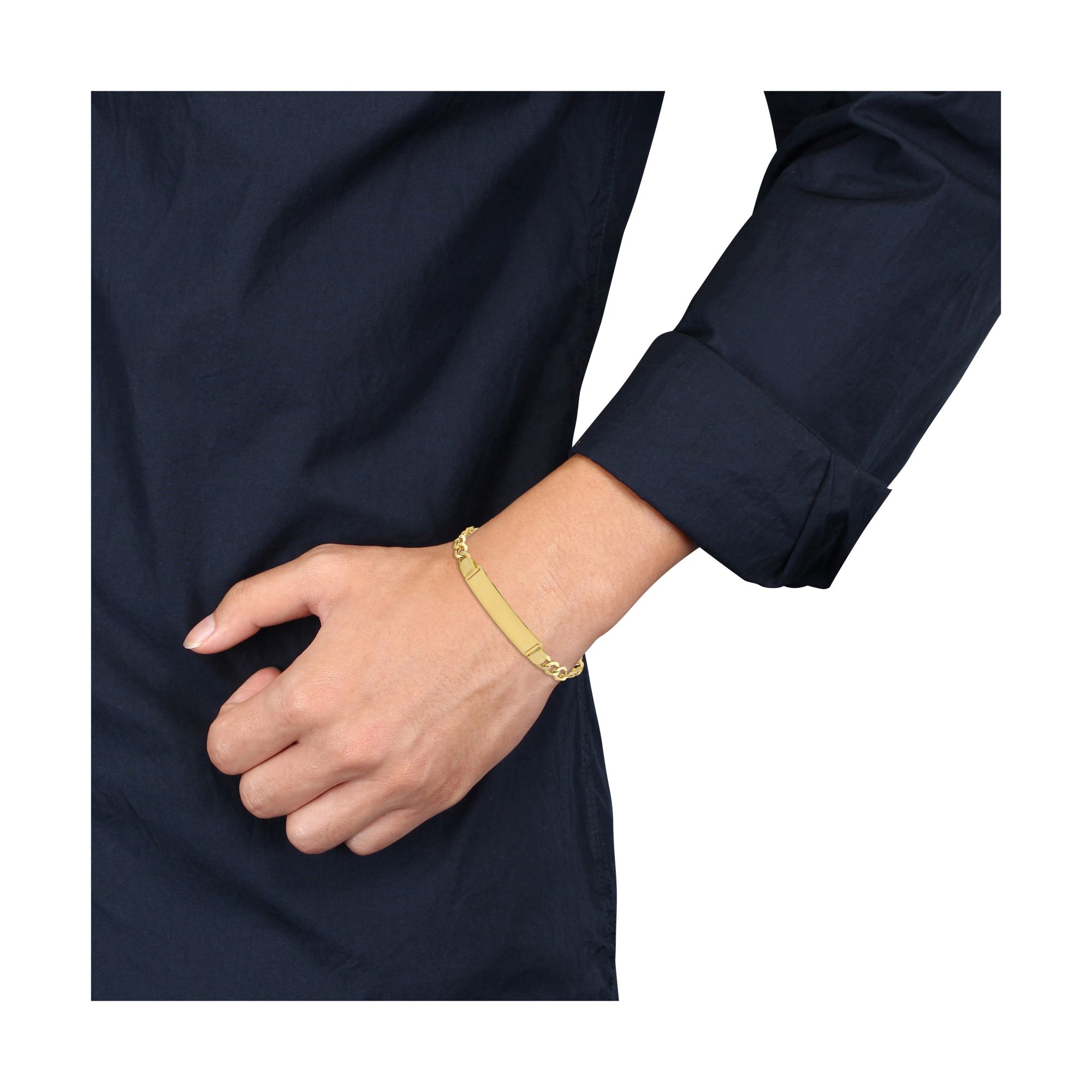 Make a style statement with this Men's Figaro ID Bar Bracelet. Crafted in twinkling yellow gold, this bracelet features a bar at the center connected with Figaro chain and secures with a lobster clasp. Enhanced with a high polish finish, this 8-inch long, 8mm width ID bracelet is a simple and classic piece that is an essential part of every accessory collection.