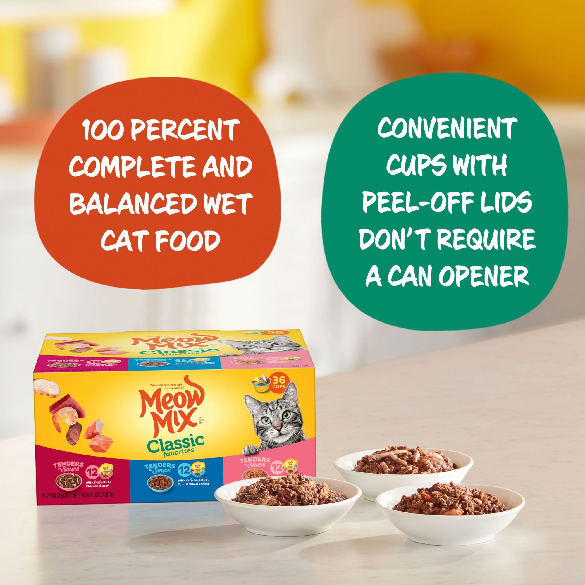 The irresistible appeal of Meow Mix cat food, The Only One Cats Ask for by Name Contains 36 cups total (2.75 oz. each) of Meow Mix wet cat food in three (3) flavors