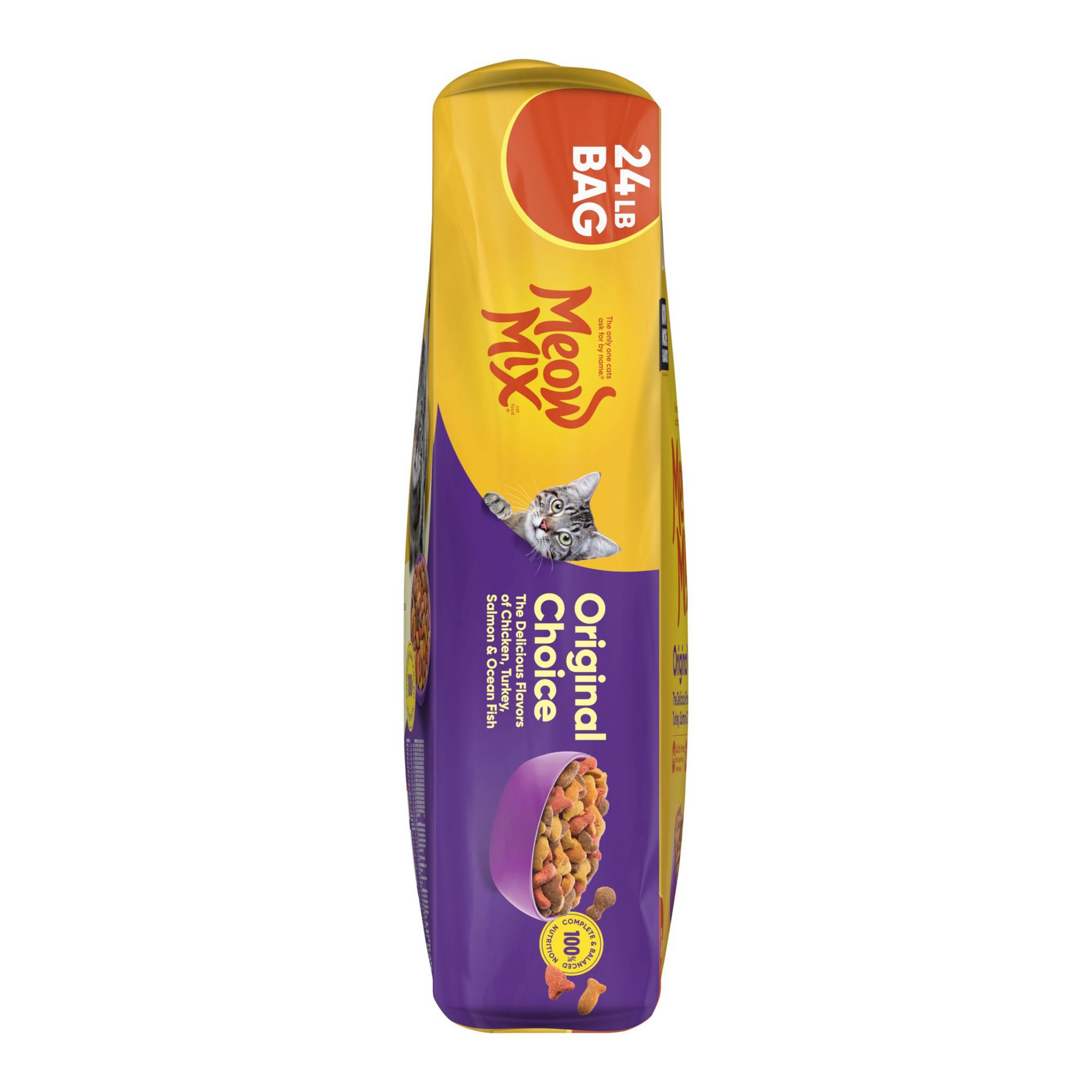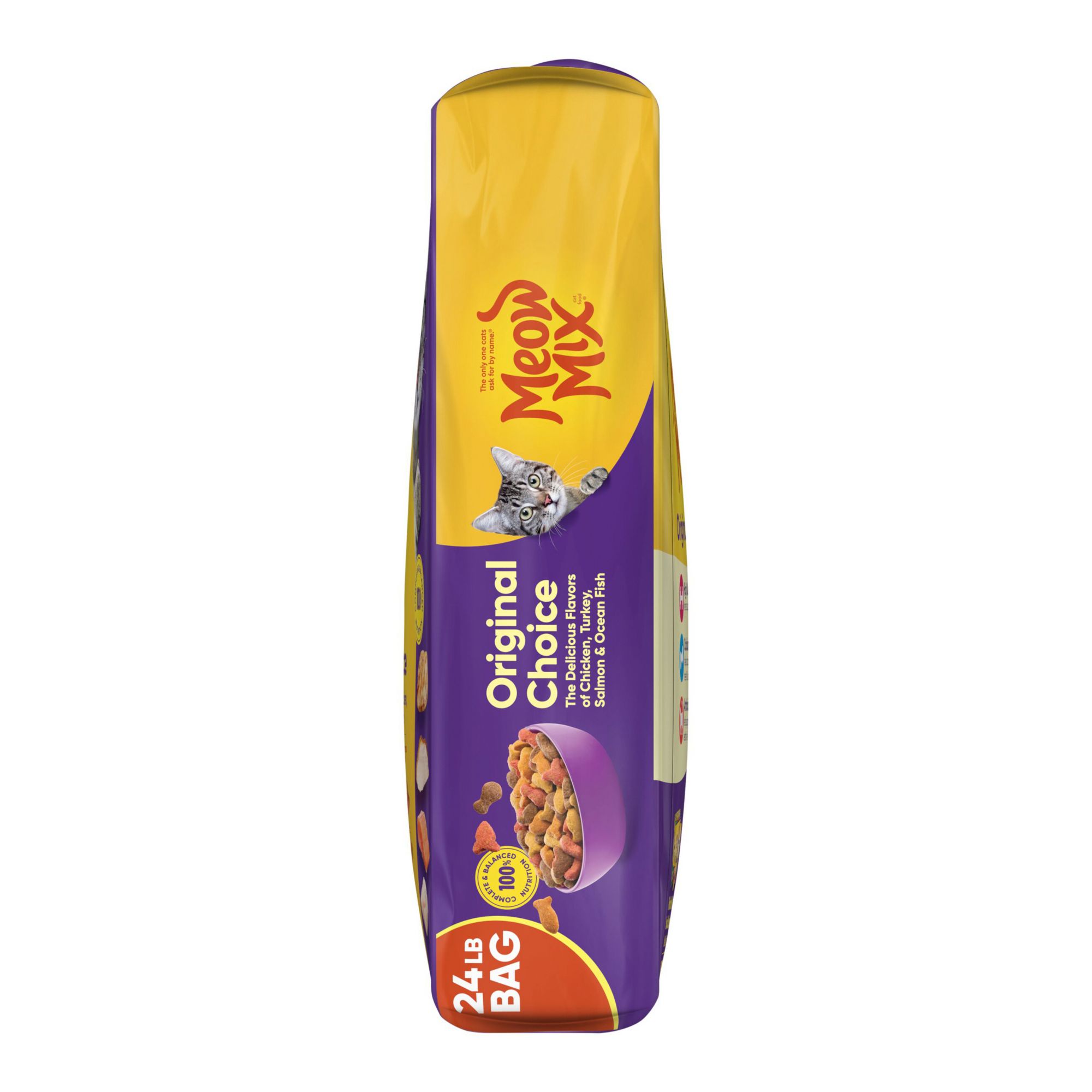 Produced in the U.S.A. from globally sourced ingredients Contains one (1) 24 lb. bag of Meow Mix Original Choice Dry Cat Food, now with a new look