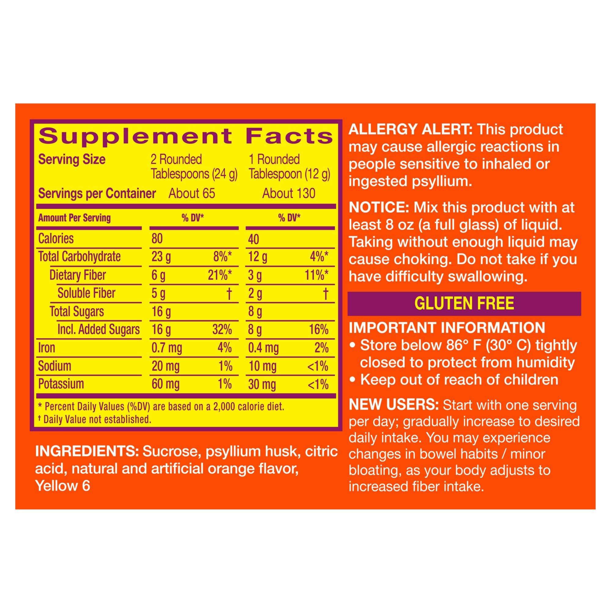 Sucrose, Psyllium Husk, Citric Acid, Natural And Artificial Orange Flavor, Yellow 6