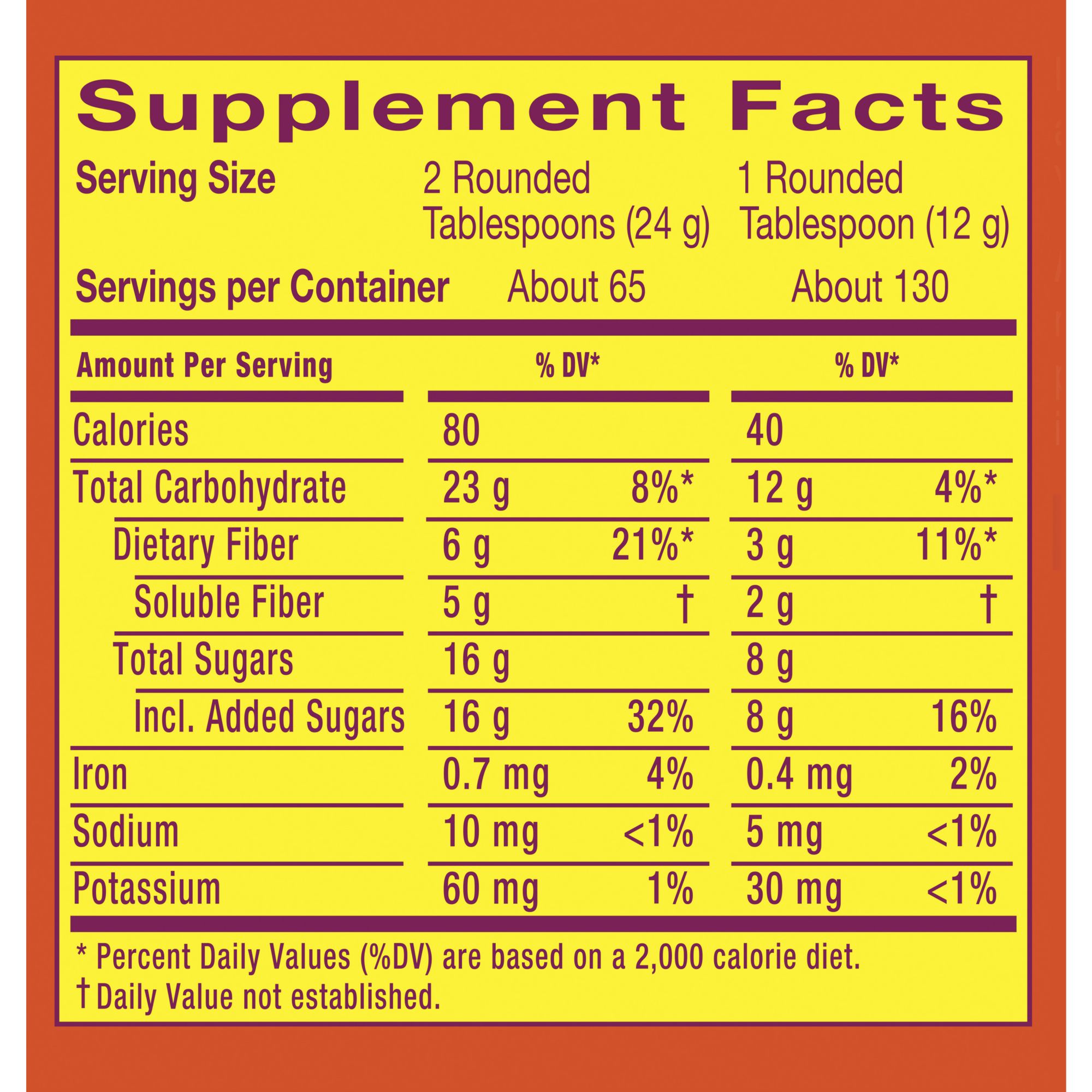 Ingredients: Sucrose, Psyllium Husk, Citric Acid, Natural And Artificial Orange Flavor, Yellow 6.