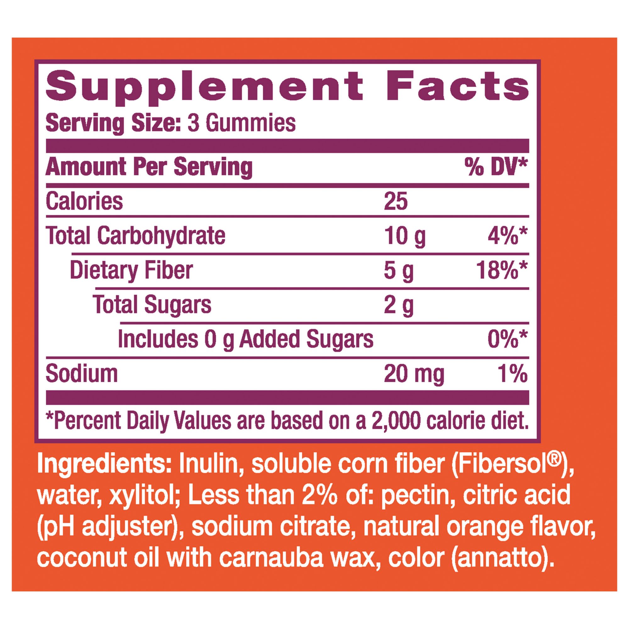 Ingredients: Inulin, Soluble Corn Fiber (Fibersol), Water, Xylitol, Less Than 2% Of: Pectin, Citric Acid (Ph Adjuster), Sodium Citrate, Natural Orange Flavor, Coconut Oil With Carnauba Wax, Color (Annatto)