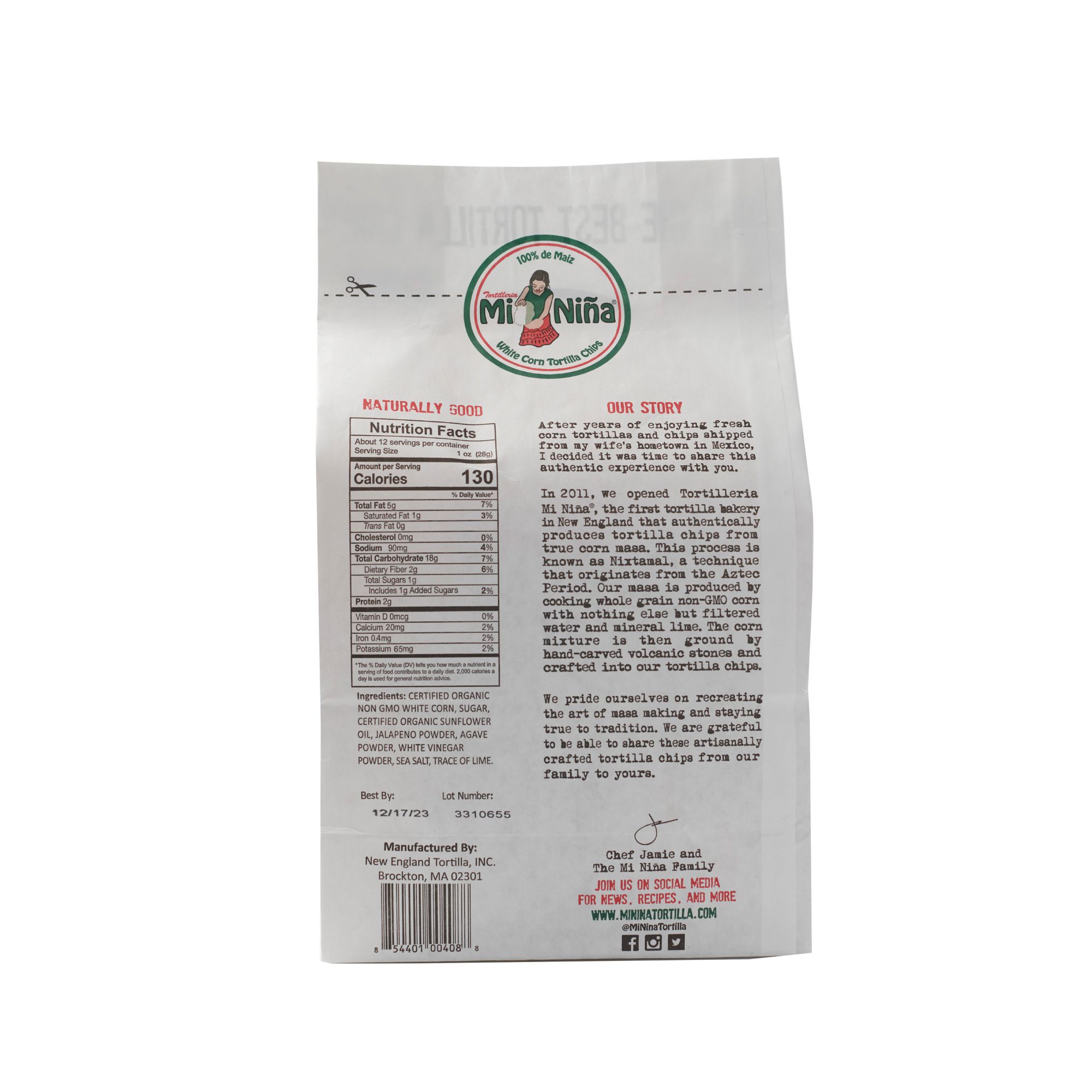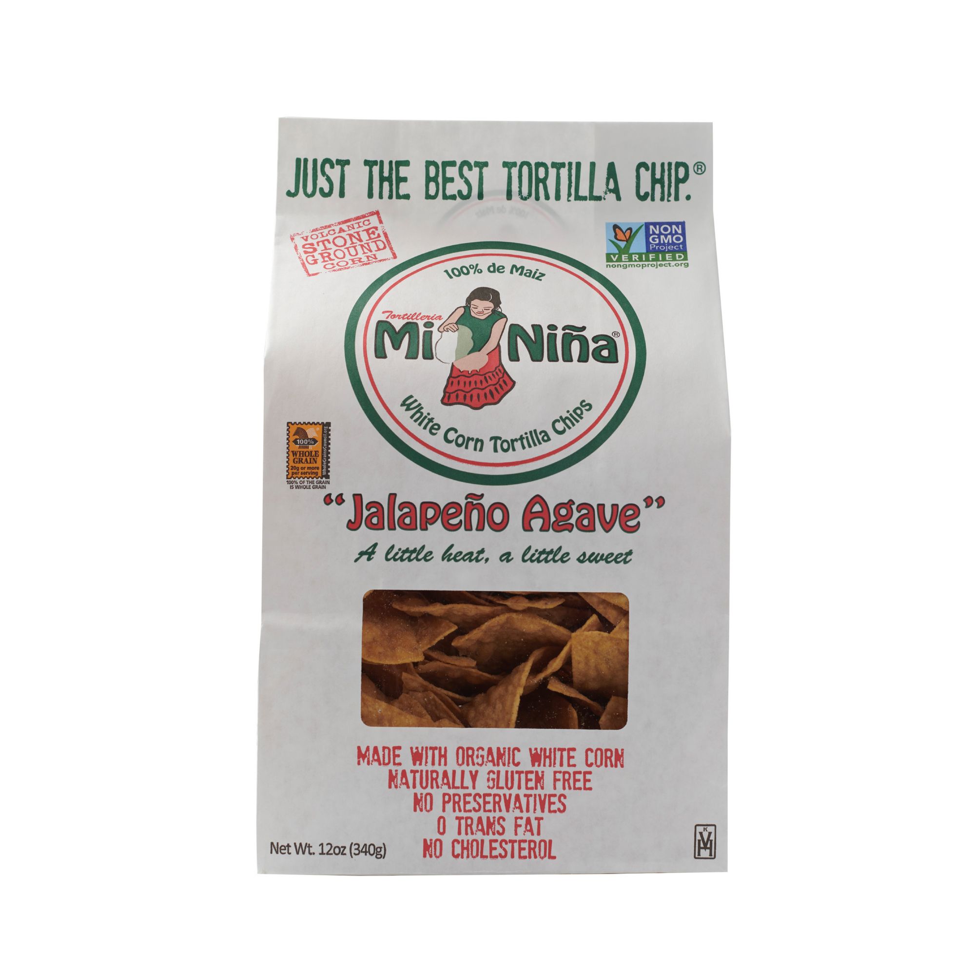 Mi Nina Jalapeno Agave Tortilla Chips use only organic non-GMO white corn. The Mi Nina process uses a technique created during the Aztec period in Mexico using hand carved volcanic stones to grind the corn into maze. Mi Nina product attributes are, non-GMO, no preservatives, gluten free, Kosher, USDA Certified and no trans fats.