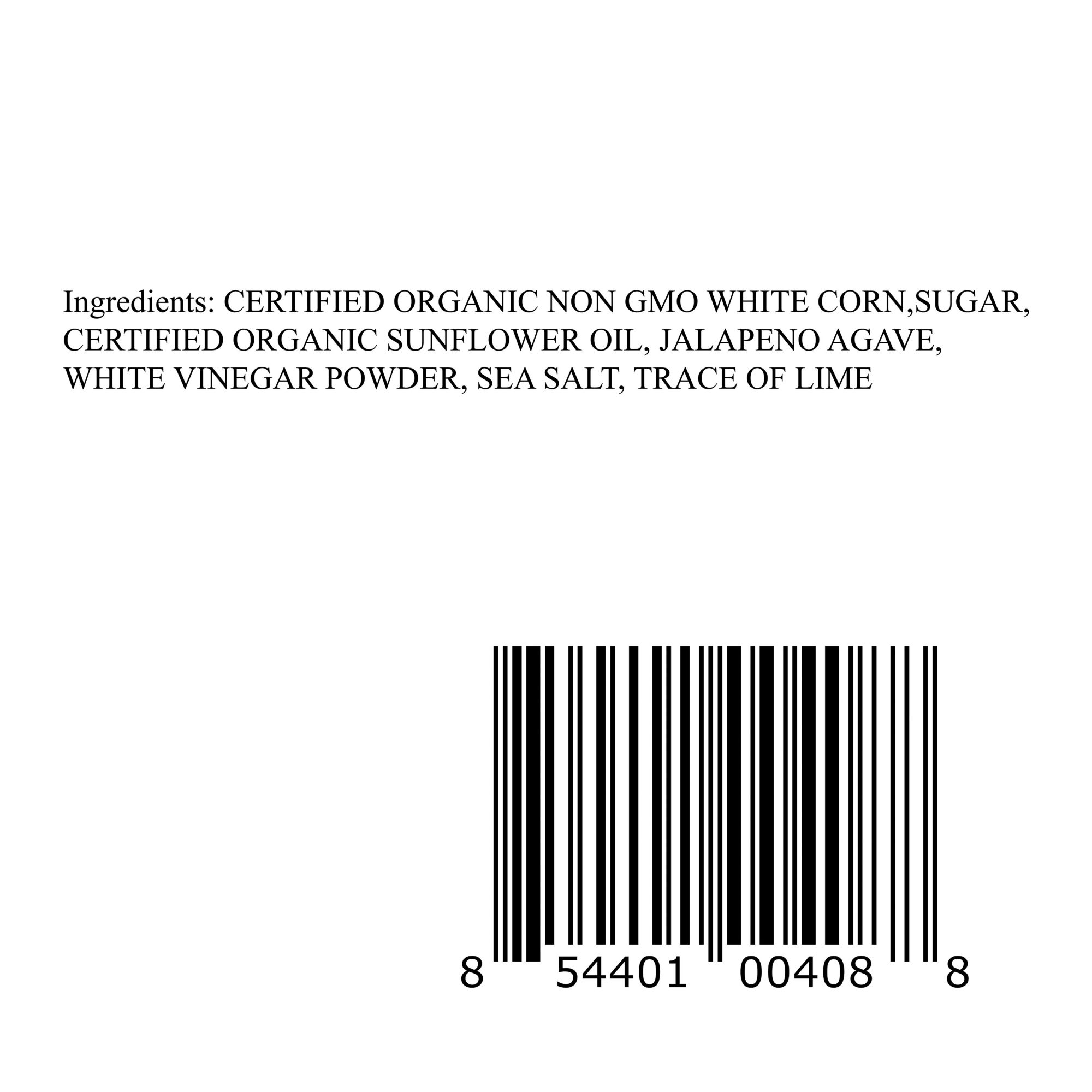 Ingredients Non-GMO White Corn, Certified Organic Sunflower Oil, Sea Salt, Jalapeno Powder, Agave Powder, White Vinegar Powder, Sugar, Trace of Lime.