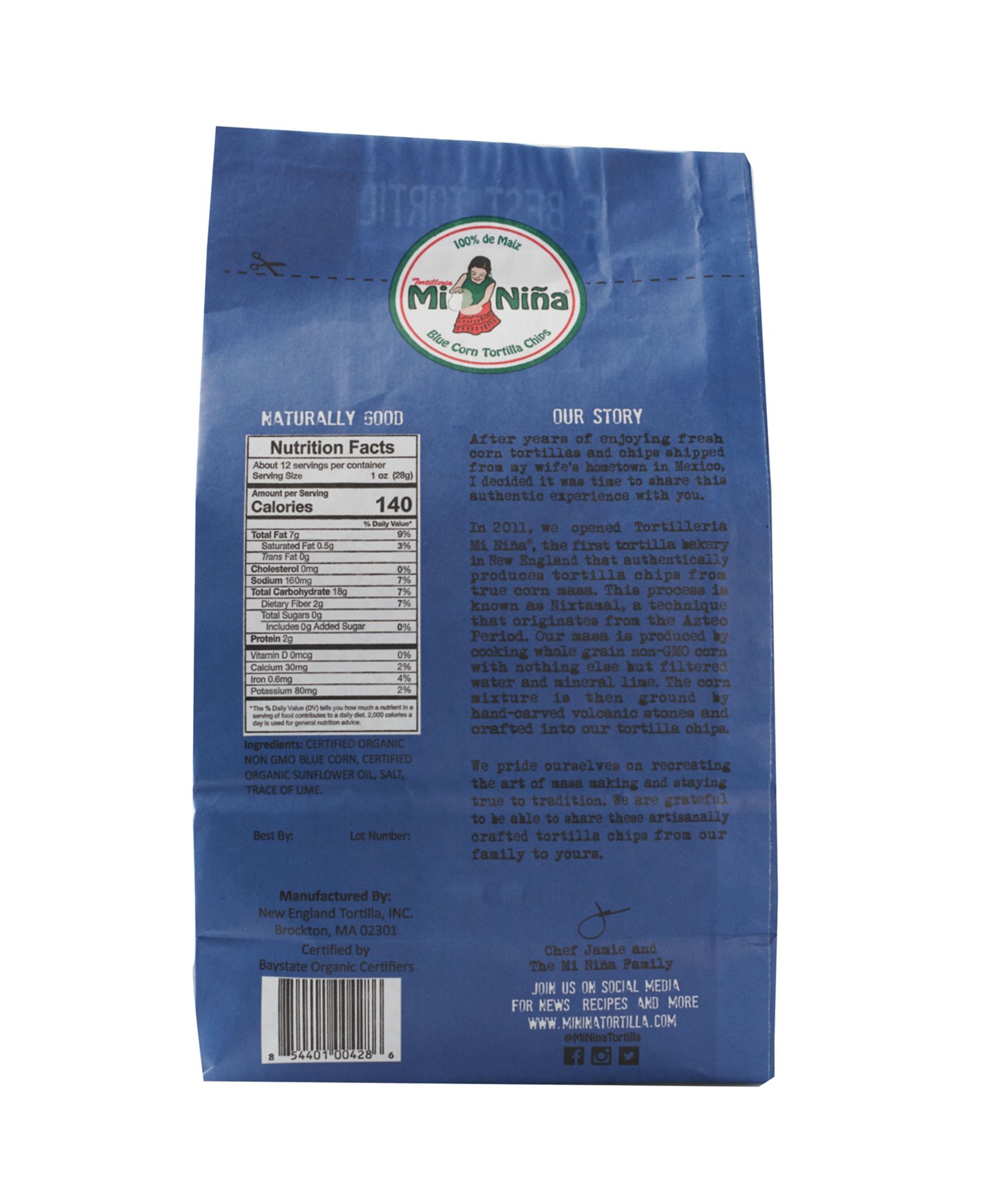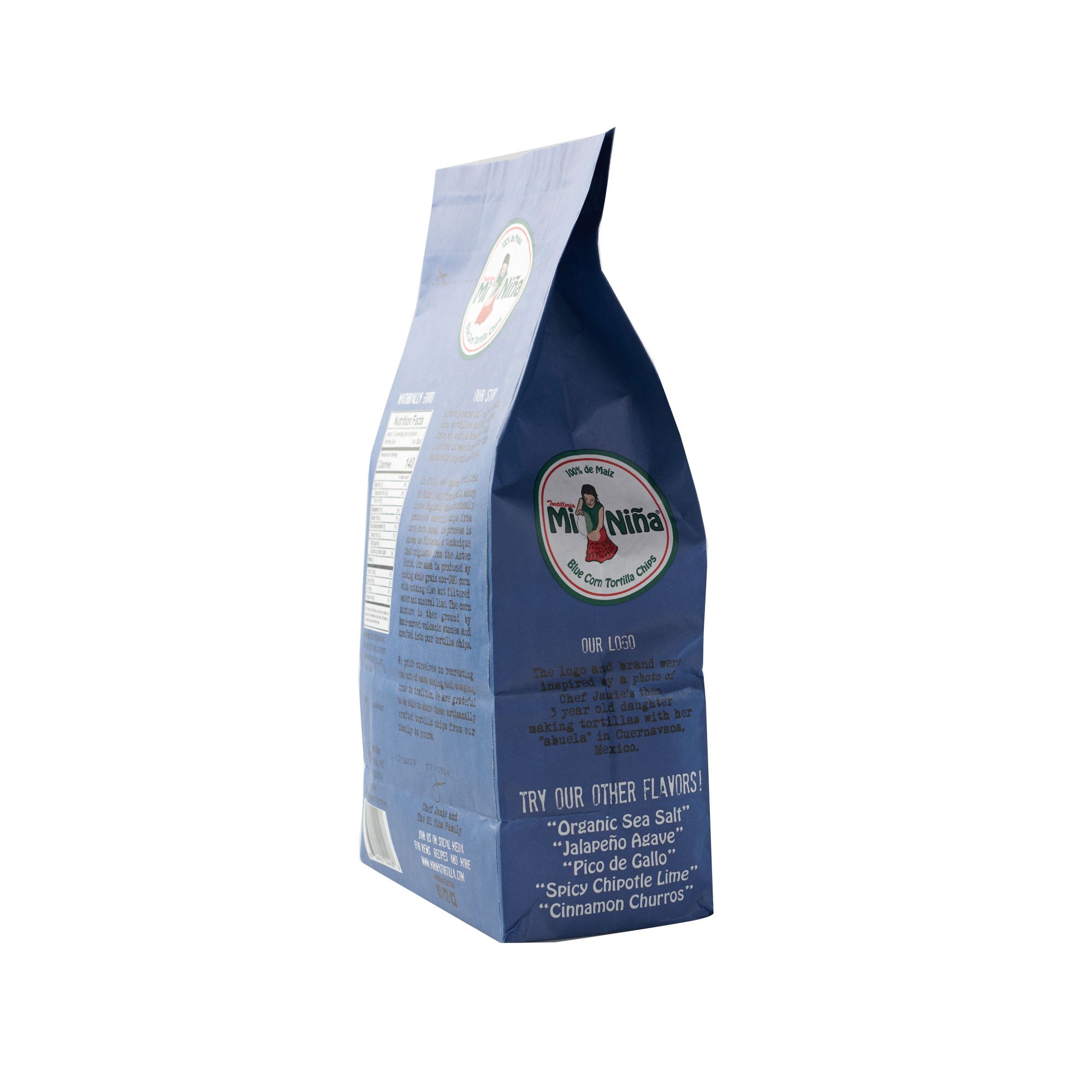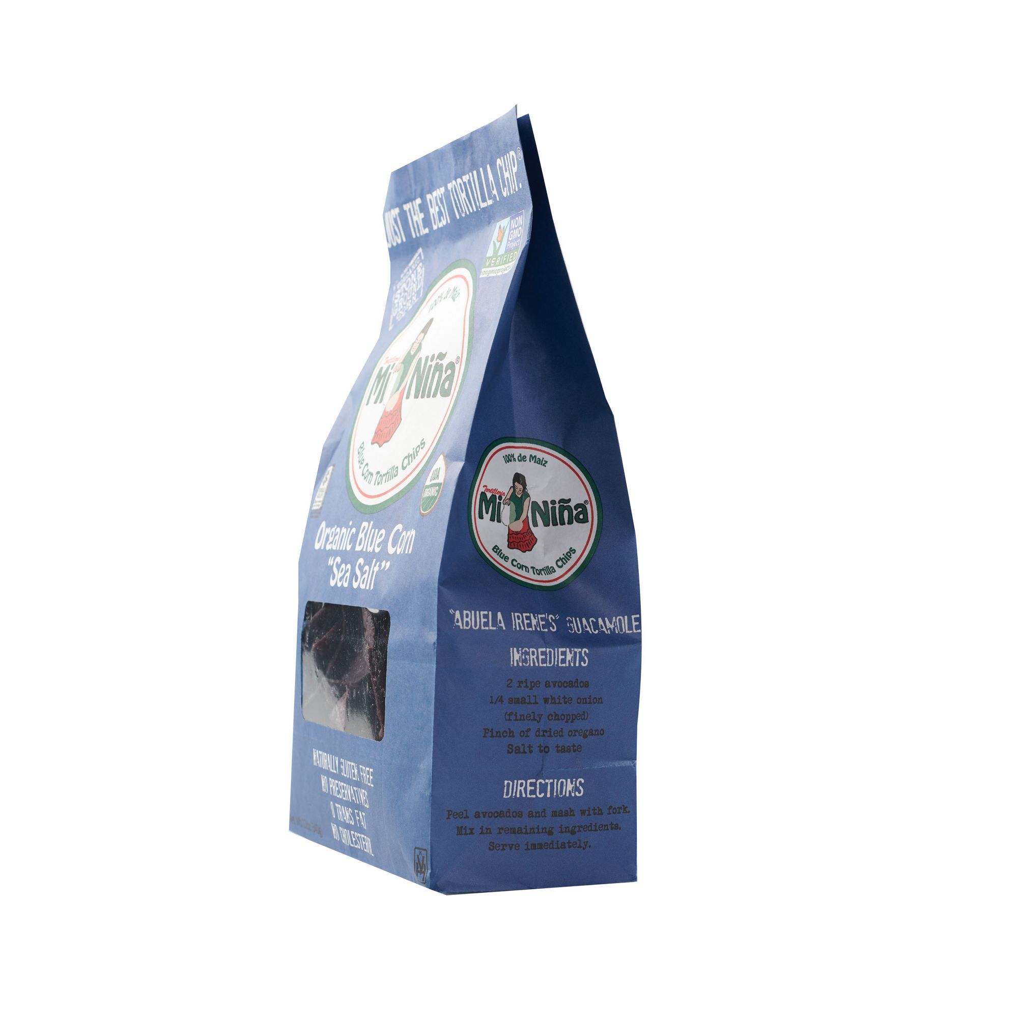 Mi Nina Organic Blue Corn Tortilla Chips use only organic non-GMO blue corn and are 100% USDA Organic Certified. The Mi Nina process uses a technique created during the Aztec period in Mexico using hand carved volcanic stones to grind the corn into maze. Mi Nina products are Non-GMO, made with no preservatives, gluten-free, Kosher, USDA Certified and no Trans Fats.