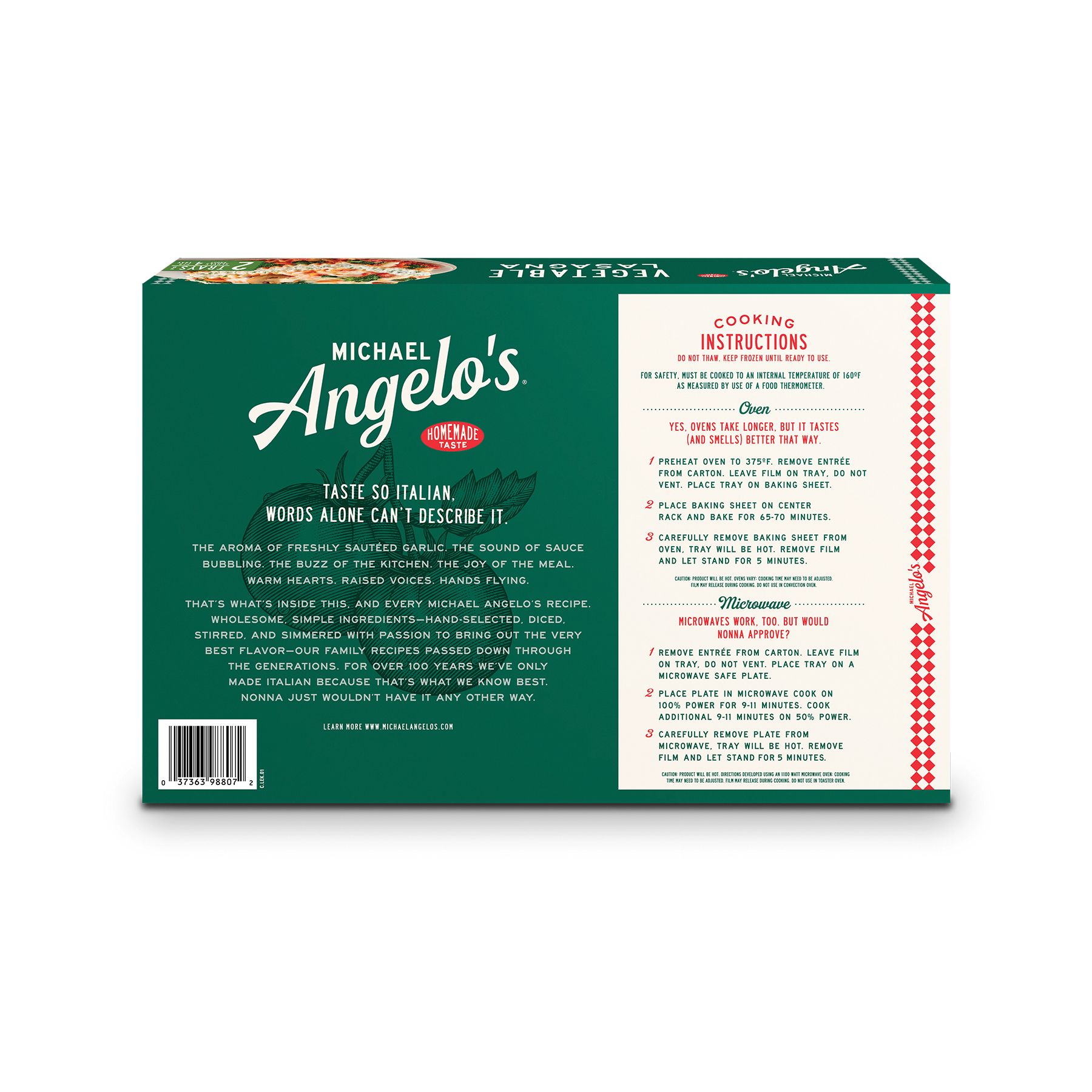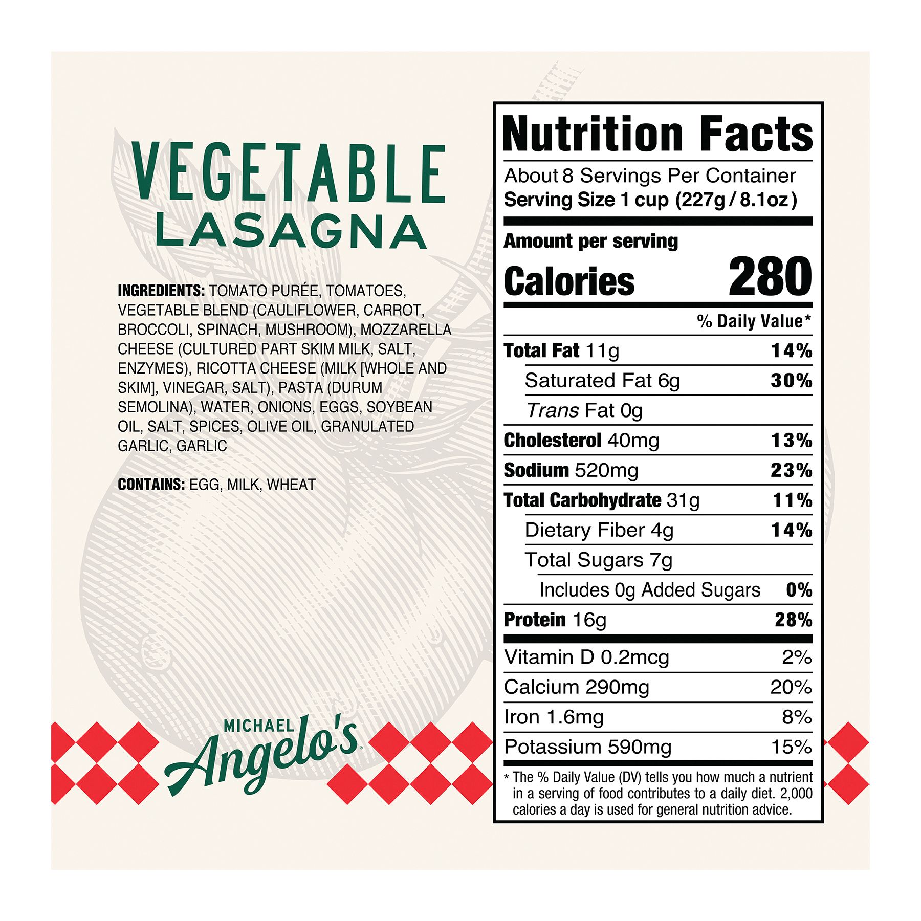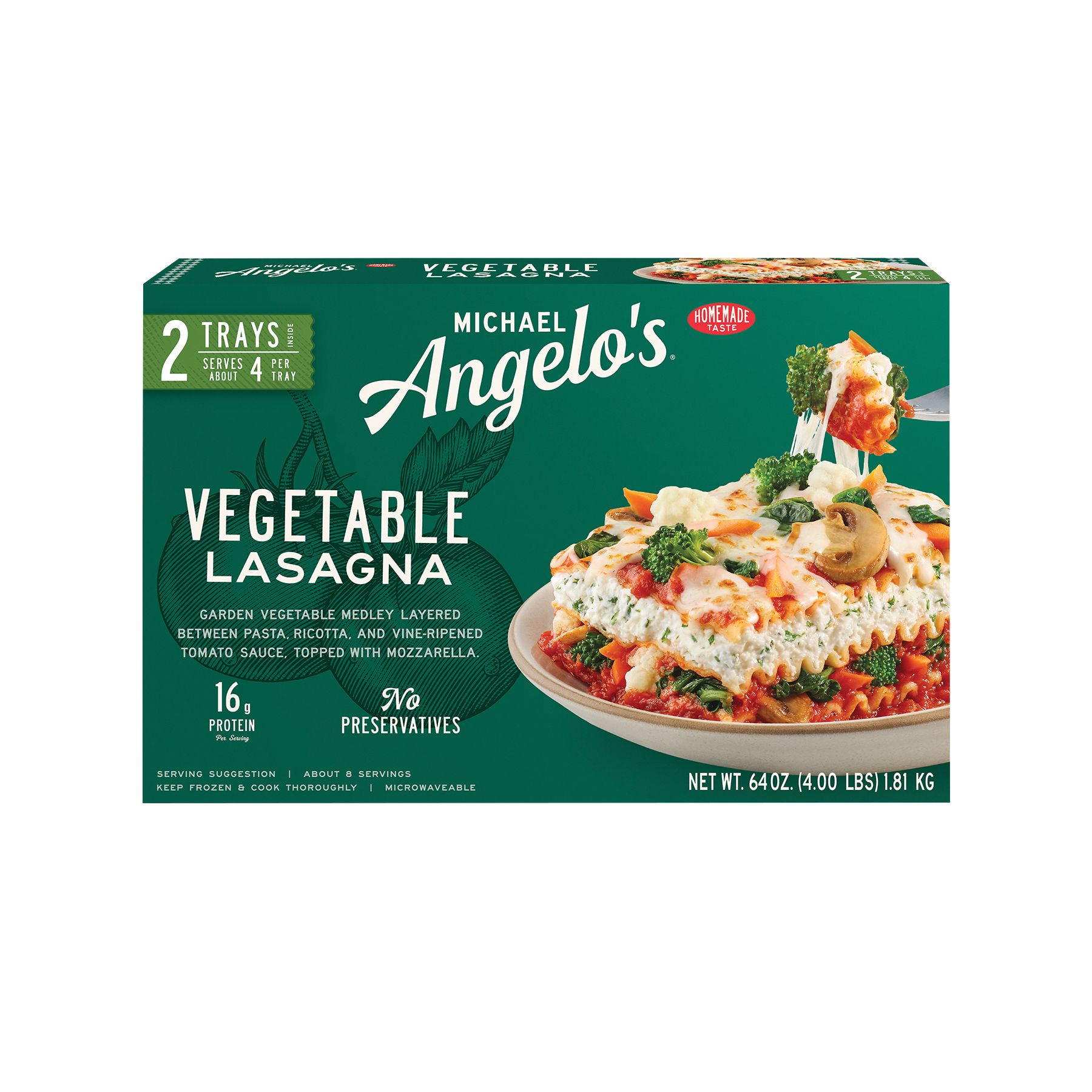 Michael Angelo's Vegetable Lasagna features a garden vegetable medley of cauliflower, carrots, broccoli, spinach and mushrooms layered between pasta, ricotta and vine-ripened tomato sauce, topped with mozzarella and Romano. Enjoy the homemade taste of this classic Italian recipe, made with wholesome simple ingredients and no preservatives! All of Michael Angelo's recipes were handed down from their Nonna Foti, who grew up in Sicily. She didn't use fillers. She didn't use anything that wasn't available in her pantry... and neither does Michael Angelo's.