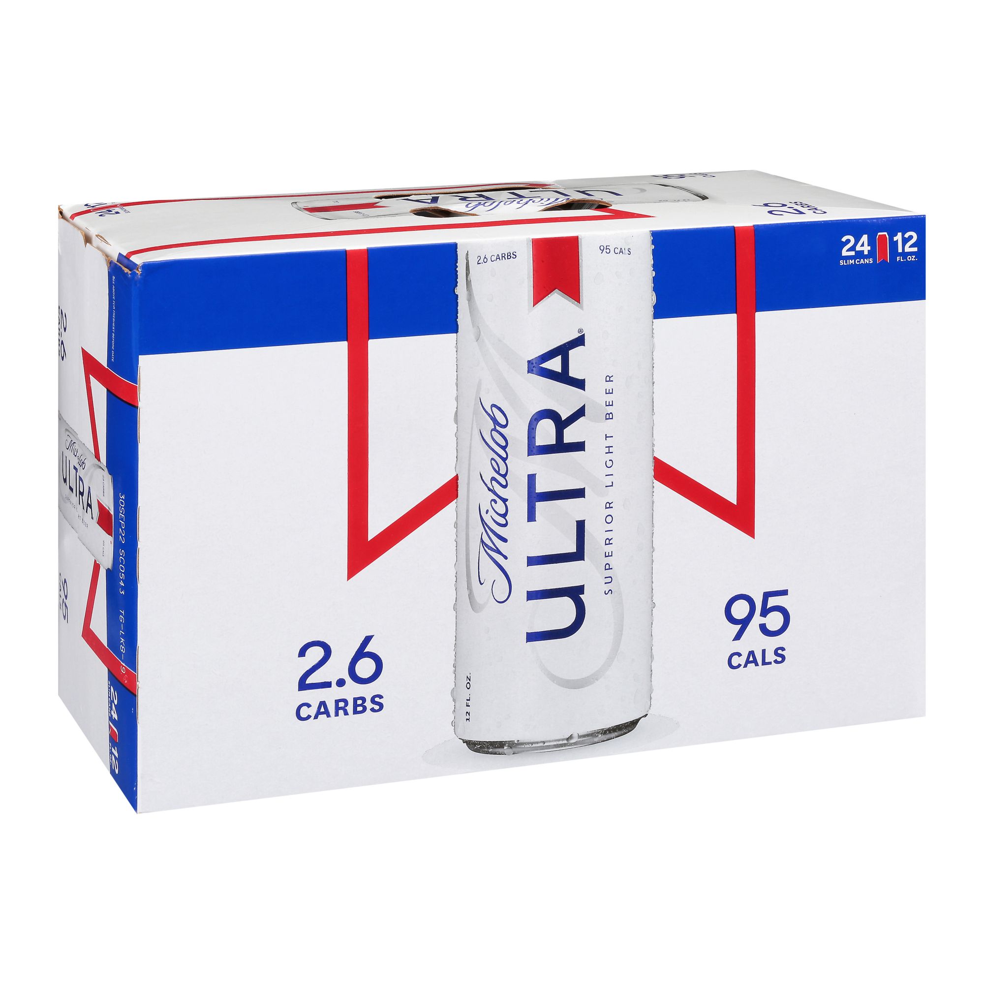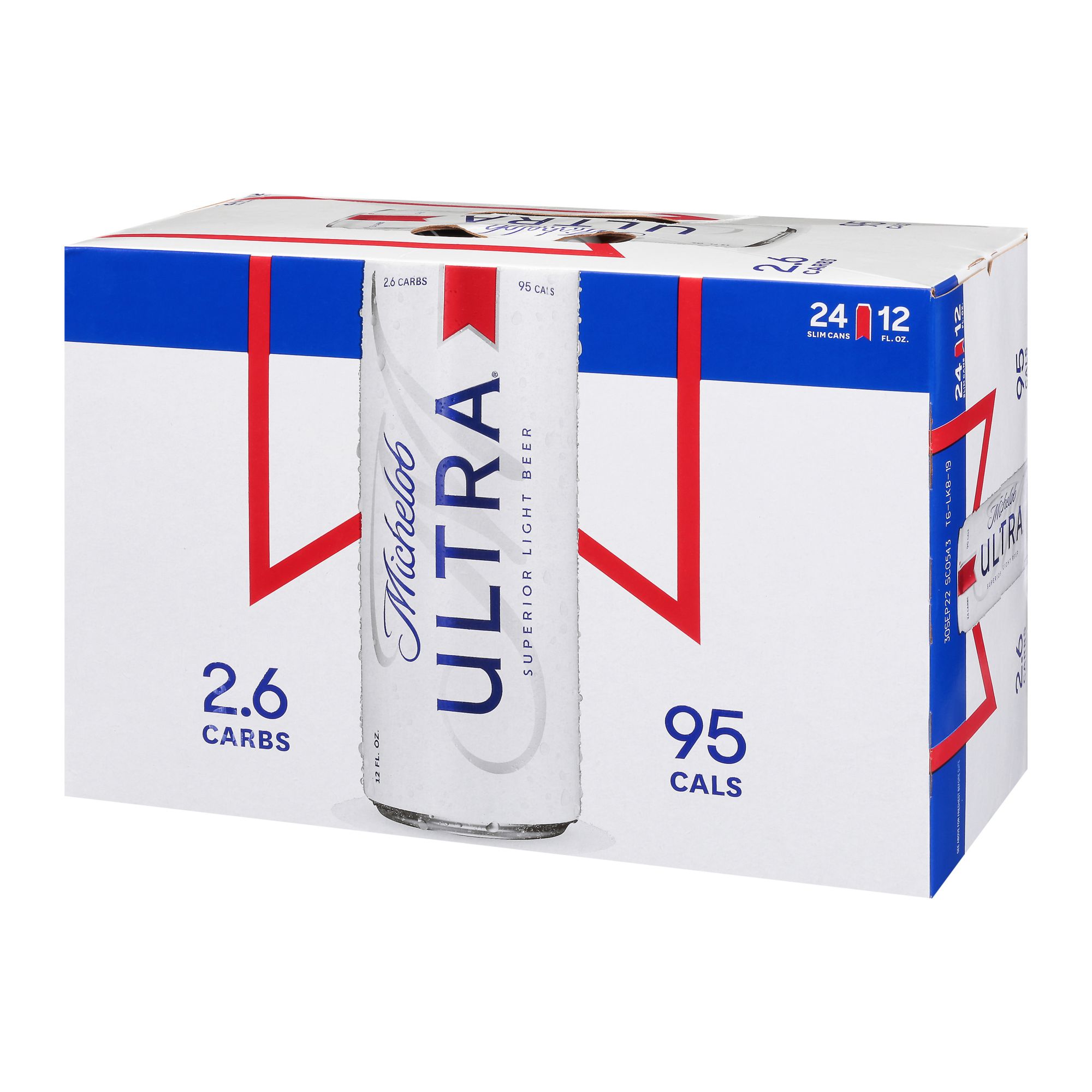 2.6 carbs. 95 cals. Enjoy responsibly. www.michelobuttra.com. tapintoyourbeer.com. Questions/Comments Call: 1-800-342-5283. www.michelobultra.com. Thirsty for more info? tapintoyourbeer.com. Sustainable Forestry Initiative: Certified sourcing. www.sfiprogram.org. Michelob Ultra supports the sustainable forestry initiative by obtaining packaging materials used in this carrier from certified sources, because they believe in managing our forests for future generations. Please recycle.