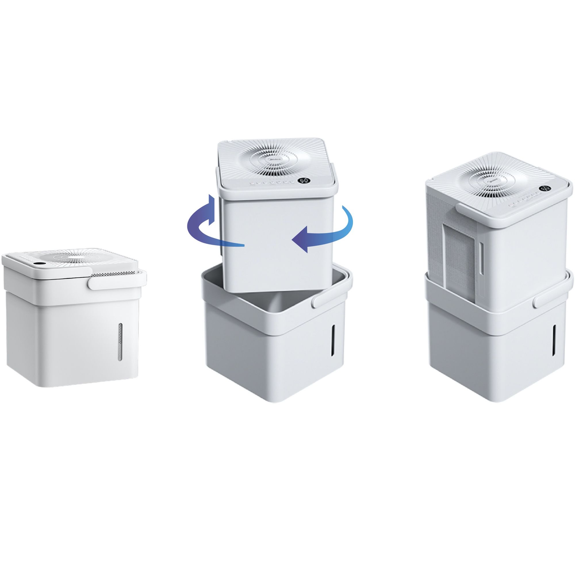 Lift-and-Twist Design: world's first extendable dehumidifier offers unparalleled flexibility-operate in extended or nested form Smaller Form, Bigger Capacity: up to 3x larger water tank allows the Midea Cube to operate up to 3x longer than a conventional dehumidifier. You can enjoy more time without the hassle of emptying the water tank 4500 sq. ft. of Coverage: the dehumidifier is able to collect 50-pint (similar to 70 pint-2012 DOE) of water a day and adjust humidity from 35% to 85%, perfect for use in the basement, bathrooms, bedroom, or crawlspace Set It and Forget It: versatile, the no-bucket option provides more flexibility to remove moisture. You can remove the water tank and place the unit above the sink using the included drain hose, or position it over a floor drain, near a window or door Compact Design: the nested design means you can easily find a place to store the unit when the space becomes dry, or extend it to its full capacity whenever you need it. Perfect for bedrooms, living room or basement Includes Midea cube dehumidifier