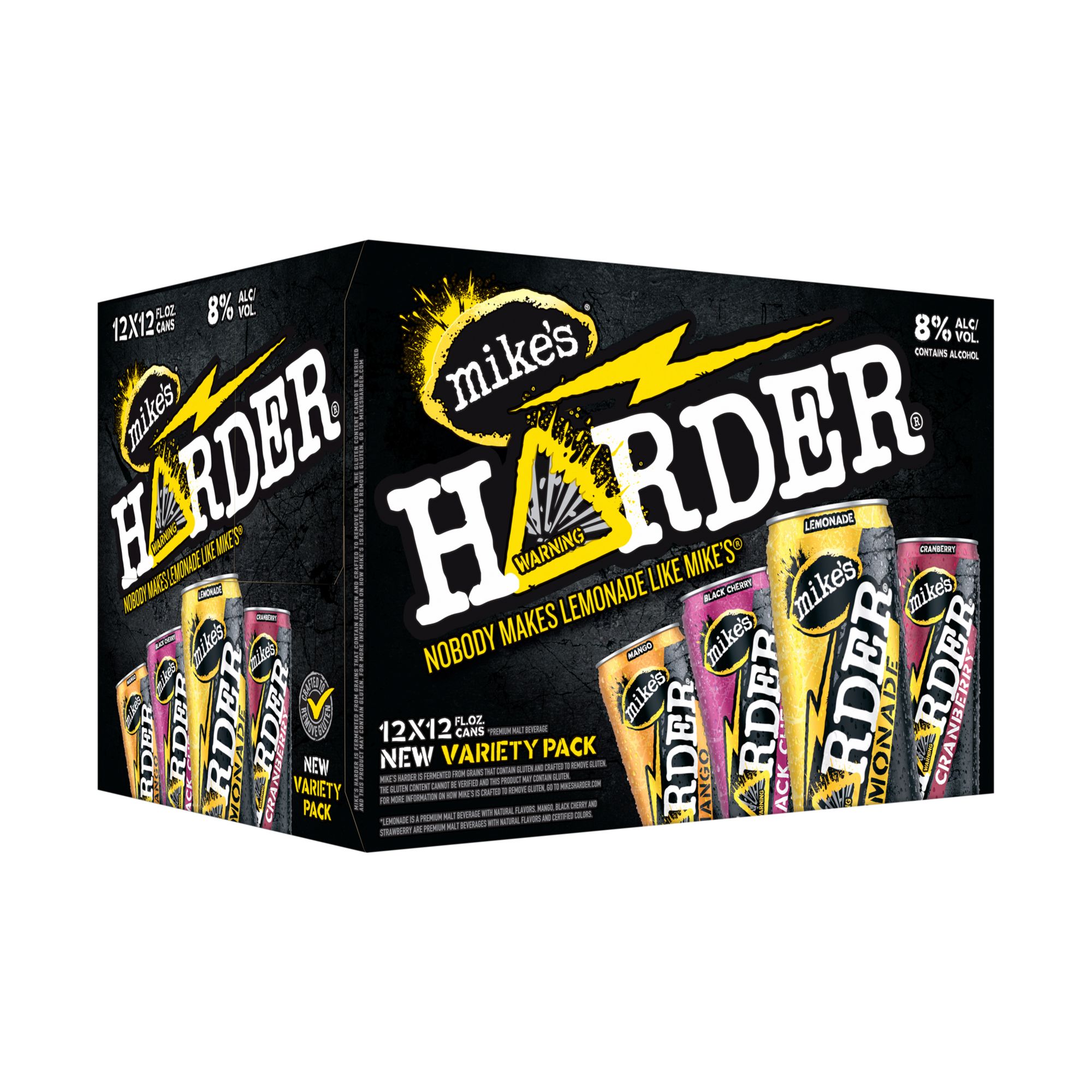 Mike's Harder Variety 12 pack contains three cans of Lemonade, three cans of Black Cherry, three cans of Mango and three cans of Cranberry. Lemonade is a premium malt beverage with natural flavors, mango, black cherry and cranberry are premium malt beverages with natural flavors and certified colors. A strong opinion is hard to find. Give us yours at mikesHARDER.com. Mike's Harder is fermented from grains that contain gluten and crafted to remove gluten. The gluten content cannot be verified and this product may contain gluten. Nobody makes lemonade like Mike's. Crafted remove gluten. Mike's is hard. So is prison. mikesHARDER.com. For more information on how Mike's is crafted to remove gluten, go to mikesharder.com. Please recycle. 8% alc./vol. 16.